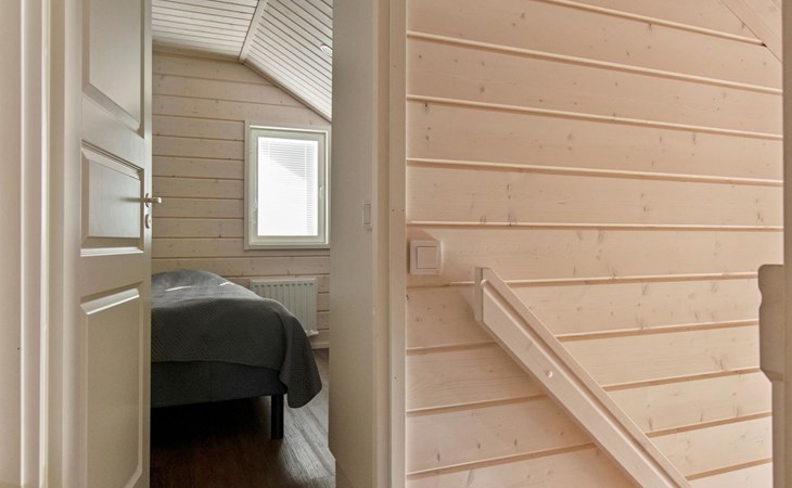 Upstairs there are two bedrooms, one with 2 beds. Other bedroom has two beds, one bed is 140 cm wide. WC and balcony.