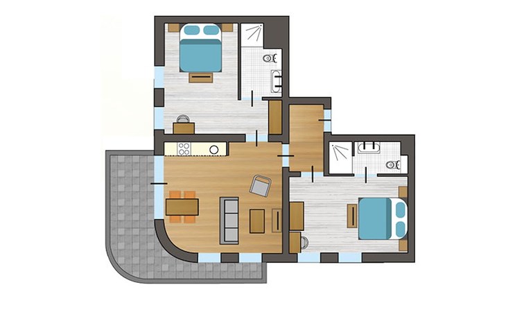 In einem der Schlafzimmer befindet sich ein Doppelbett, im anderen 2 Einzelbetten. Darüber hinaus ist jedes Schlafzimmer mit Tresor, Fernseher, Kleiderschrank und Schreibtisch ausgestattet. Beide Badezimmer verfügen über Dusche, Toilette und Doppelwaschbecken mit Föhn.