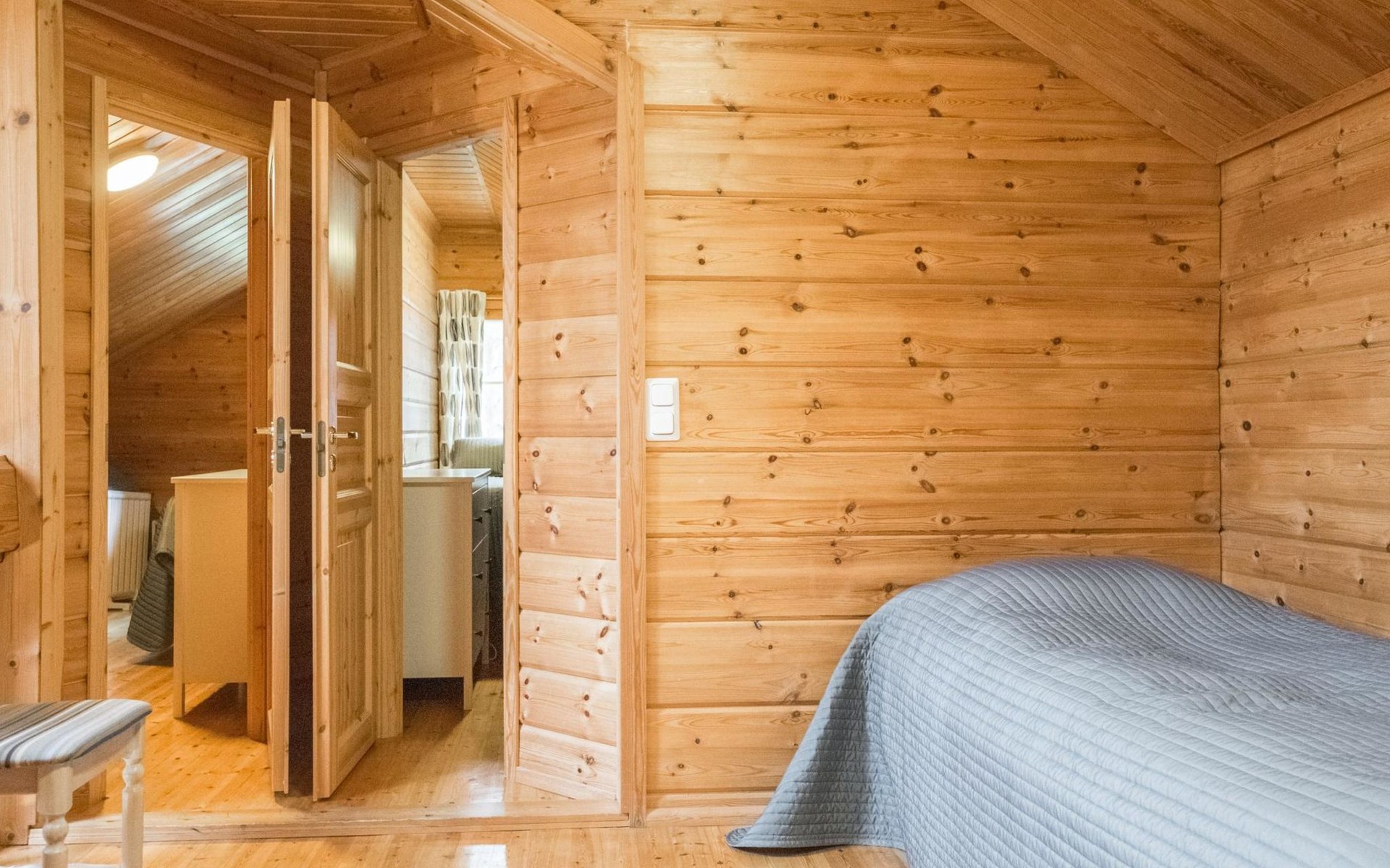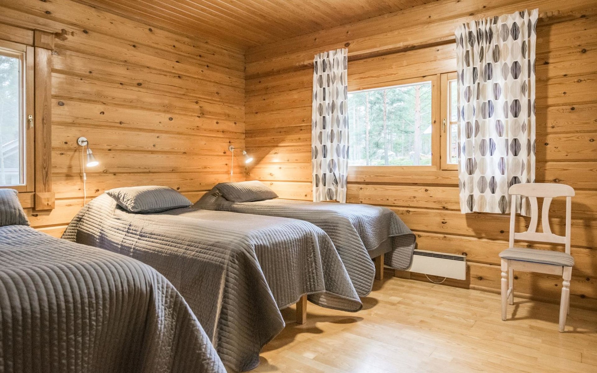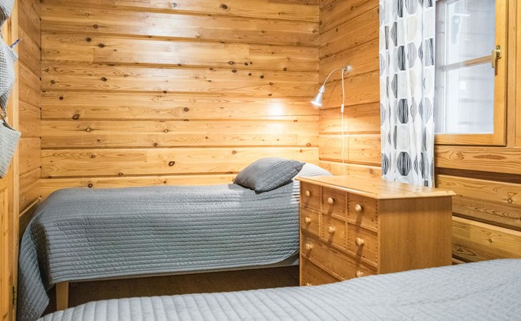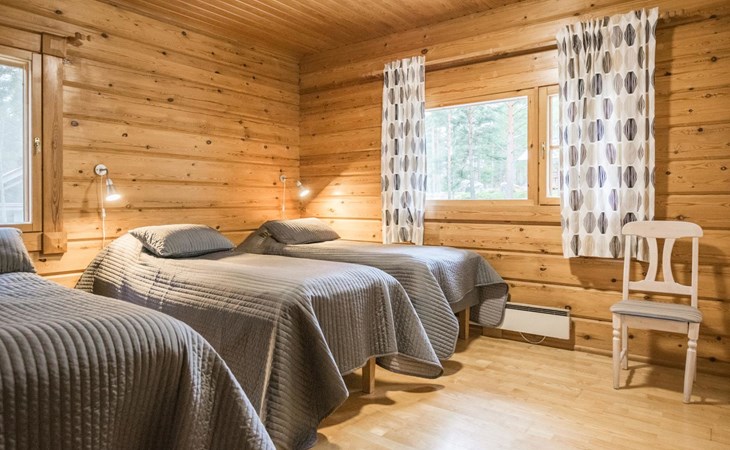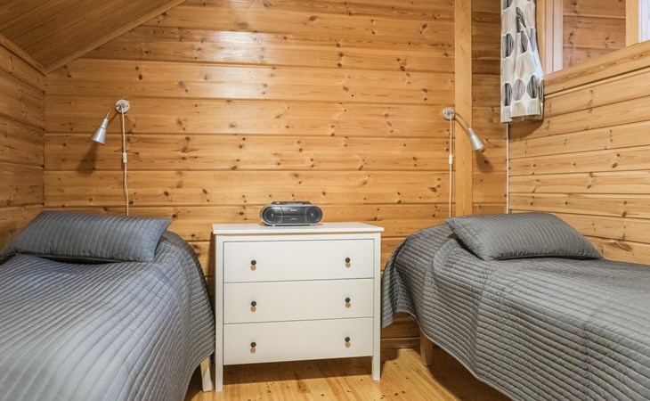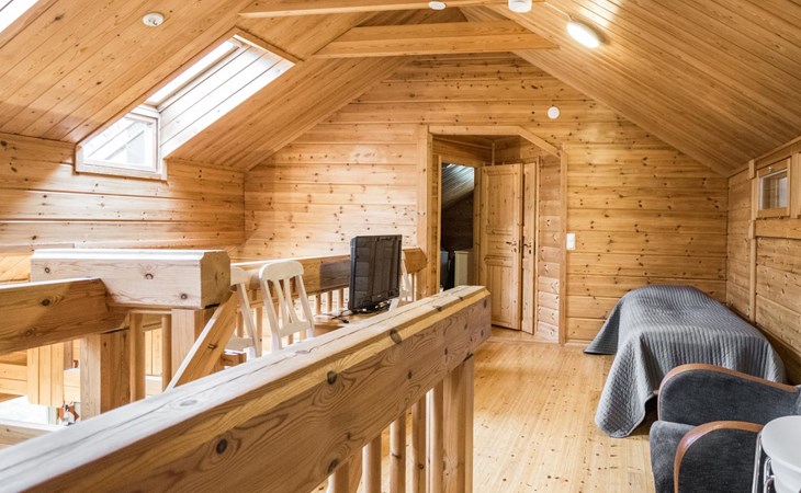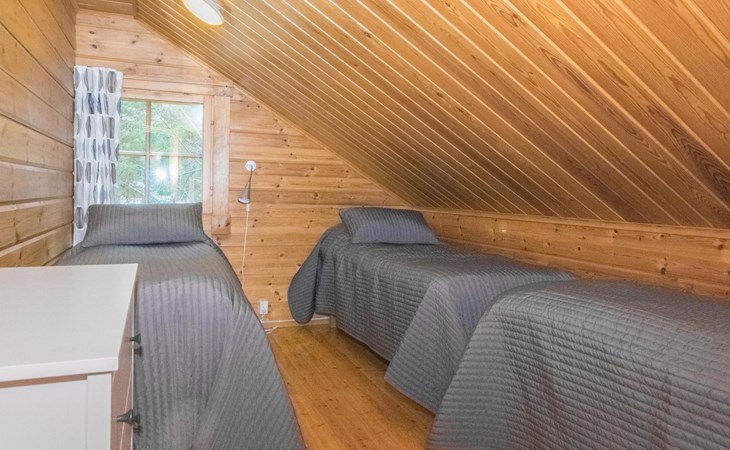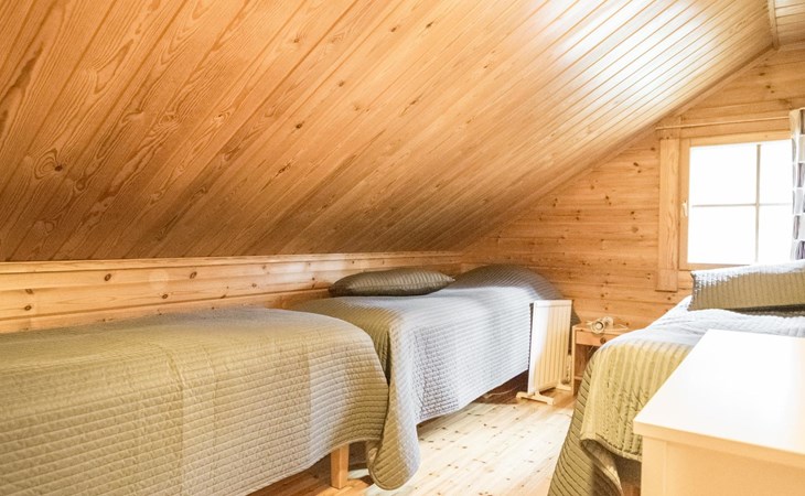On the ground floor, two bedrooms, each with three beds. On the upper floor, three bedrooms. Upper floor bedroom 1: 2 beds, Bedroom 2: 3 beds, Bedroom 3: 3 beds. Additionally, one bed in the upper floor hall. The cabin has a total of 15 beds.