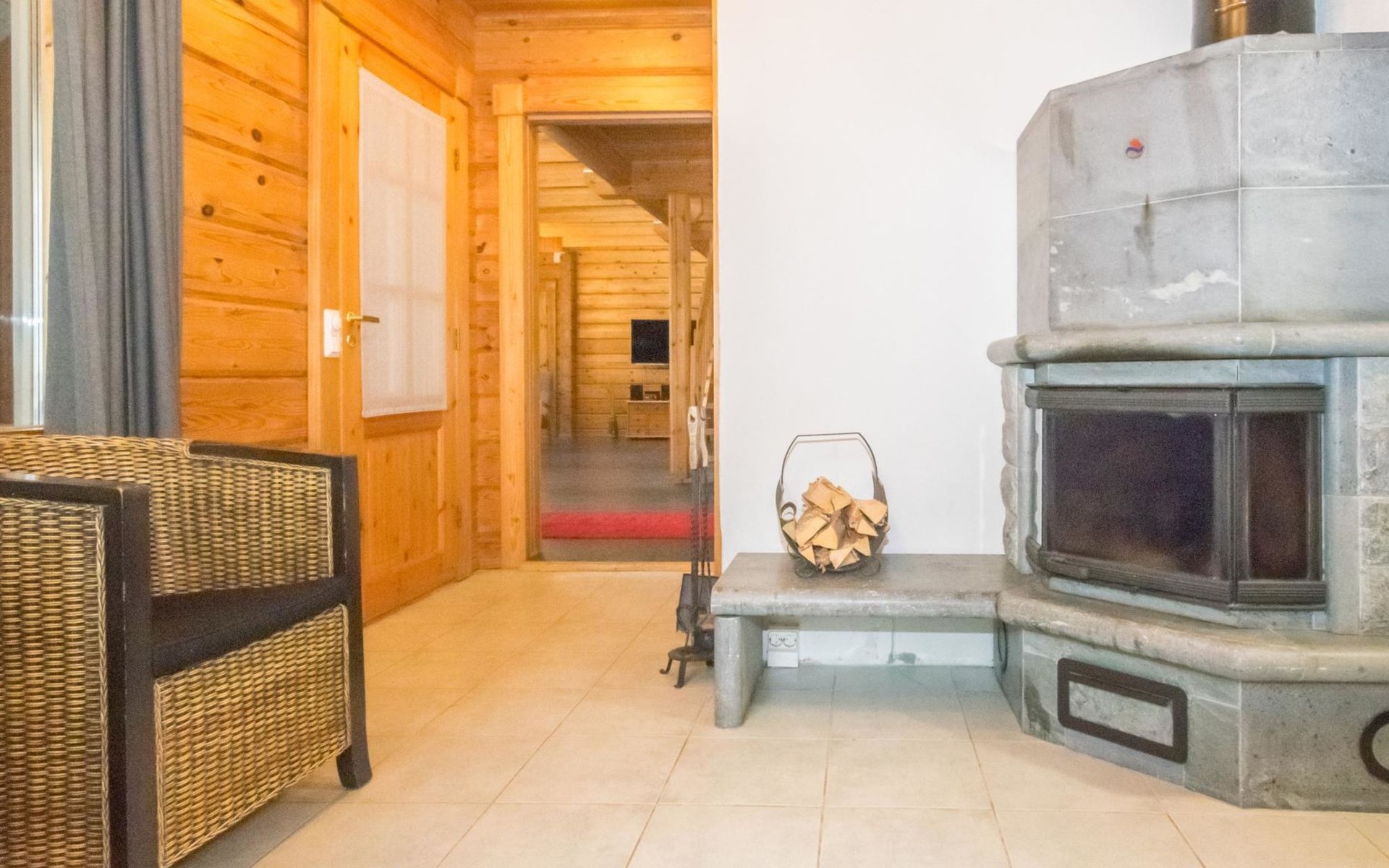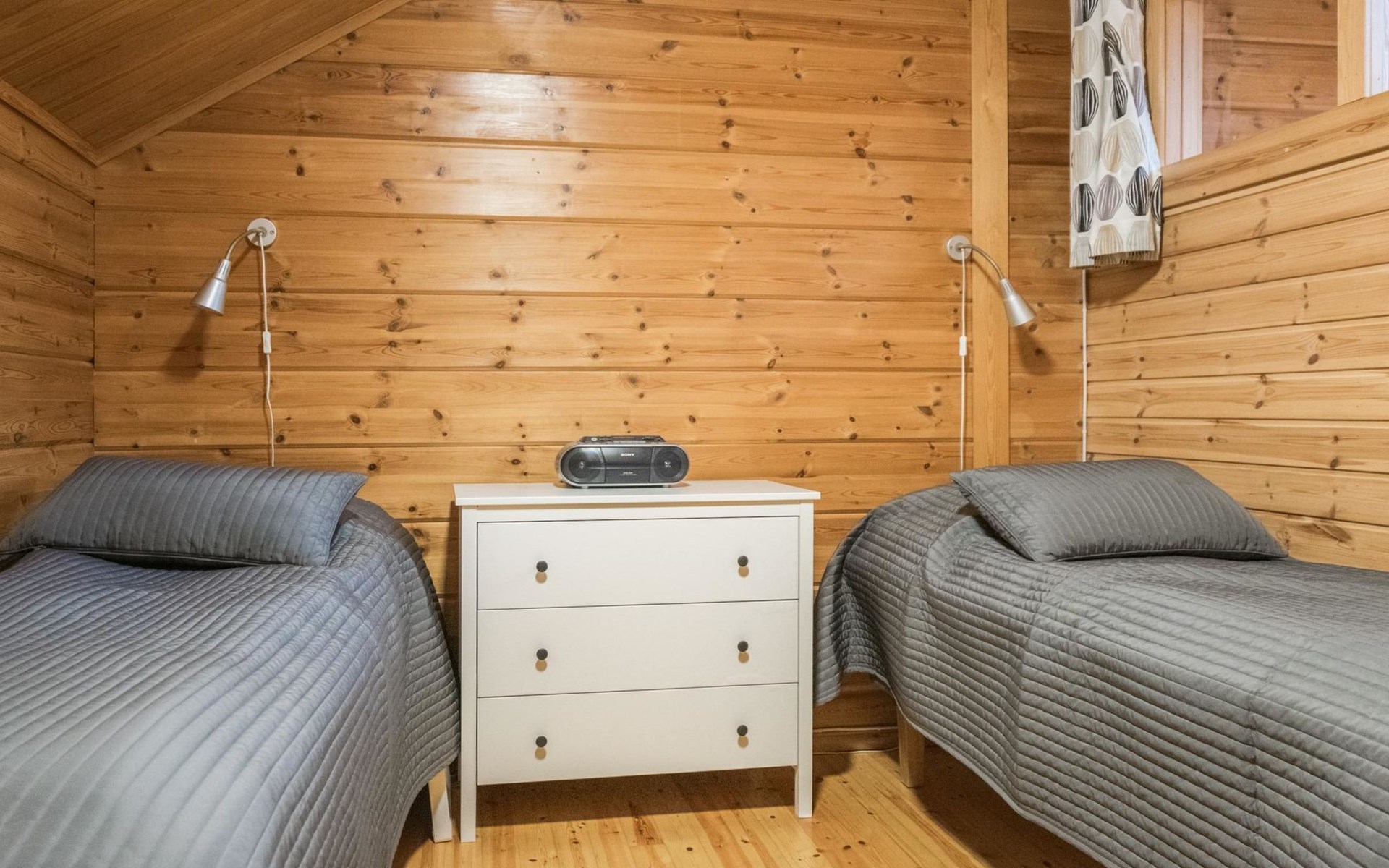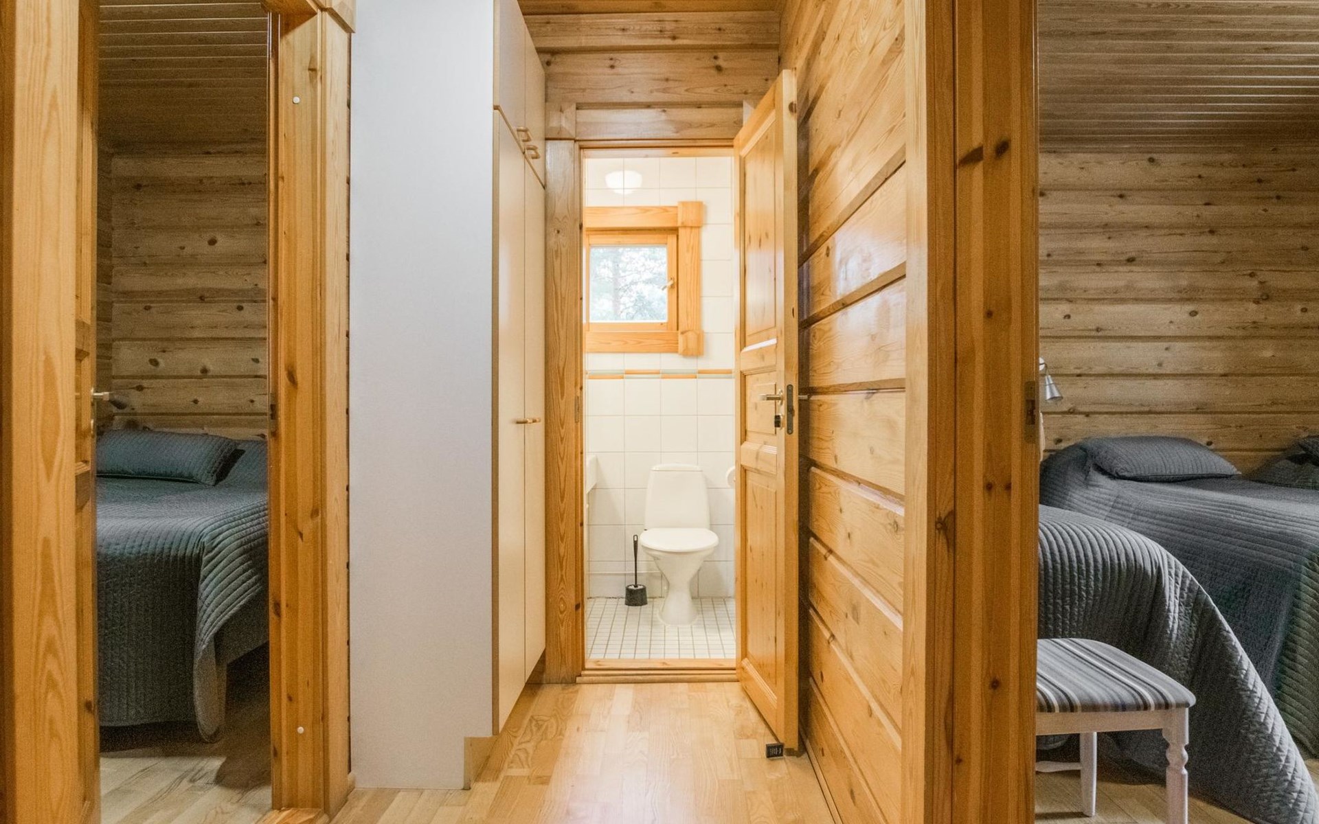 On the ground floor, two bedrooms, each with three beds. On the upper floor, three bedrooms. Upper floor bedroom 1: 2 beds, Bedroom 2: 3 beds, Bedroom 3: 3 beds. Additionally, one bed in the upper floor hall. The cabin has a total of 15 beds.