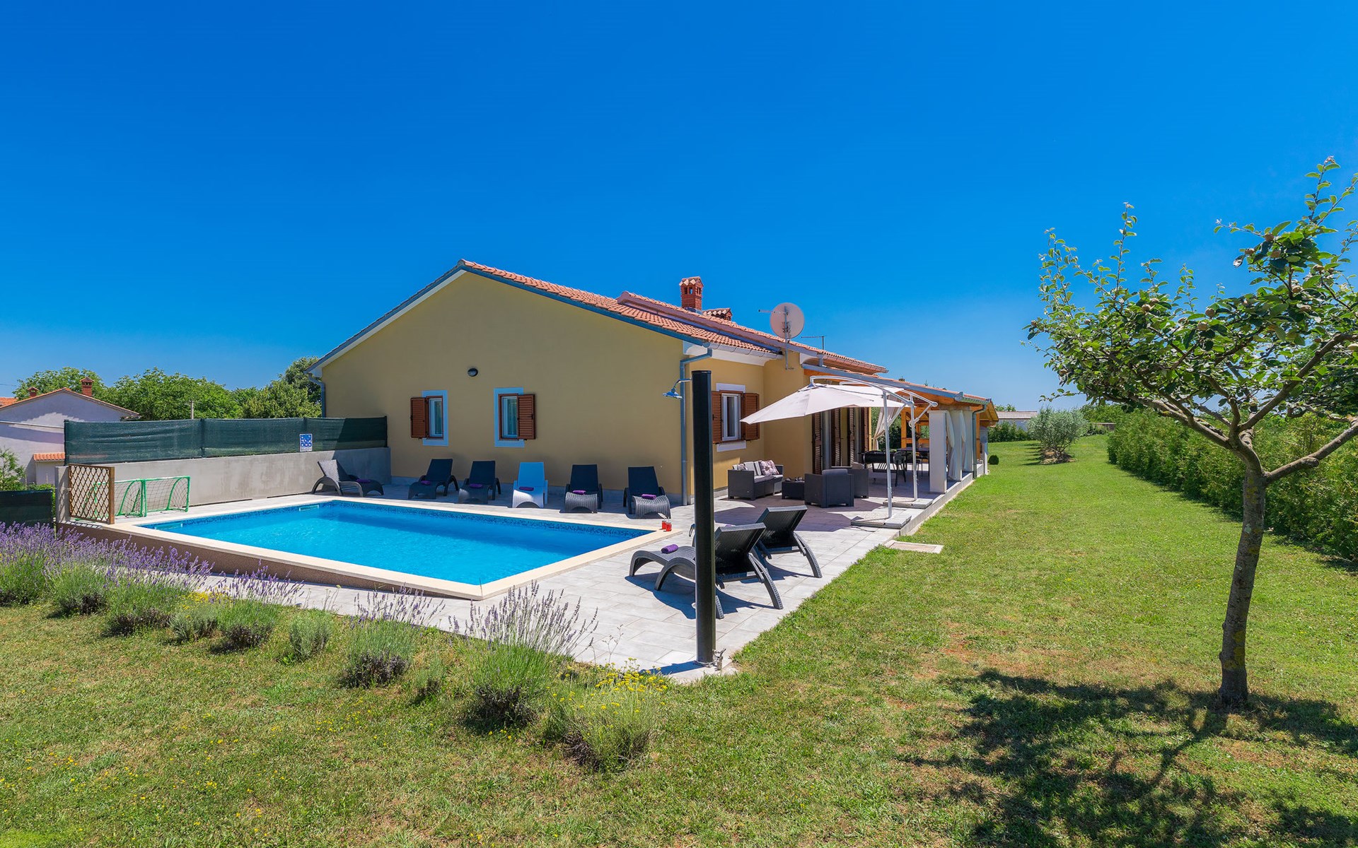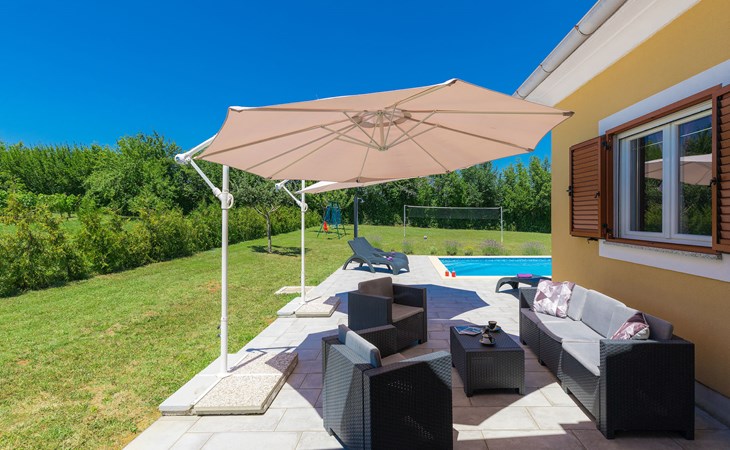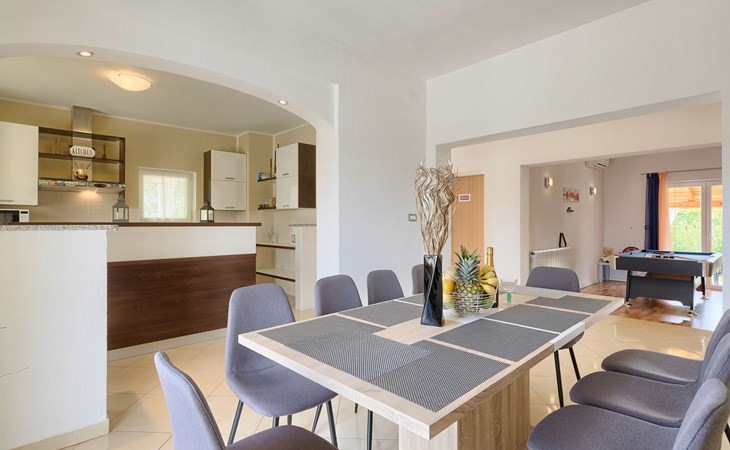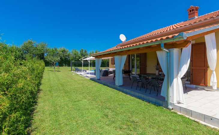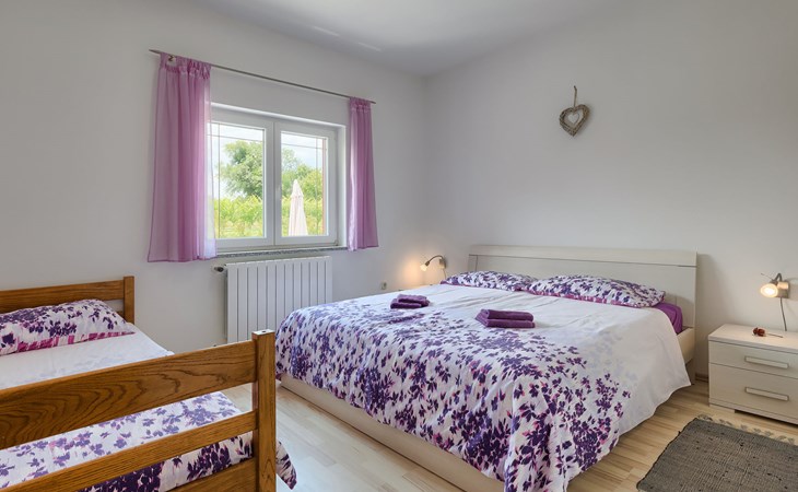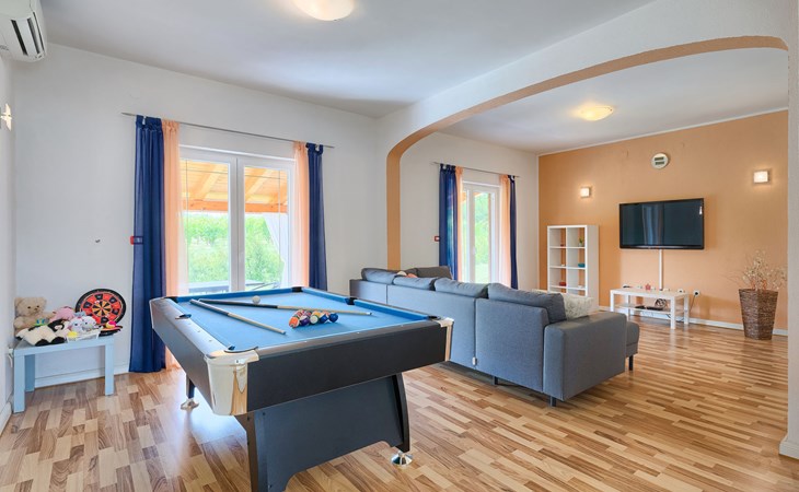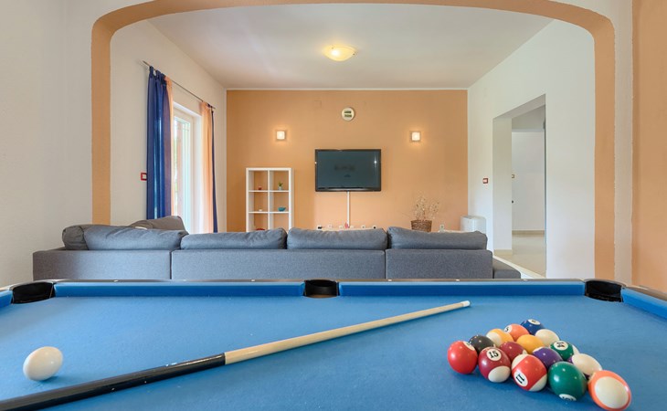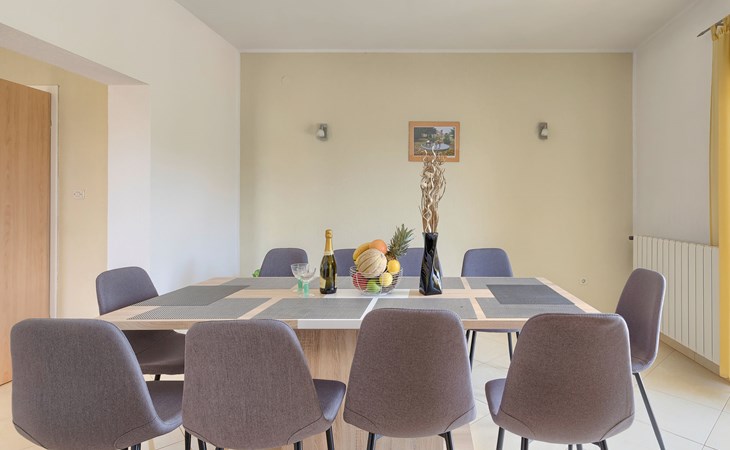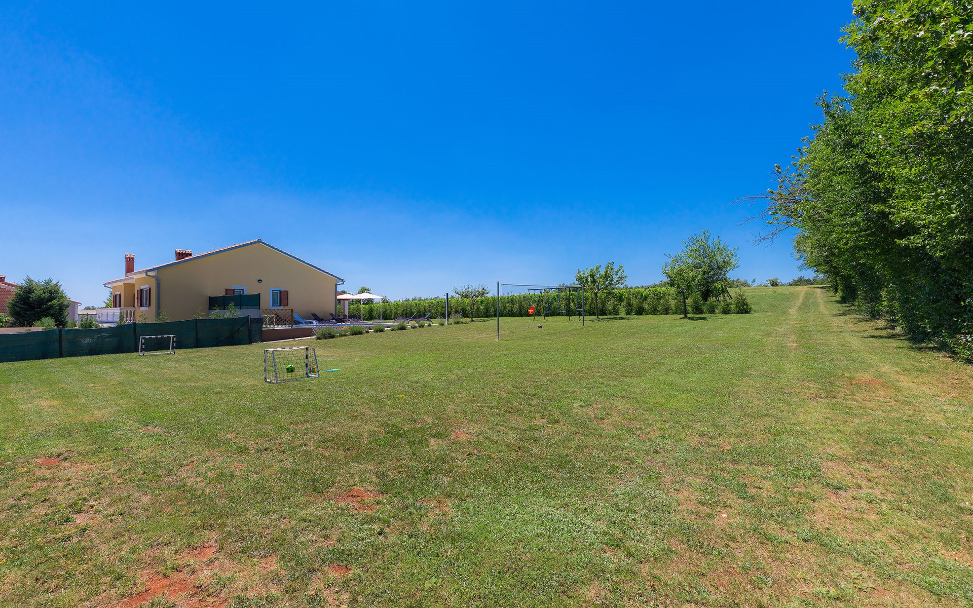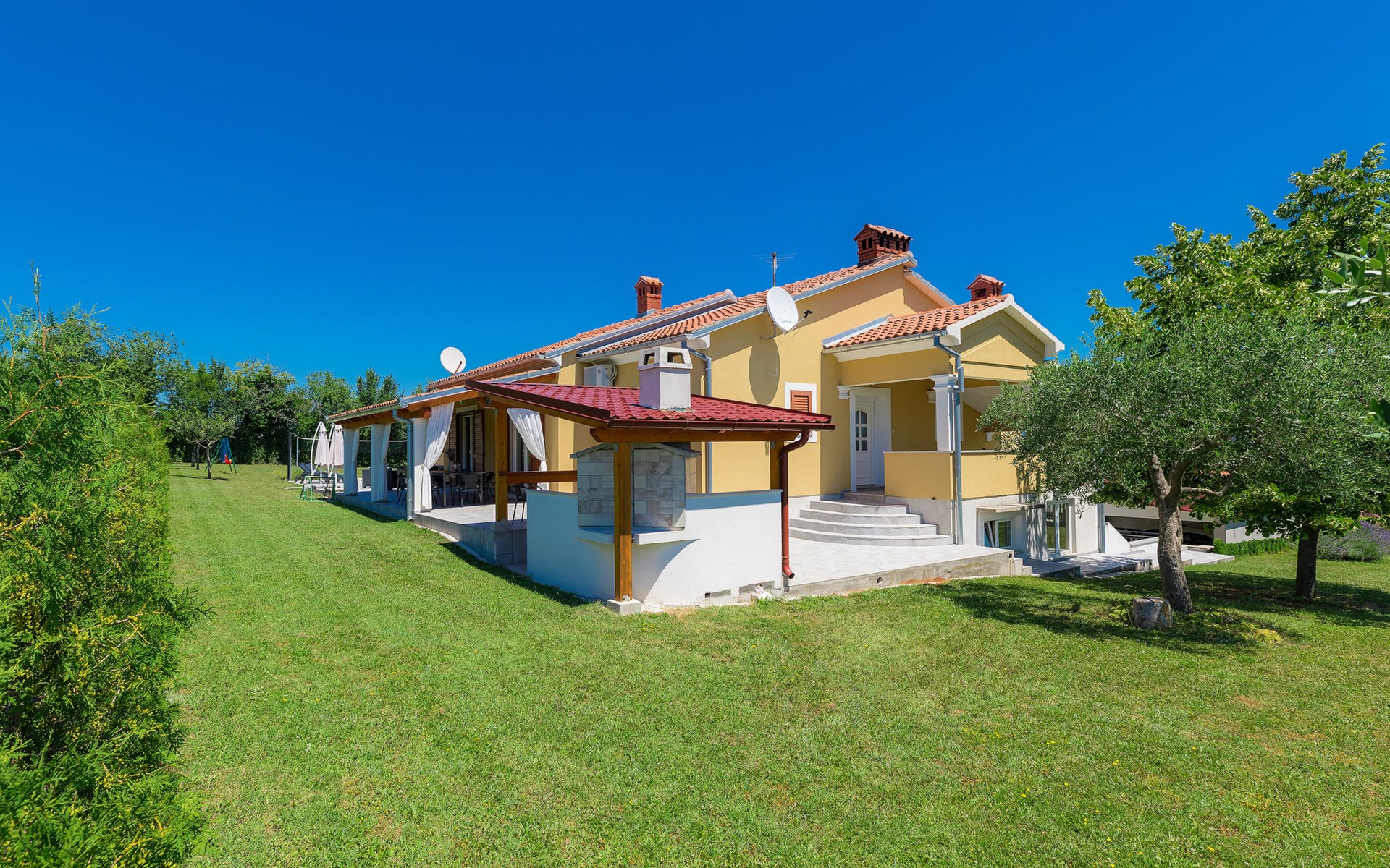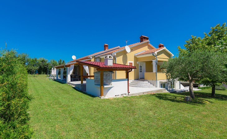 Einfamilienhaus "Melian", auf 2 Stockwerken. Im Weiler Jurićev Kal, 5 km vom Zentrum von Barban, sonnige Lage, 14 km vom Meer, im Grünen. Zur Alleinbenutzung: Grundstück 2'500 m2, schöner Garten mit Rasen und Pflanzen, Schwimmbad eckig (8 x 4 m, 140 cm tief, saisonale Verfügbarkeit: 15.Mai. - 01.Okt.) mit Innentreppe. Aussendusche, Volleyball, Badminton, Grillhaus, Kinderspielplatz (Schaukel). Im Hause: Internetzugang, Billard, Tischfussball, Einstellraum für Fahrräder, Waschmaschine. Parkplatz (für 2 Autos, überdacht) beim Haus auf dem Grundstück. Einkaufsgeschäft 5 km, Supermarkt 14 km, Restaurant 5 km, Café 5 km, Bushaltestelle 5.2 km, Kieselstrand 14 km. Tennis 25 km, Reitstall 13 km, Wanderwege ab Haus 100 m, Radweg 150 m. Das Haus besteht aus 2 Wohnungen vermietet als eine Einheit. .
