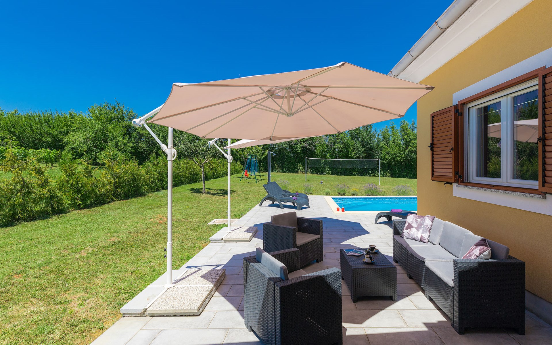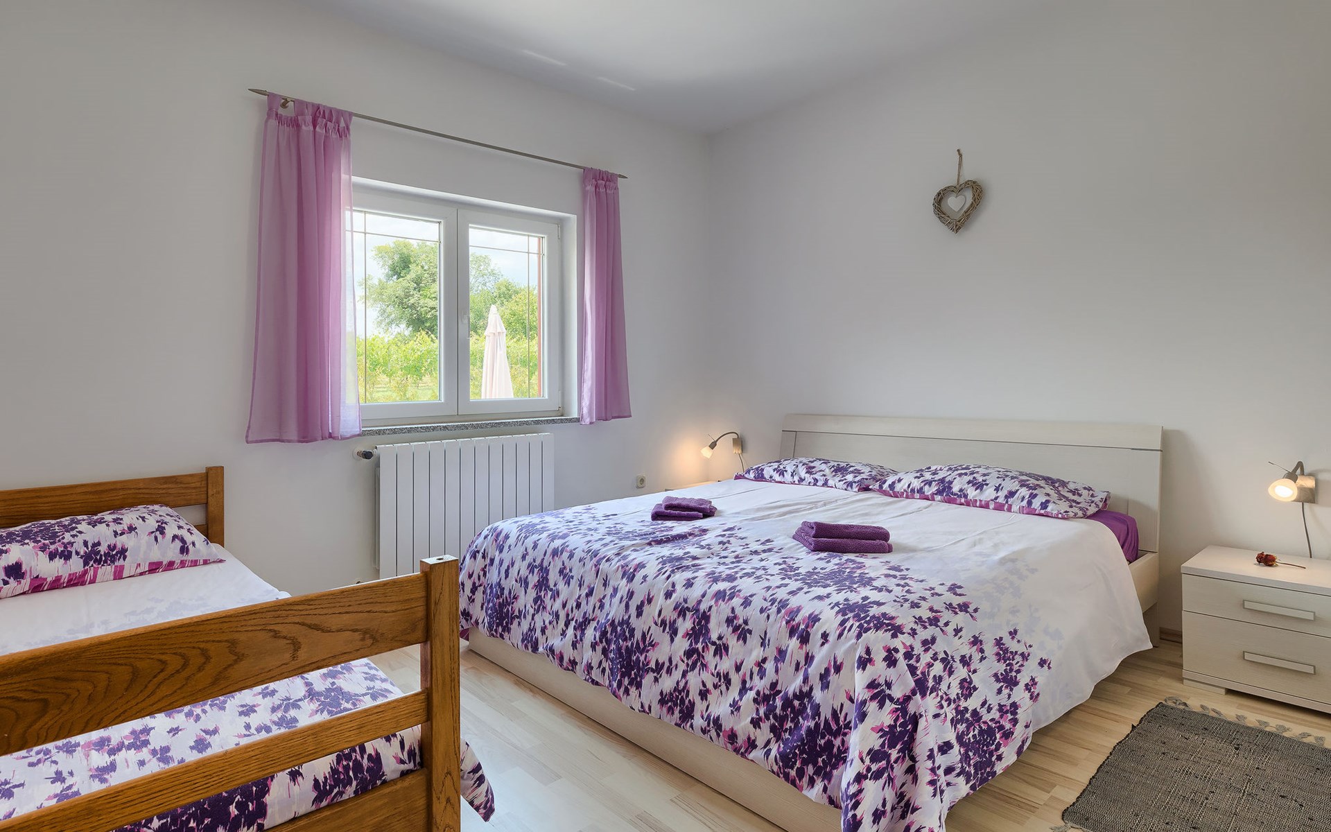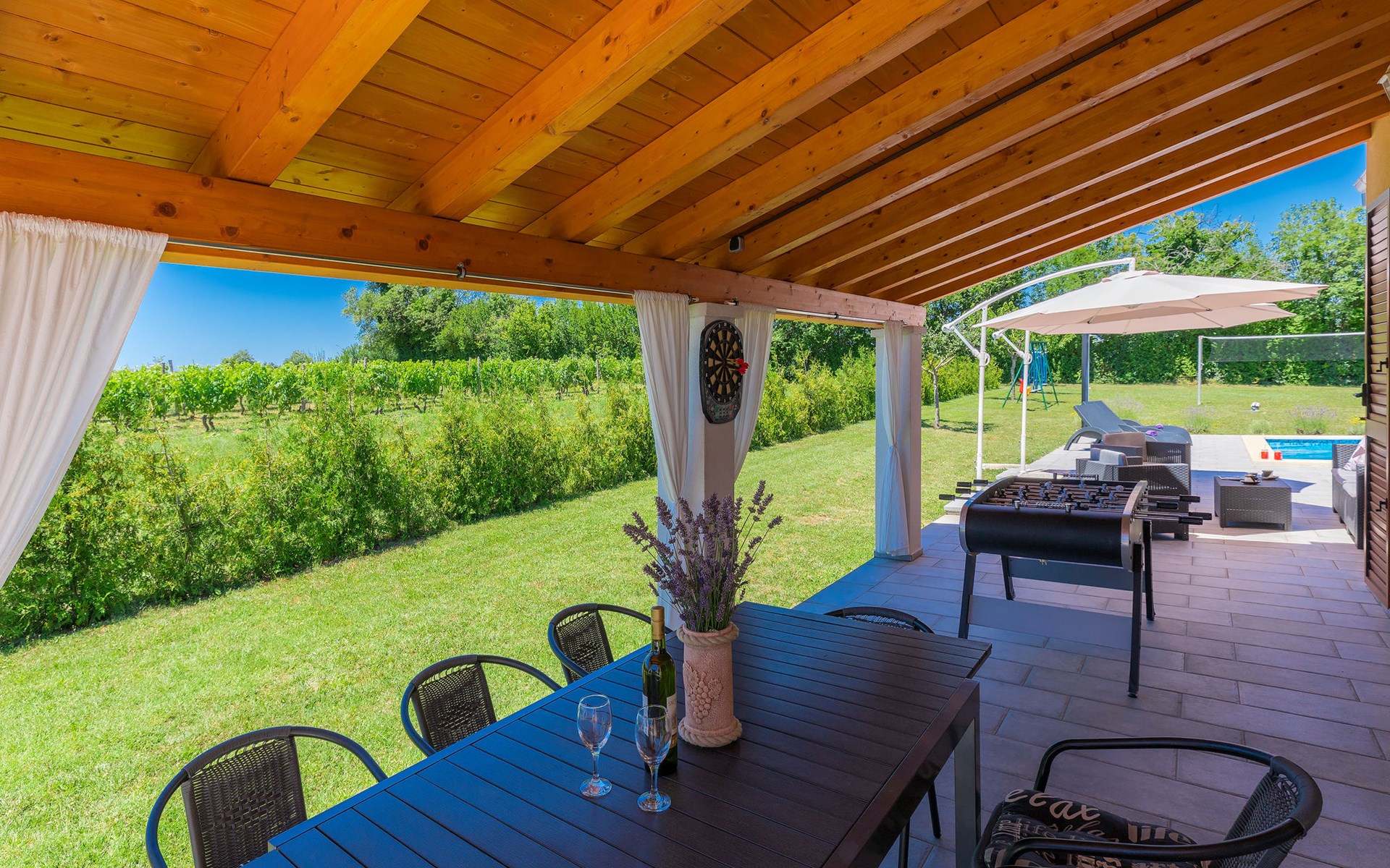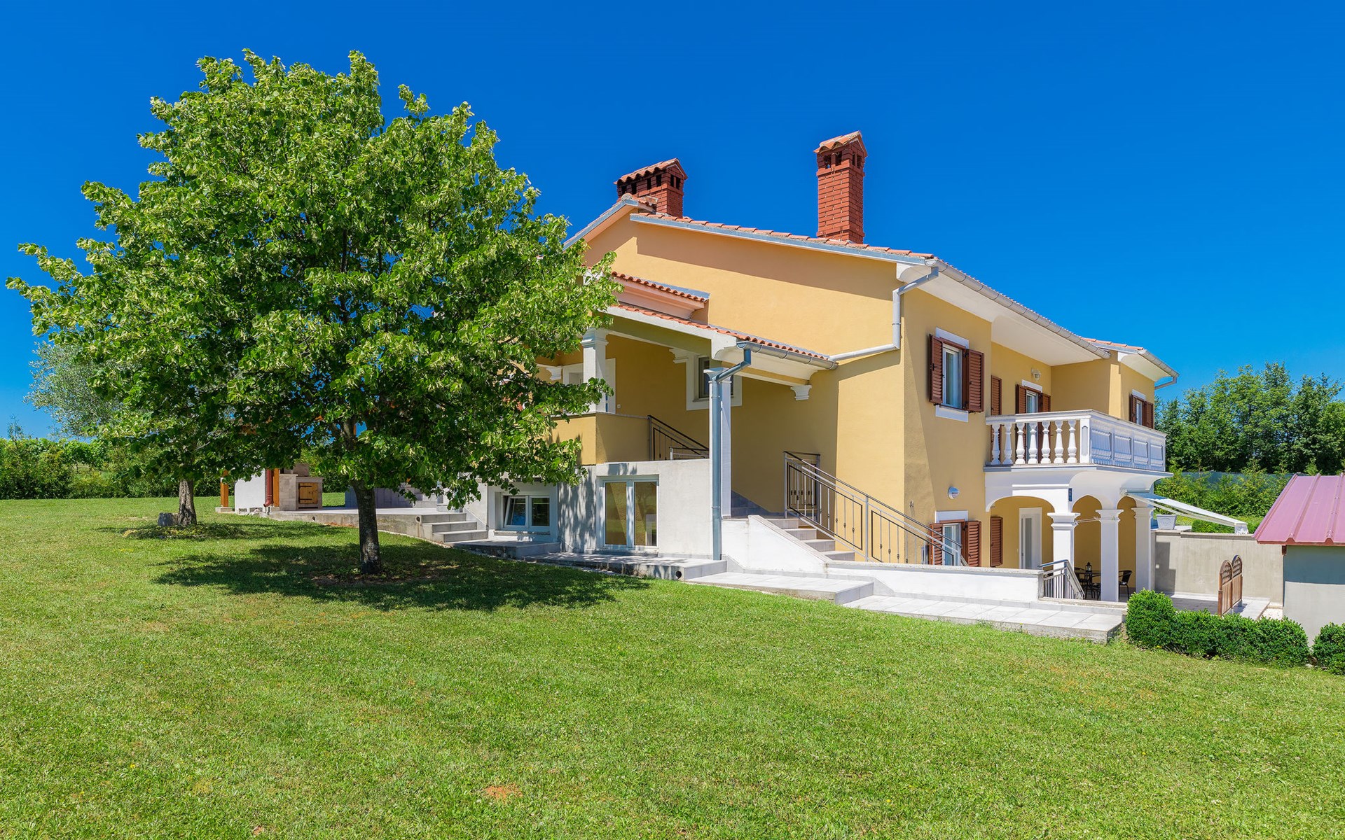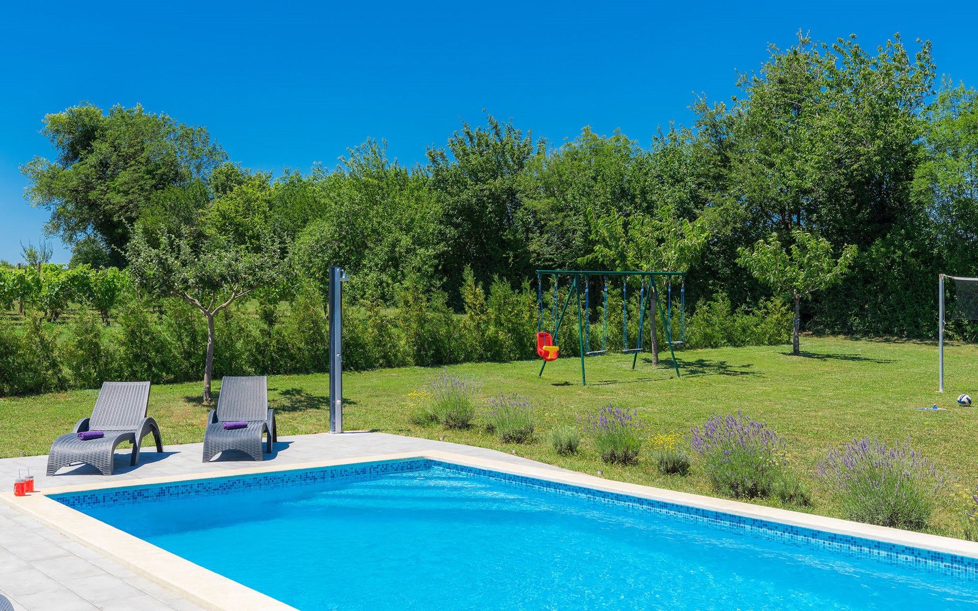 Einfamilienhaus "Melian", auf 2 Stockwerken. Im Weiler Jurićev Kal, 5 km vom Zentrum von Barban, sonnige Lage, 14 km vom Meer, im Grünen. Zur Alleinbenutzung: Grundstück 2'500 m2, schöner Garten mit Rasen und Pflanzen, Schwimmbad eckig (8 x 4 m, 140 cm tief, saisonale Verfügbarkeit: 15.Mai. - 01.Okt.) mit Innentreppe. Aussendusche, Volleyball, Badminton, Grillhaus, Kinderspielplatz (Schaukel). Im Hause: Internetzugang, Billard, Tischfussball, Einstellraum für Fahrräder, Waschmaschine. Parkplatz (für 2 Autos, überdacht) beim Haus auf dem Grundstück. Einkaufsgeschäft 5 km, Supermarkt 14 km, Restaurant 5 km, Café 5 km, Bushaltestelle 5.2 km, Kieselstrand 14 km. Tennis 25 km, Reitstall 13 km, Wanderwege ab Haus 100 m, Radweg 150 m. Das Haus besteht aus 2 Wohnungen vermietet als eine Einheit. .