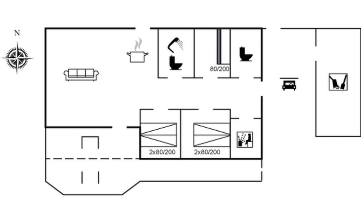 Einfamilienhaus, Baujahr 1974. 700 m vom Meer. Zur Alleinbenutzung: naturbelassenes Grundstück 2'500 m2. Aussendusche, Terrasse (32 m2). Im Hause: Sauna, Waschmaschine. Parkplatz beim Haus. Carport. Lebensmittelgeschäft 4 km. Golfplatz 700 m. Der Besitzer akzeptiert keine Jugendgruppen.