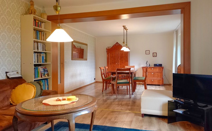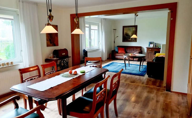 Kinderfreundliches, gemütliches Einfamilienhaus "Zum Koppelblick", auf 2 Stockwerken, Baujahr 1960, renoviert im Jahre 2023, umgeben von Bäumen und Feldern. Ausserhalb des Ortes, ruhige Lage, 2 km vom Waldrand, 3 km vom See. Zur Mitbenutzung: Grundstück 1'500 m2, grosser, gepflegter Garten 1'000 m2. Tischtennis, Grill, Feuerstelle (Sandkasten). In der Anlage: Sauna (extra). Waschmaschine (extra) (zur Mitbenutzung). Lebensmittelgeschäft 10 km, Restaurant 15 km, Bäckerei 2 km, Bushaltestelle "Hinrichshaben, Ziegelei" 500 m, Bahnstation "Neubrandenburg" 17 km, Freibad 27 km, Badesee 2 km. Golfplatz (9 Loch) 22 km, Tennis 18 km, Kinderspielplatz 300 m. Nahe gelegene Sehenswürdigkeiten: Burg Stargard 14 km, Neubrandenburg Konzertkirche 15 km. Bekannte Seen in der Umgebung sind gut erreichbar: Tollensesee 22 km, Feldberger Seenlandschaft 30 km. Auf dem Grundstück Tierhaltung. Bitte beachten: Der Besitzer wohnt auf dem gleichen Grundstück.