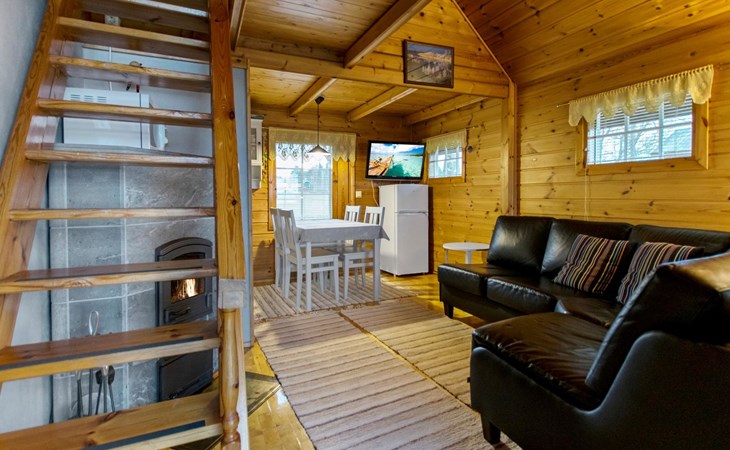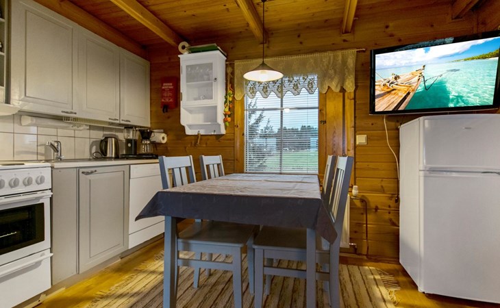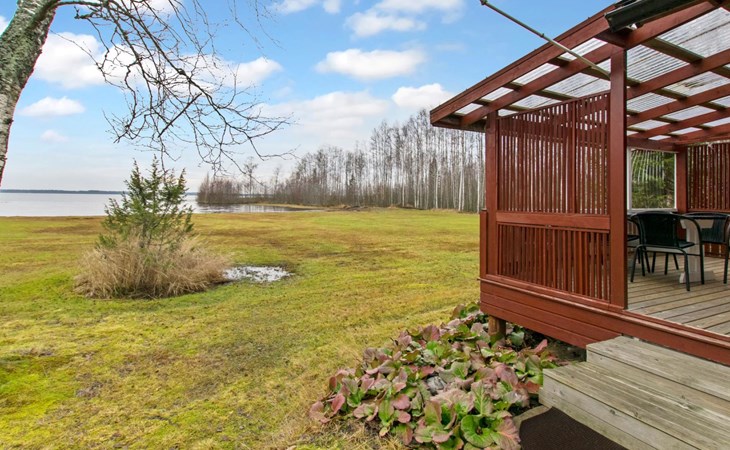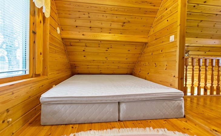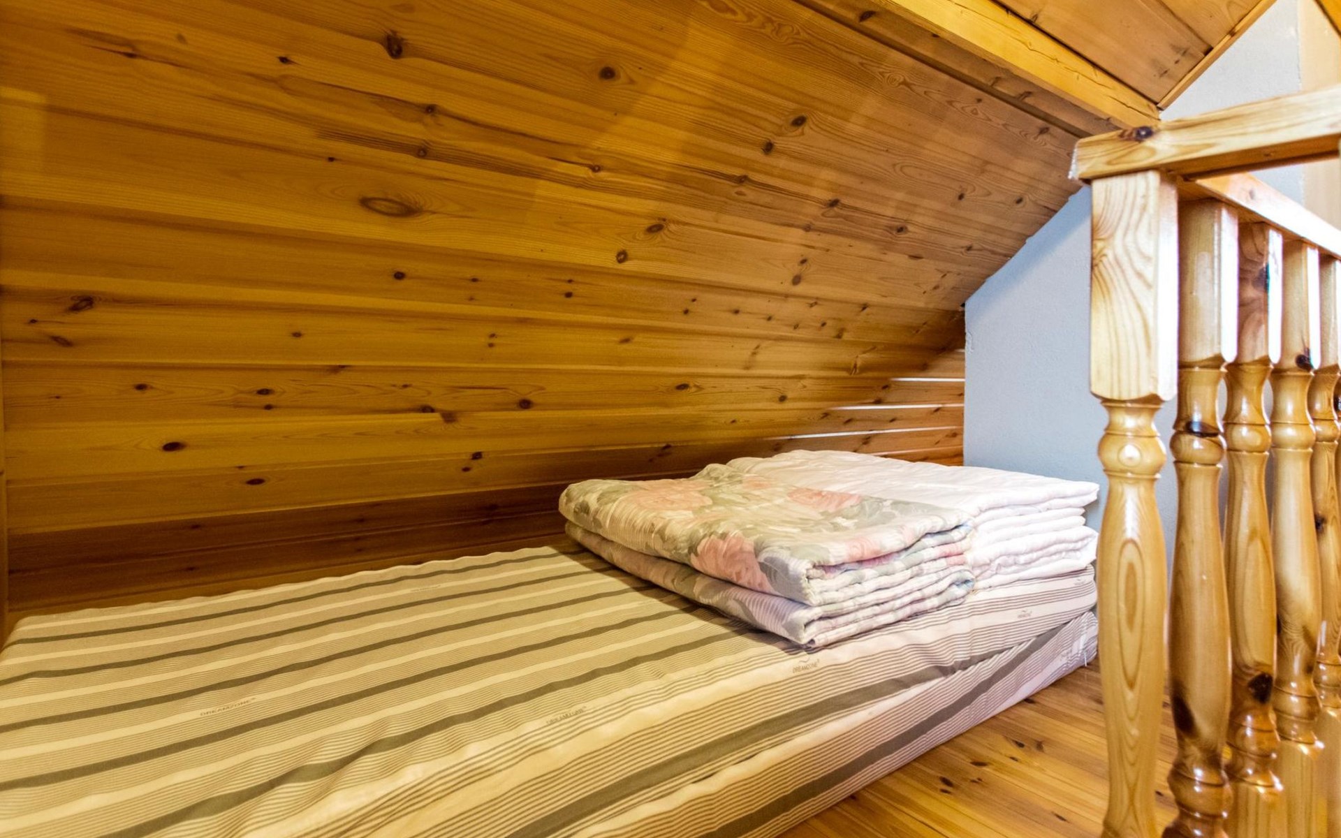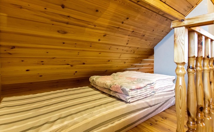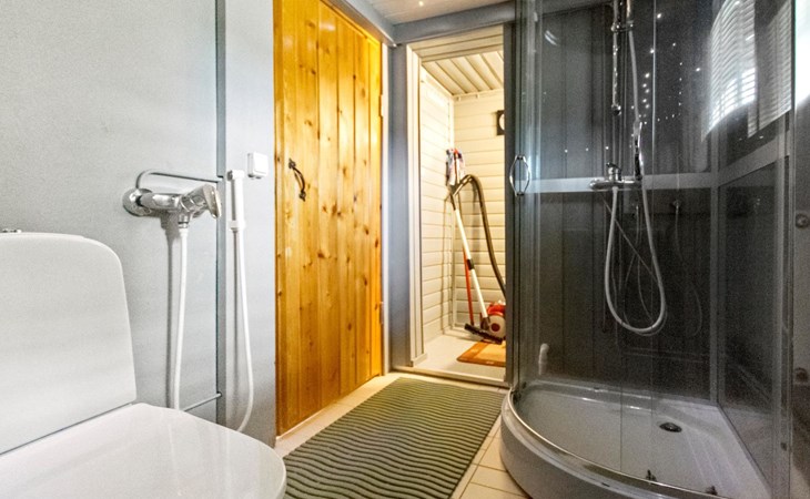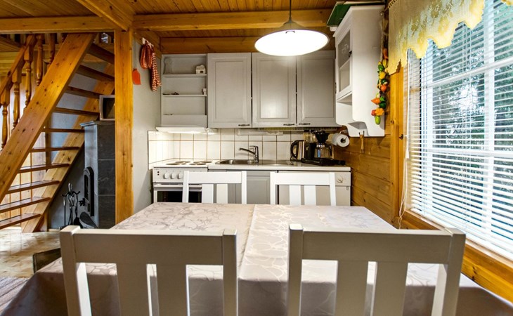 Log-built cabin (1994), spacious and partially glazed terrace, living room with heat reserving soapstone fireplace, living room/kitchen, sauna (wood-burning sauna stove) washroom with WC. On the upper floor, bedroom with low slope ceiling (160 x 200 cm spring mattress on the floor) and lobby (2 x 80 x 200 cm foam mattress on the floor). Wood storage and waste collection between cabins 15162 Kaunotar and 15163 Missi. The cottage is suitable for year-round use.