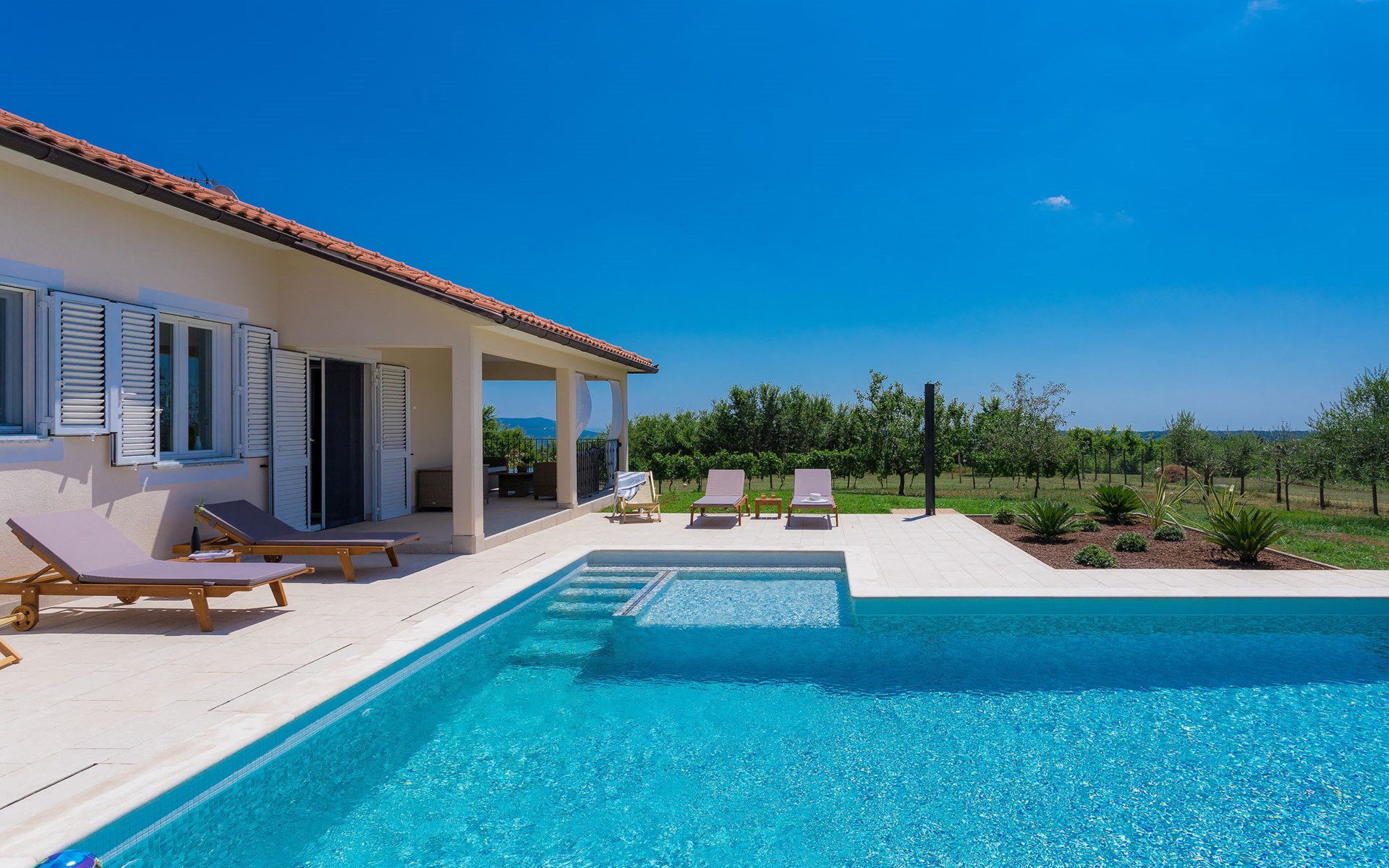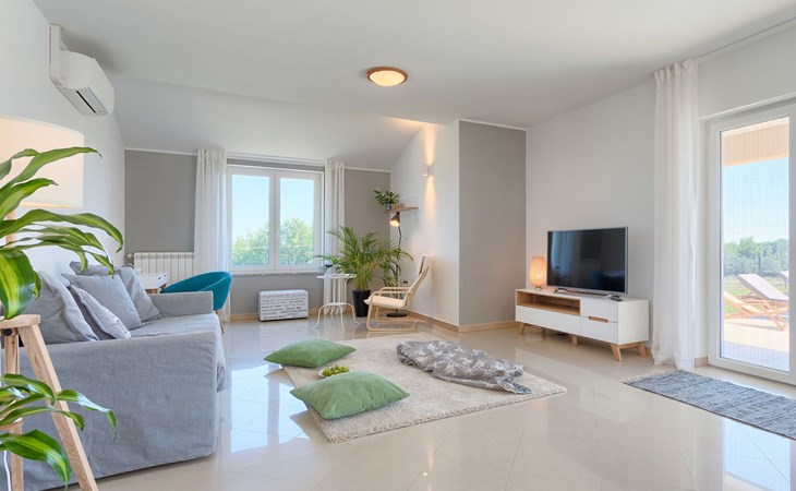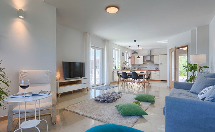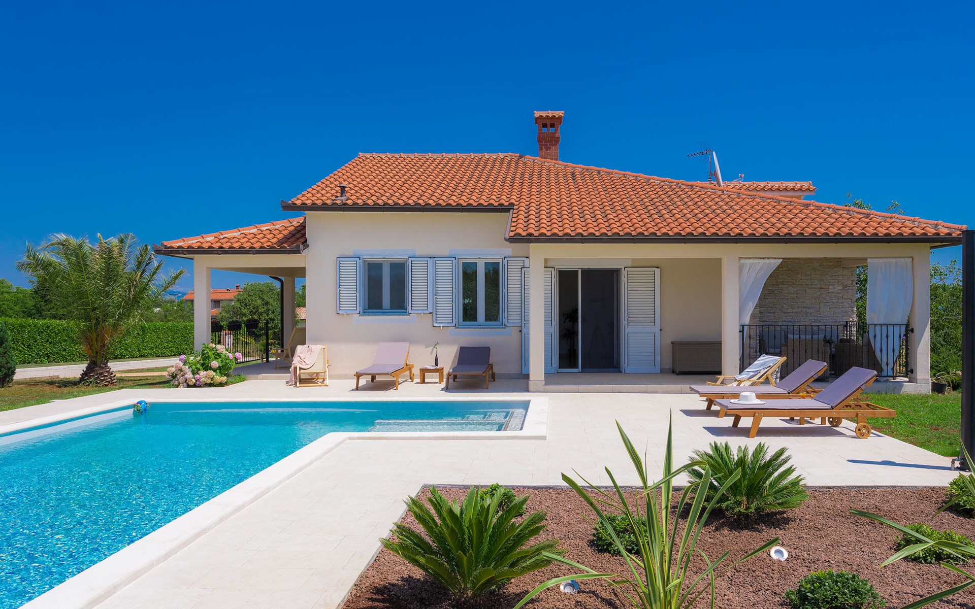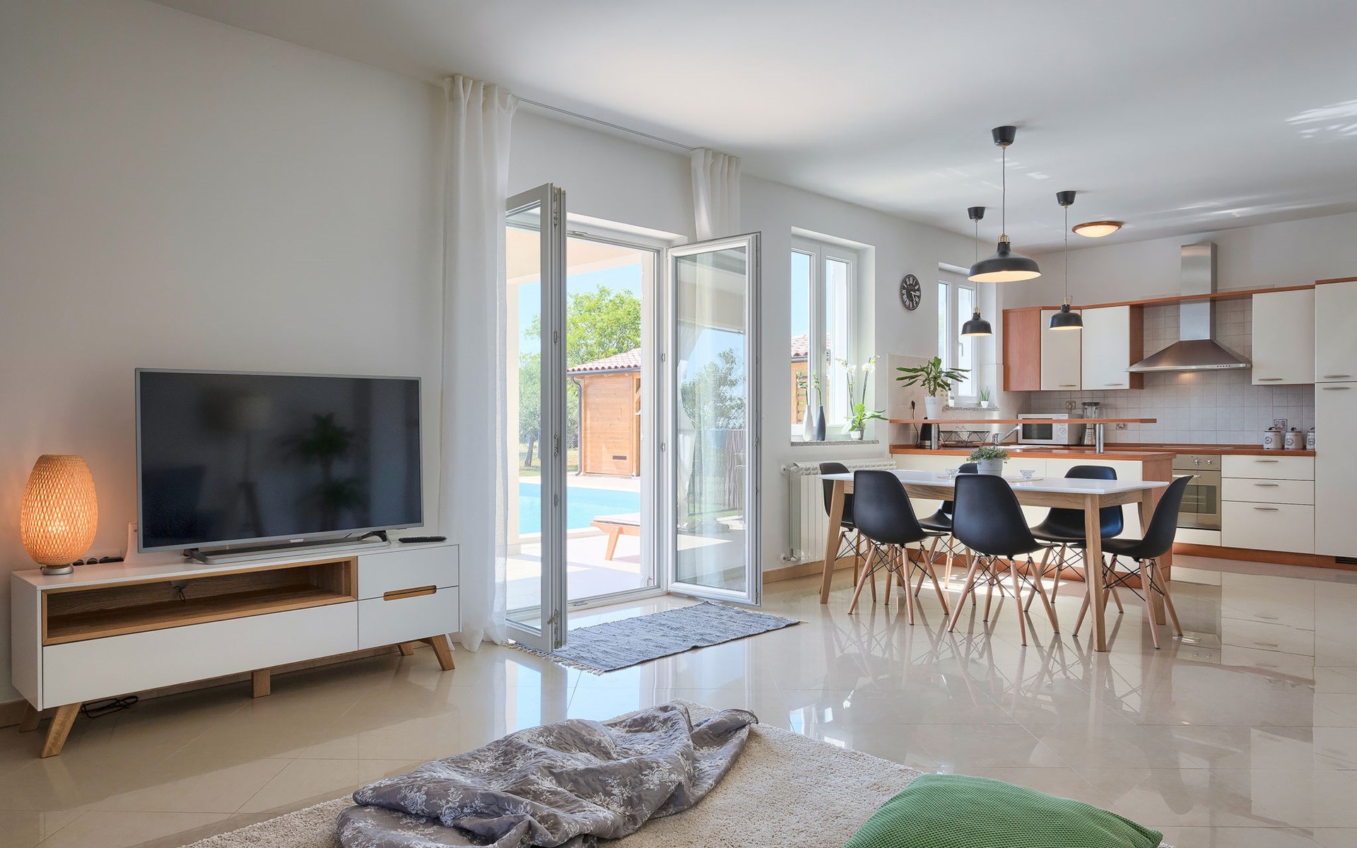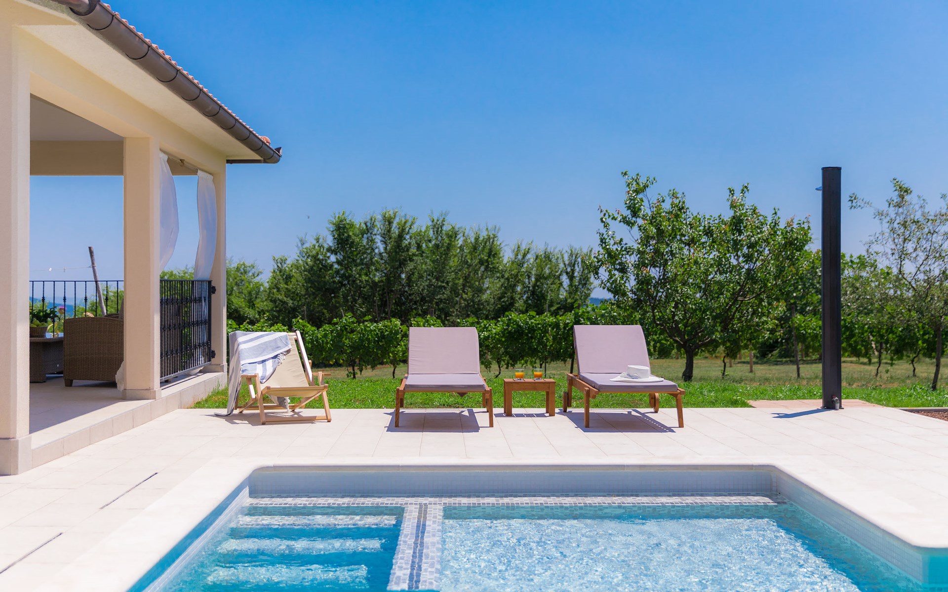 Schönes Einfamilienhaus "Eugen". Im Weiler Camlići, 5 km vom Zentrum von Barban, ruhige, sonnige Lage, 14 km vom Meer, im Grünen. Zur Alleinbenutzung: Grundstück 3'500 m2 mit Rasen, Obstgarten, Schwimmbad eckig, beheizt (8 x 4 m, 150 cm tief, saisonale Verfügbarkeit: 15.Apr. - 15.Okt.) mit Innentreppe. WC im Poolbereich, Kinderbecken, Aussendusche, Terrasse (18 m2), Gartenmöbel. Im Hause: Internetzugang, Waschmaschine. Parkplatz (für 3 Autos) beim Haus auf dem Grundstück. Einkaufsgeschäft 5 km, Supermarkt 5 km, Restaurant 5 km, Bushaltestelle 5.3 km, Kieselstrand 14 km. Reitstall 12.5 km, Wanderwege ab Haus 50 m, Radweg 100 m. Nahe gelegene Sehenswürdigkeiten: adventure park 11.5 km. Schwimmbad beheizt (extra). Es ist notwendig 7 Tage im Voraus bekannt zu geben, ob die Schwimmbadheizung eingeschaltet werden soll. Das veranstalten von Partys ist nicht gestattet. Keine Vermietung an Jugendgruppen.