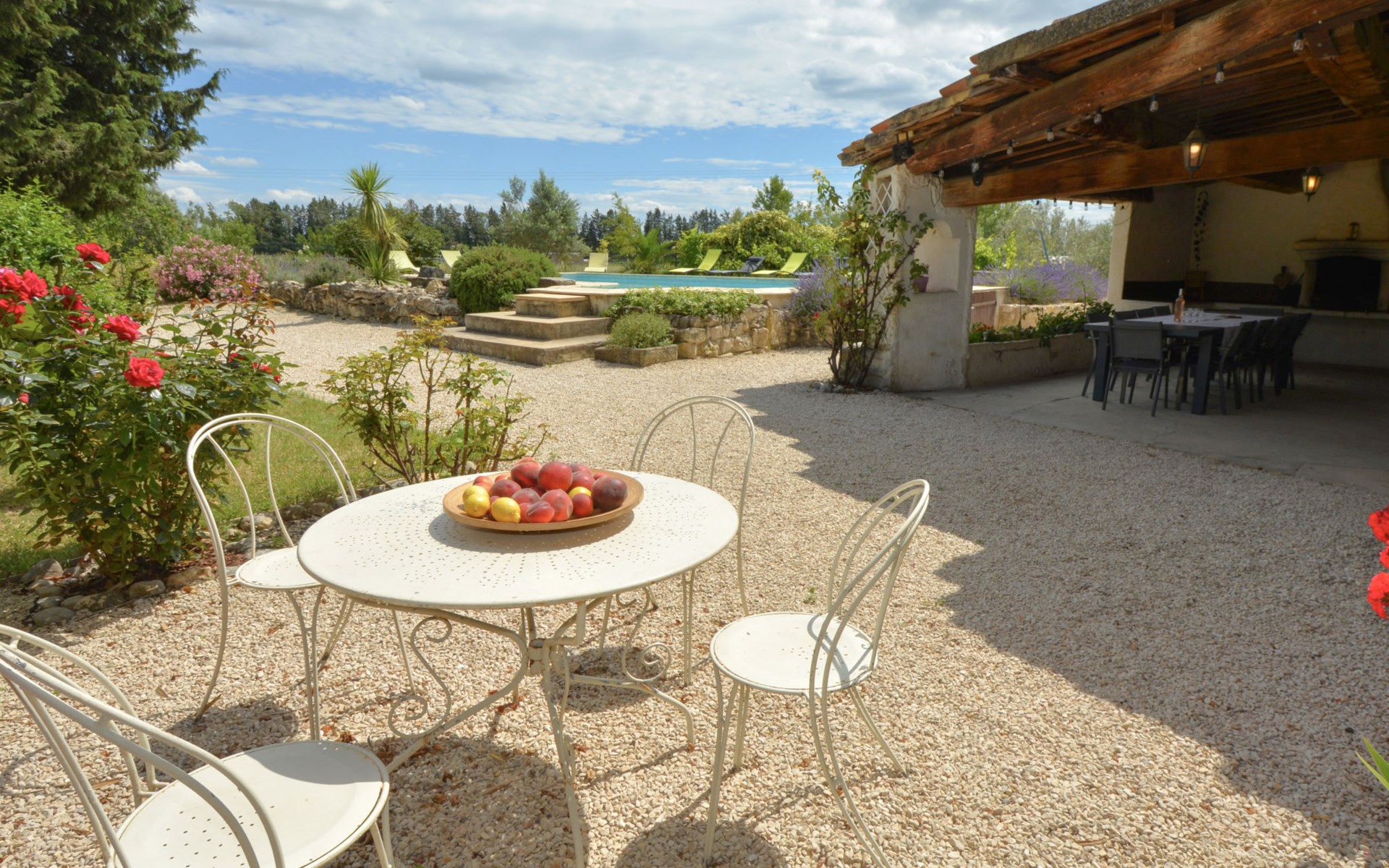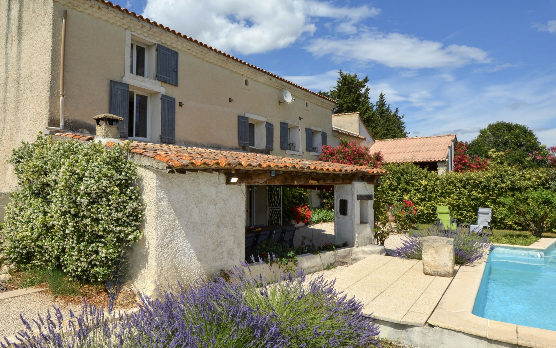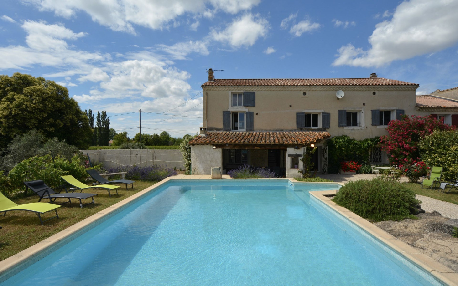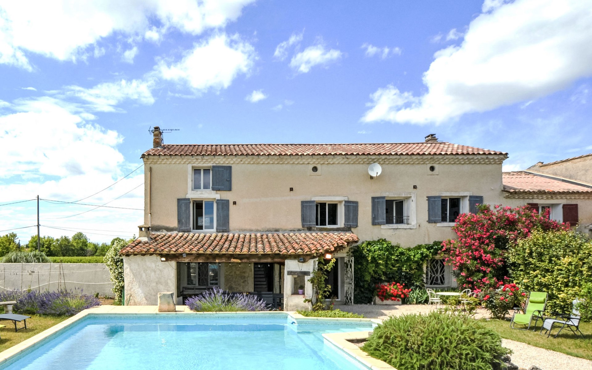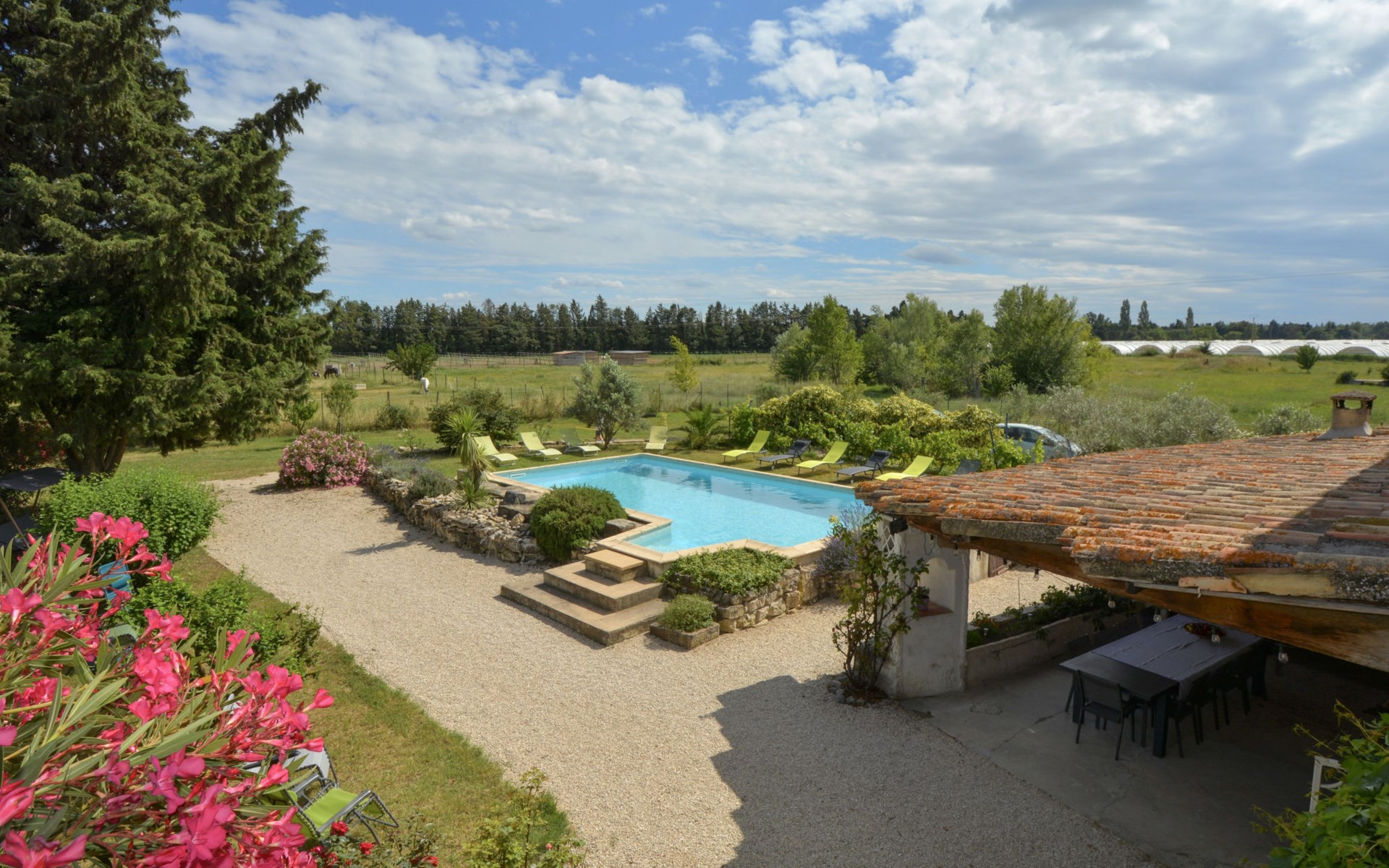 Altes Mas/Landhaus "La Grange Blanche", Baujahr 1850, renoviert im Jahre 2016. Ausserhalb des Ortes, 2 km vom Zentrum, im Grünen. Zur Alleinbenutzung: Grundstück 1'600 m2, Park 900 m2 (eingezäunt) mit Rasen und Bäumen, Schwimmbad (10 x 5 m, 170 cm tief, saisonale Verfügbarkeit: 15.Mai. - 30.Okt.) mit Innentreppe und Alarmanlage. Parkplatz (für 3 Autos) auf dem Grundstück. Einkaufsgeschäft 2 km, Lebensmittelgeschäft 2 km, Restaurant 2 km, Bushaltestelle "Les Cadets" 3 km. Reitstall 200 m. Nahe gelegene Sehenswürdigkeiten: Wave Island 10 km, Parc Spirou 10 km, L'Isle sur la Sorgue 11 km, Avignon 20 km. Bitte beachten: Fahrzeug empfohlen. Tiere in der Umgebung. Hauptstrasse in der Nähe. Das Haus ist halb abgetrennt, ohne Gegenüber. Die D28 führt hinter dem Haus vorbei, die Straße, die von Avignon nach Pernes führt. Park mit Pferden vor dem Haus.