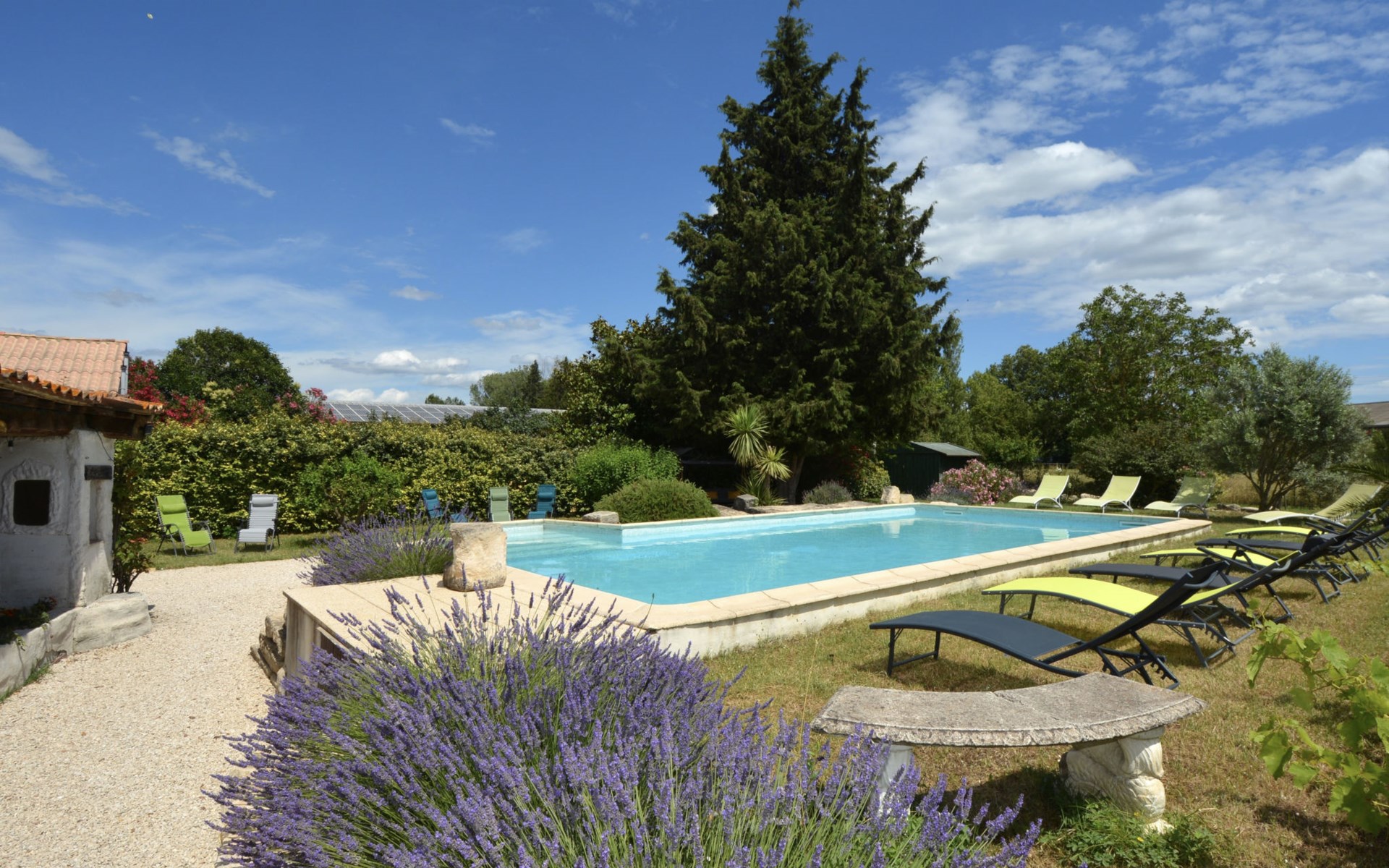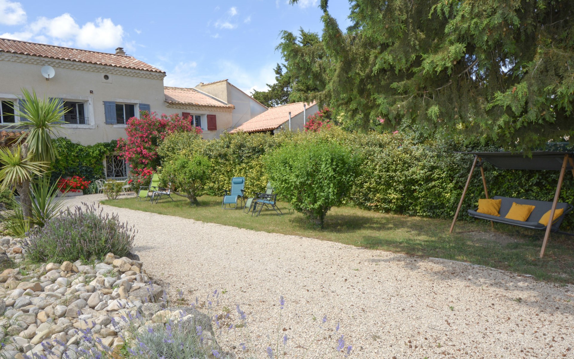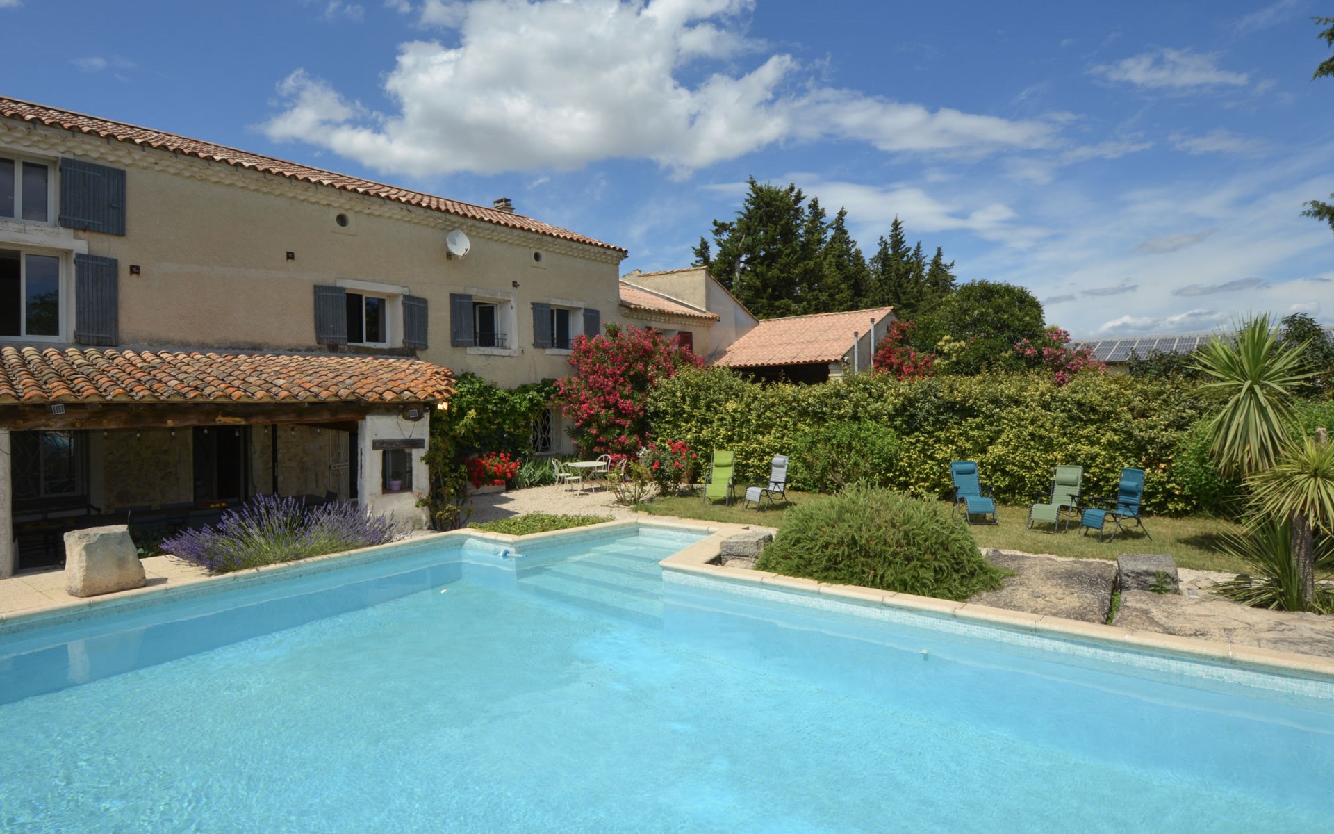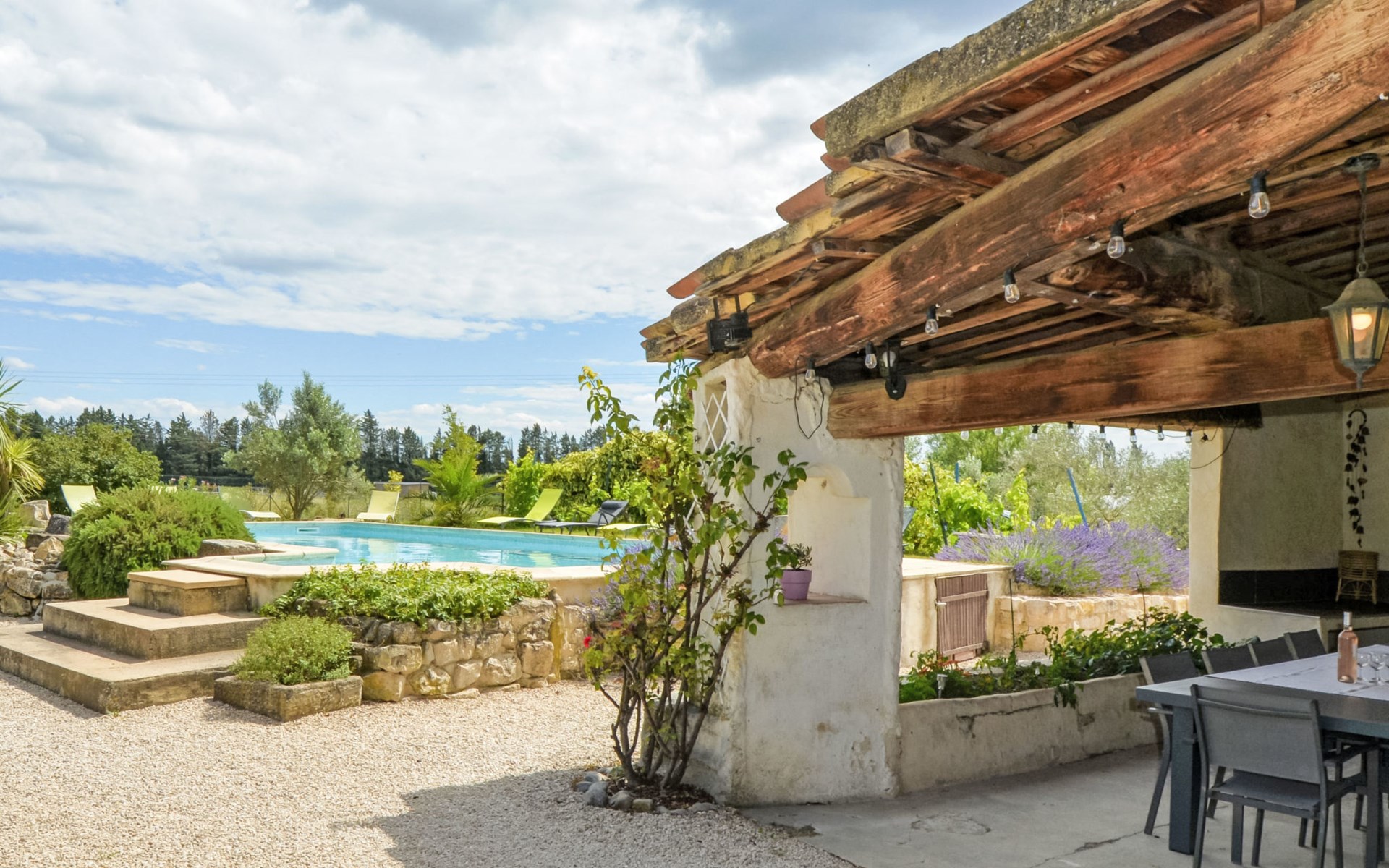 Altes Mas/Landhaus "La Grange Blanche", Baujahr 1850, renoviert im Jahre 2016. Ausserhalb des Ortes, 2 km vom Zentrum, im Grünen. Zur Alleinbenutzung: Grundstück 1'600 m2, Park 900 m2 (eingezäunt) mit Rasen und Bäumen, Schwimmbad (10 x 5 m, 170 cm tief, saisonale Verfügbarkeit: 15.Mai. - 30.Okt.) mit Innentreppe und Alarmanlage. Parkplatz (für 3 Autos) auf dem Grundstück. Einkaufsgeschäft 2 km, Lebensmittelgeschäft 2 km, Restaurant 2 km, Bushaltestelle "Les Cadets" 3 km. Reitstall 200 m. Nahe gelegene Sehenswürdigkeiten: Wave Island 10 km, Parc Spirou 10 km, L'Isle sur la Sorgue 11 km, Avignon 20 km. Bitte beachten: Fahrzeug empfohlen. Tiere in der Umgebung. Hauptstrasse in der Nähe. Das Haus ist halb abgetrennt, ohne Gegenüber. Die D28 führt hinter dem Haus vorbei, die Straße, die von Avignon nach Pernes führt. Park mit Pferden vor dem Haus.