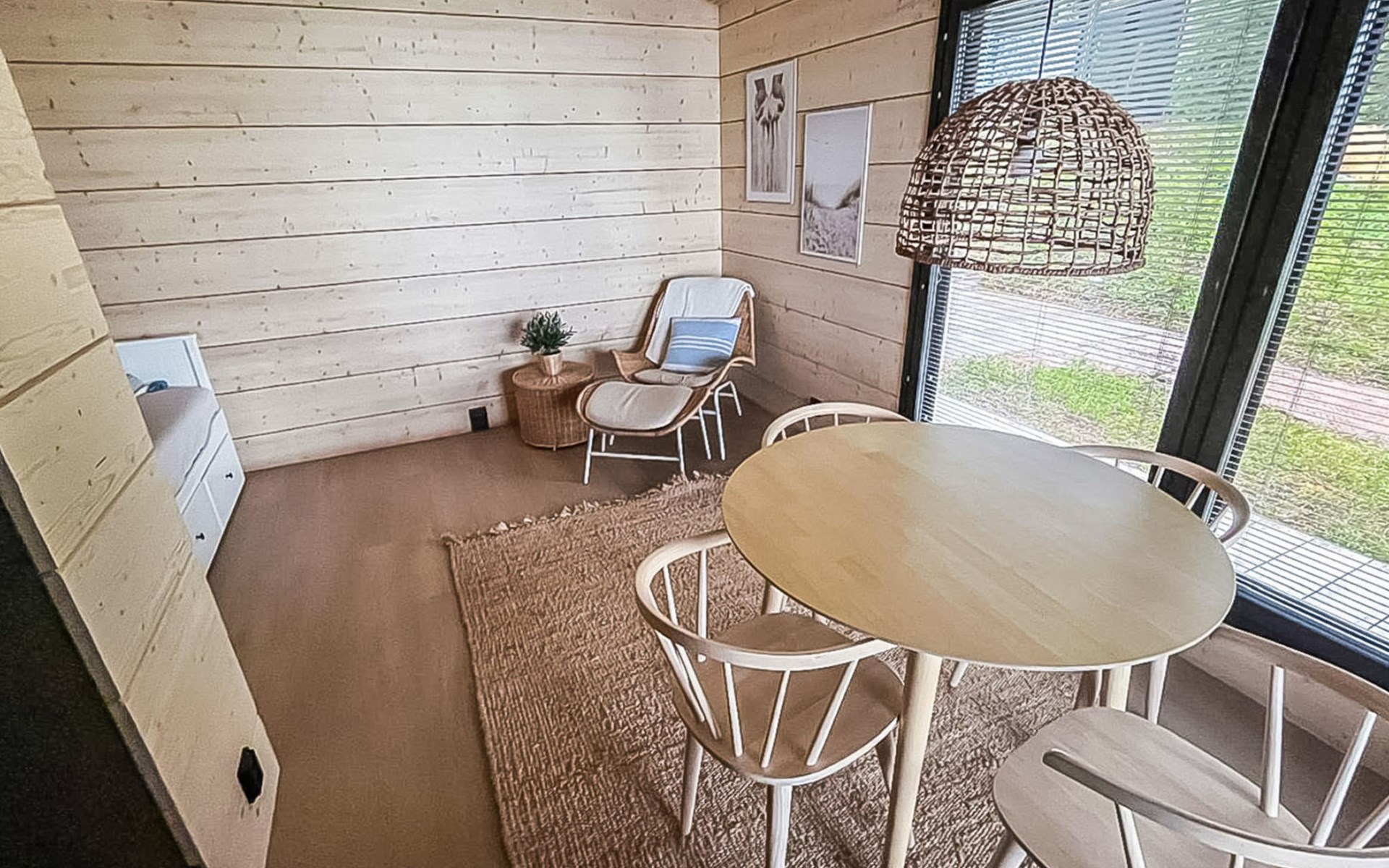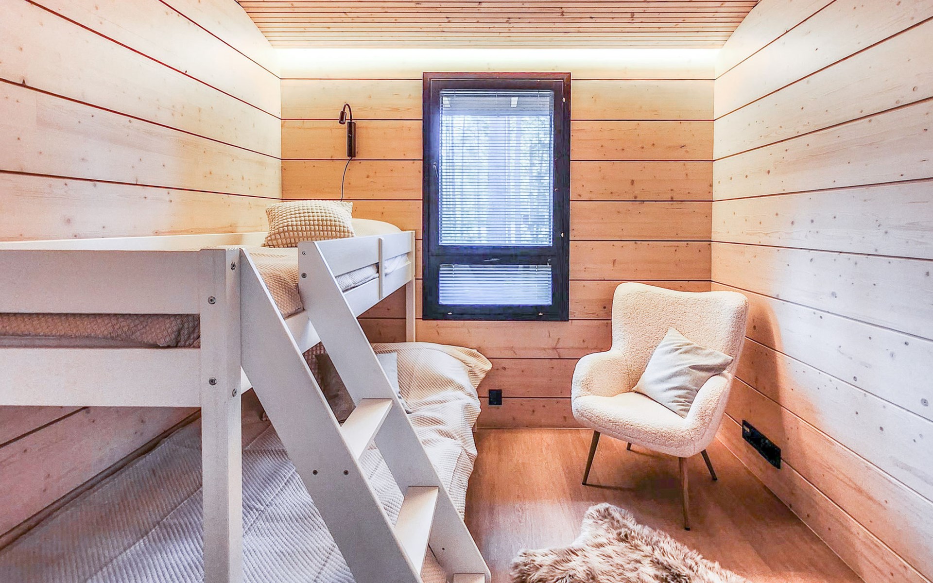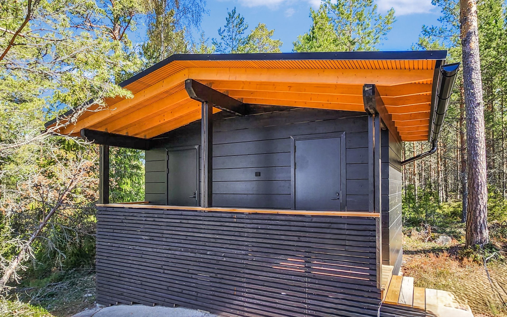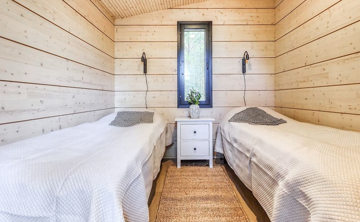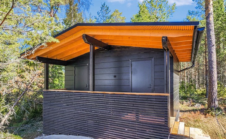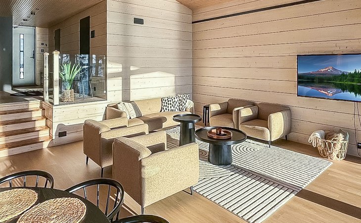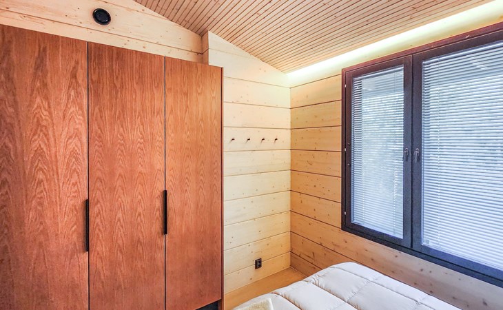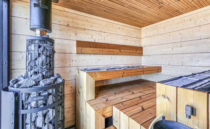 The sauna's living area includes a sofa bed that converts into a 160×200 cm bed for two. A fridge-freezer is also available. The cabin is heated by an eco-friendly air-to-water heat pump.