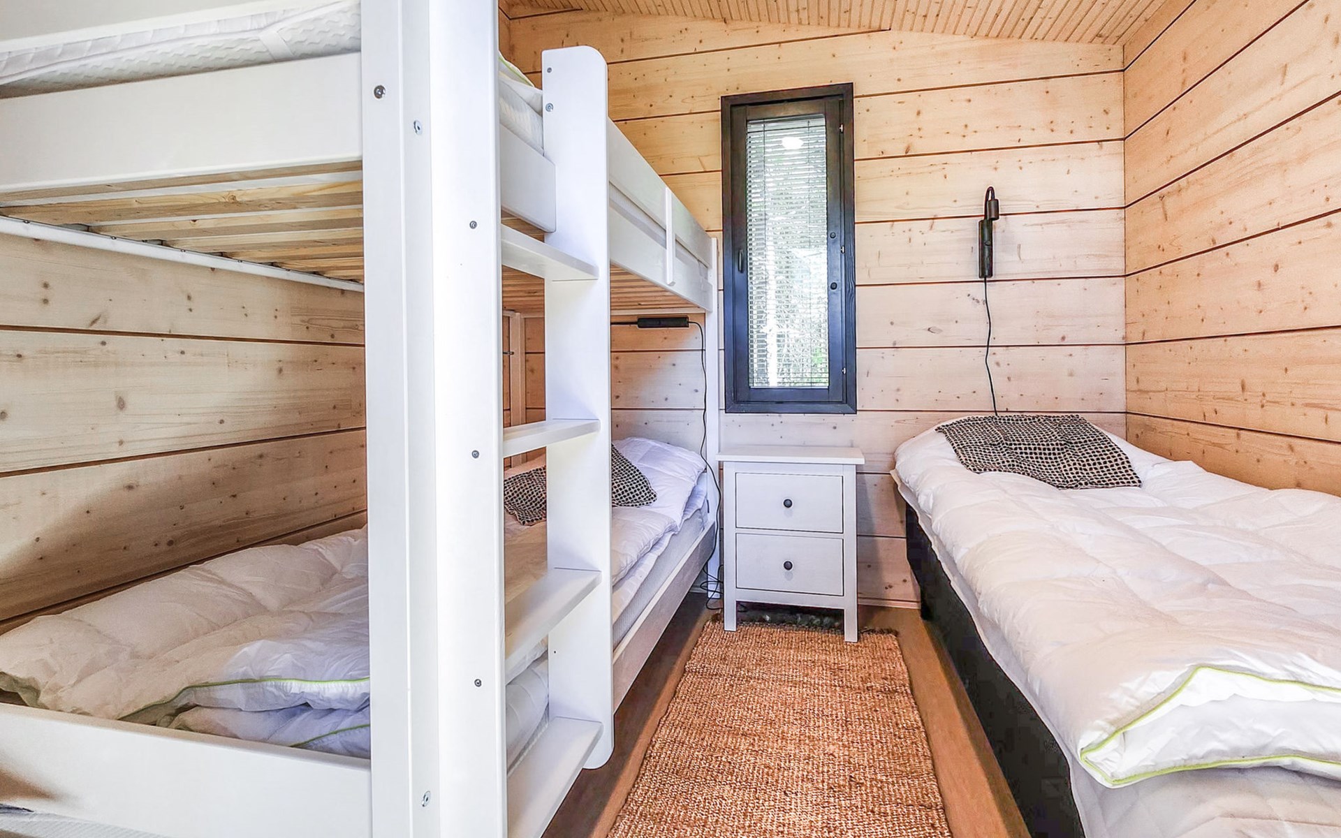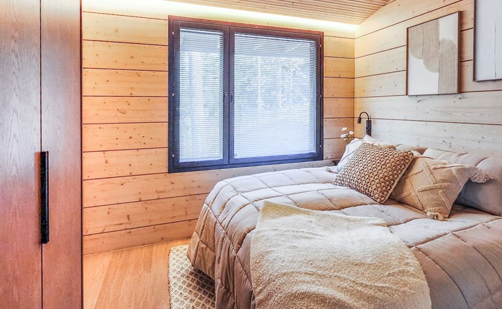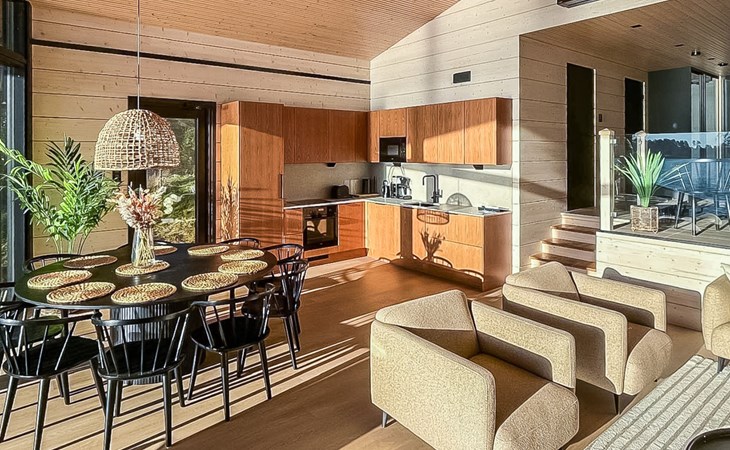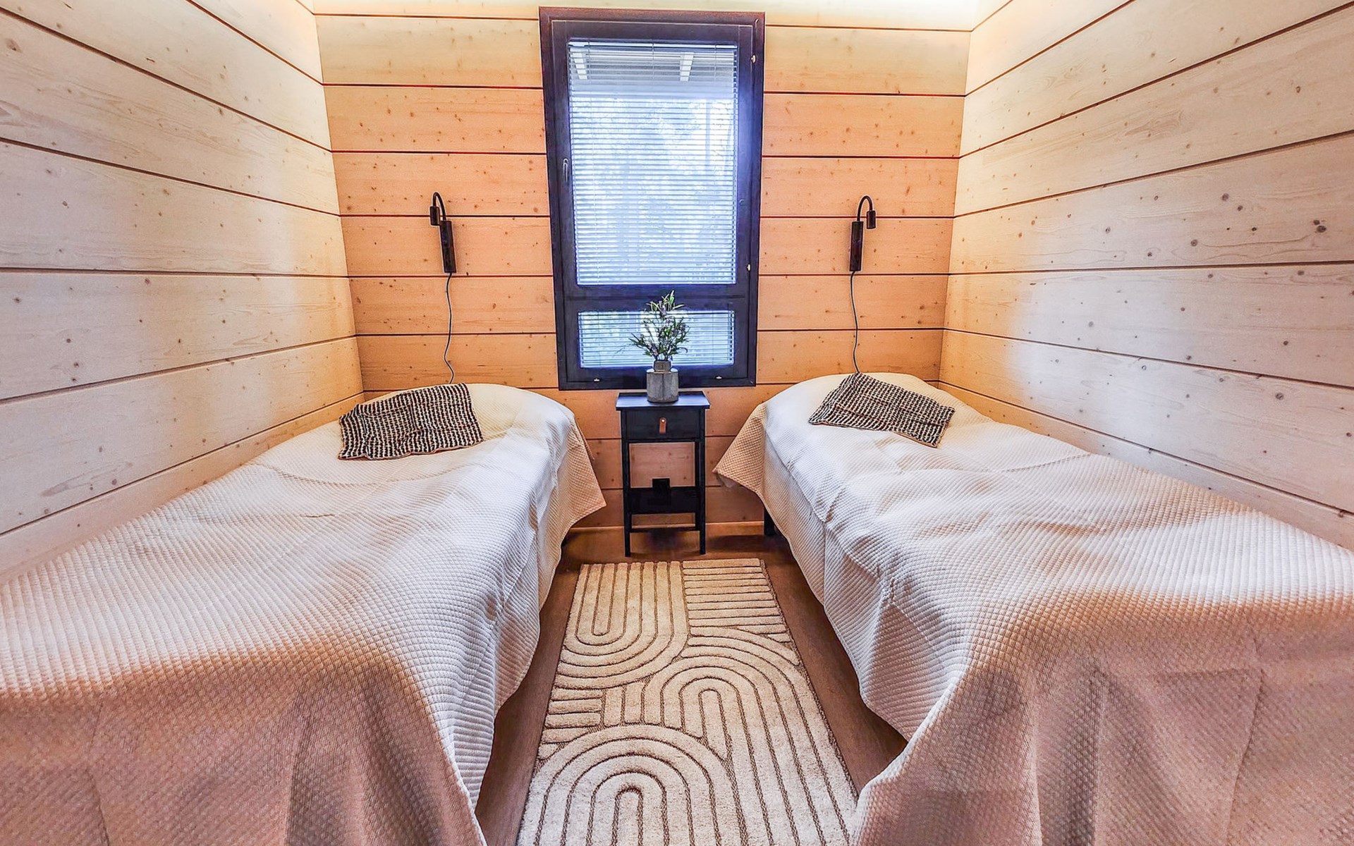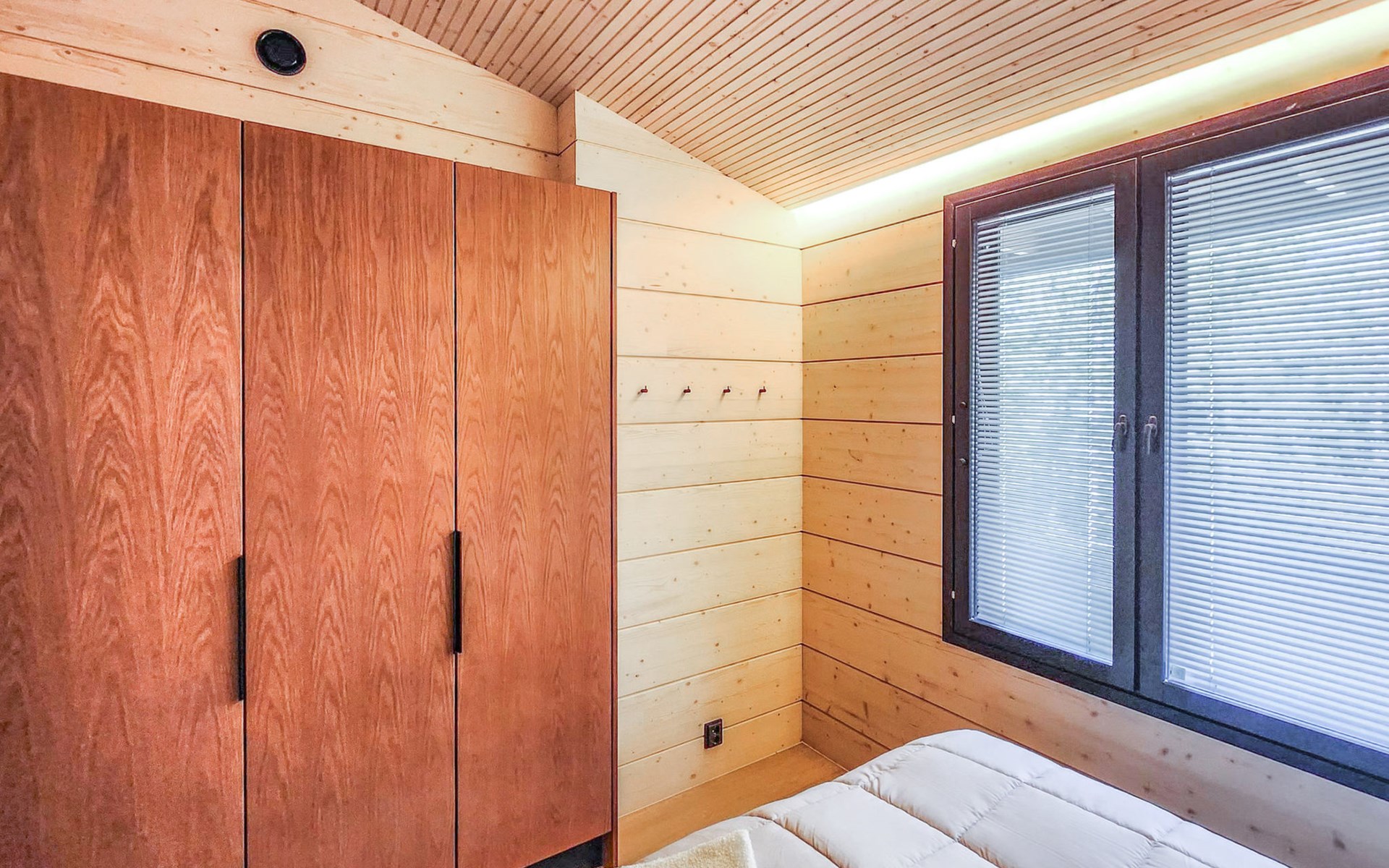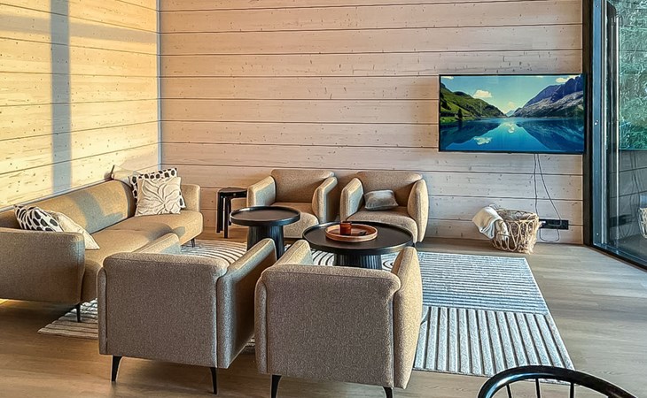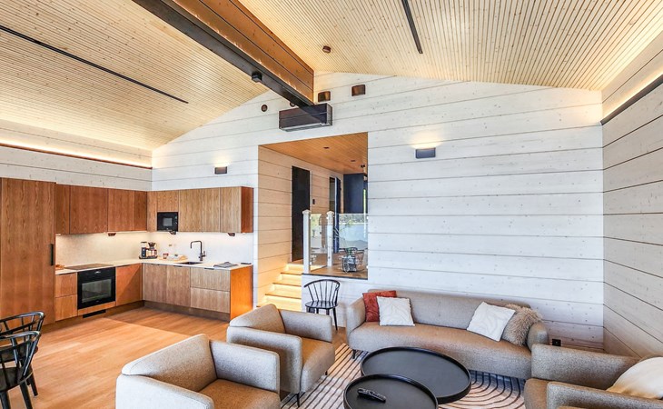 The sauna's living area includes a sofa bed that converts into a 160×200 cm bed for two. A fridge-freezer is also available. The cabin is heated by an eco-friendly air-to-water heat pump.