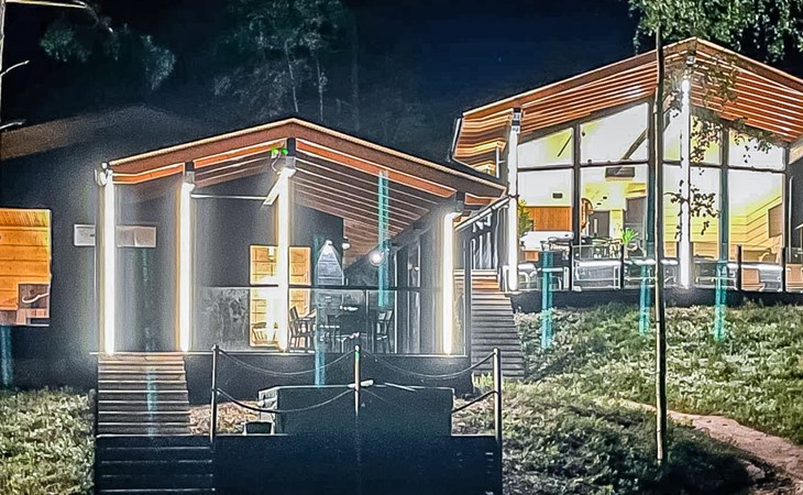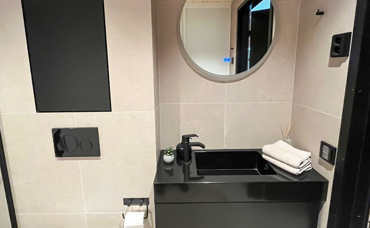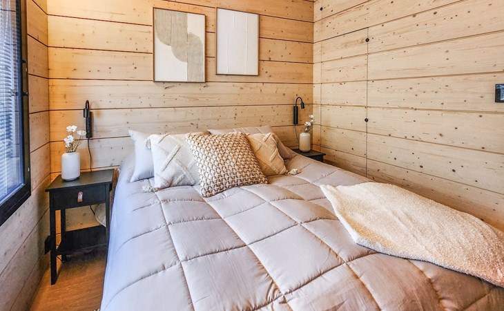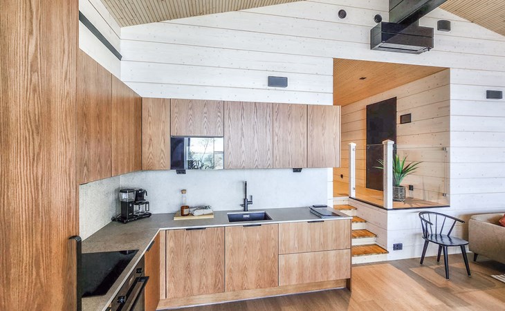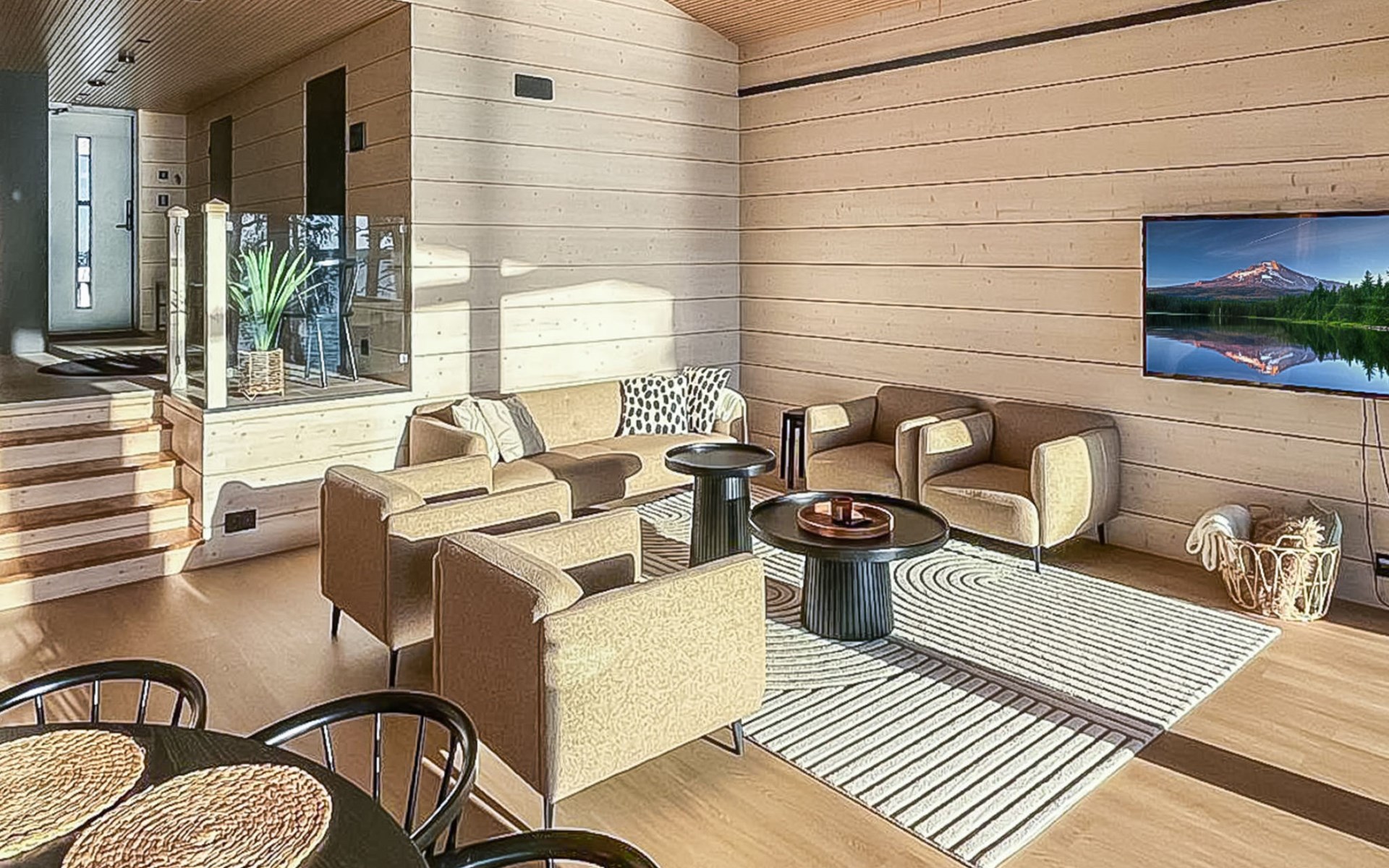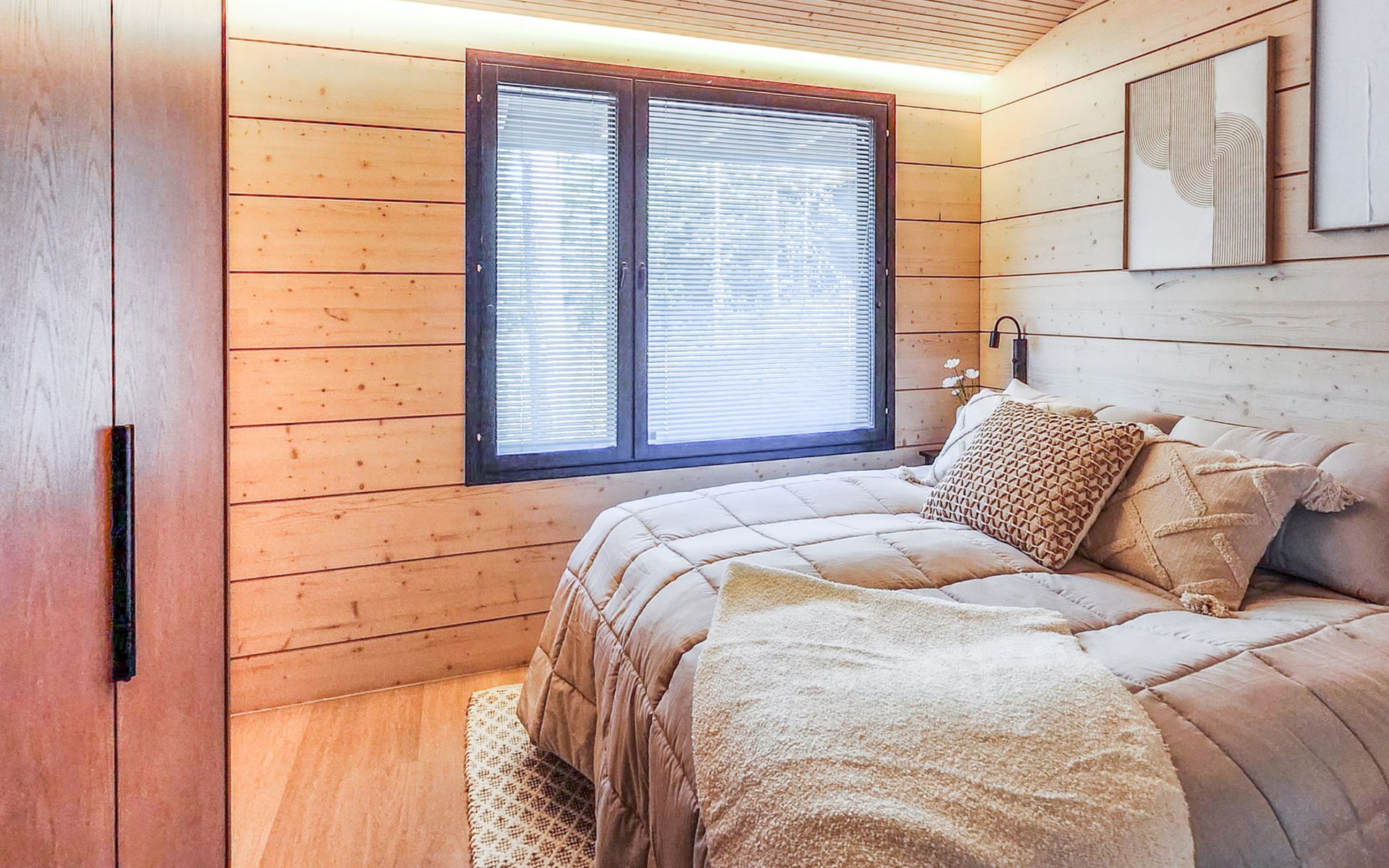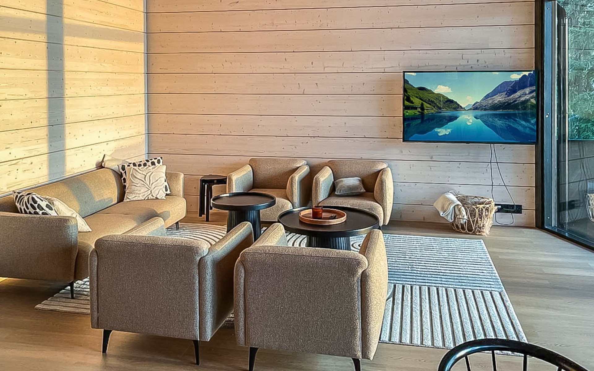 The sauna's living area includes a sofa bed that converts into a 160×200 cm bed for two. A fridge-freezer is also available. The cabin is heated by an eco-friendly air-to-water heat pump.