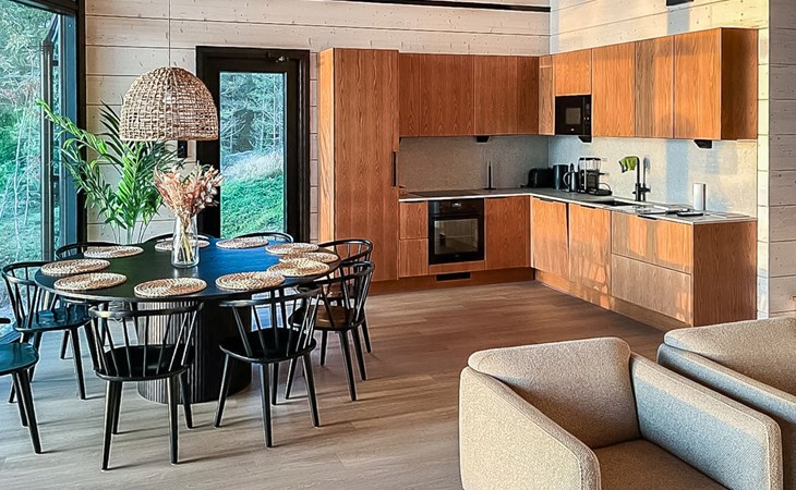 The cottage has a bright and spacious living area that seamlessly connects the kitchen and living room. Large windows offer a breathtaking view of the west to the sea, especially the sunsets here are unparalleled. The well-equipped kitchen and large dining area create the perfect setting for social moments.