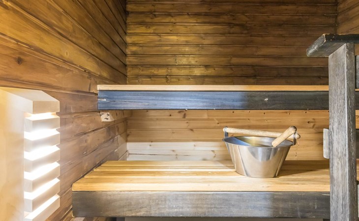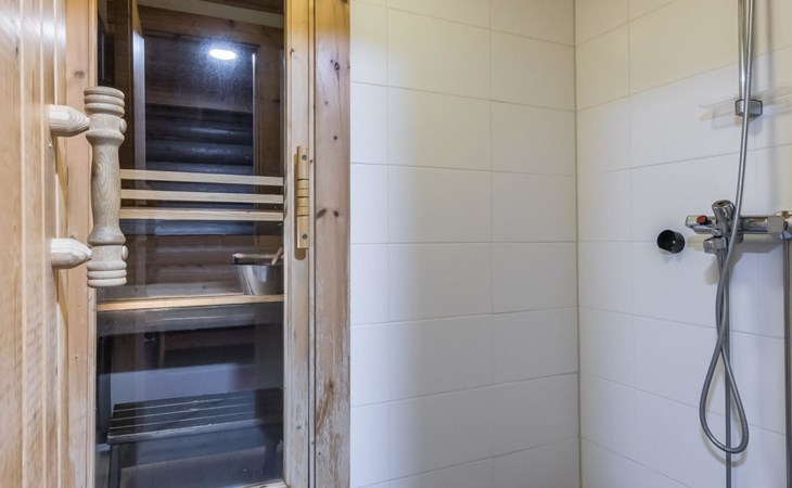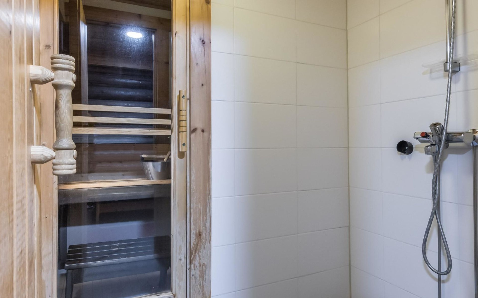 The apartment also features a sauna, a bathroom, and a dressing area. The WC is separate.