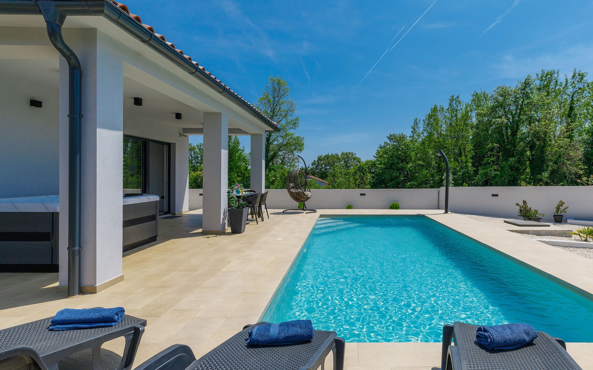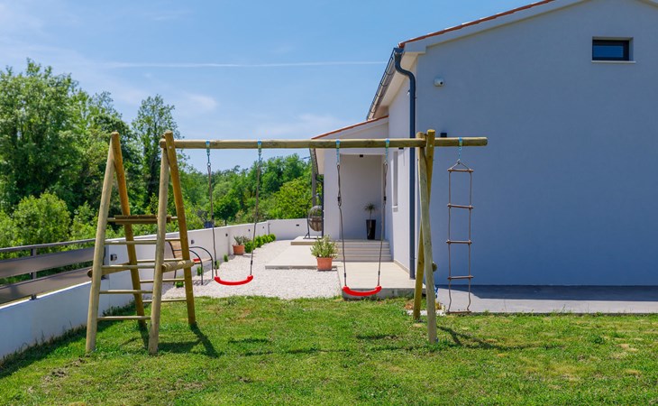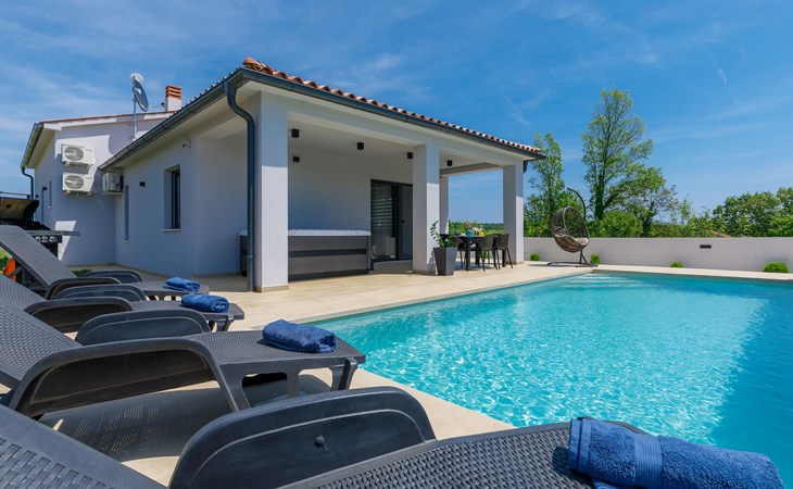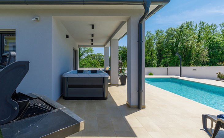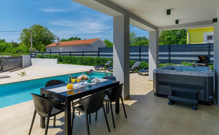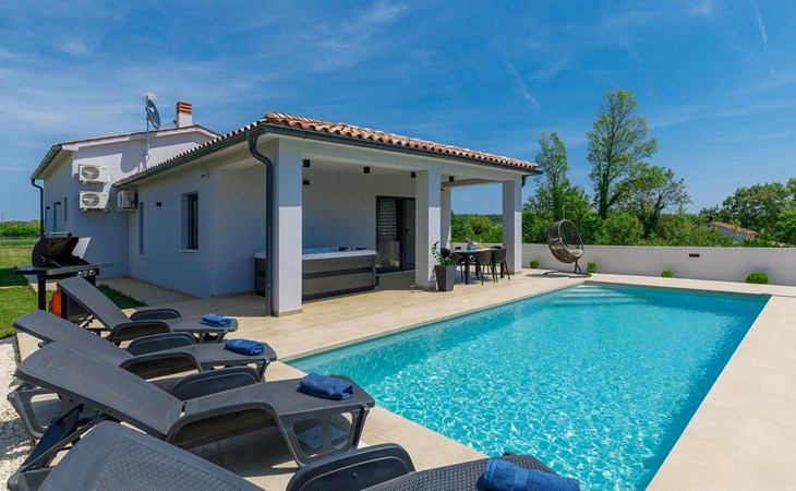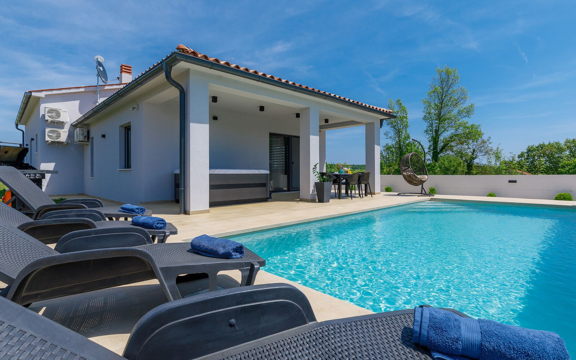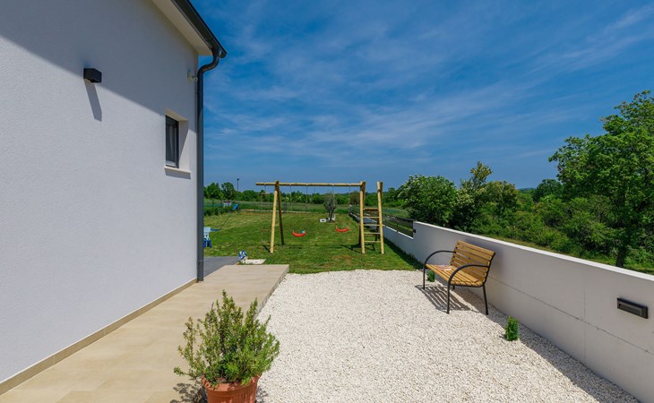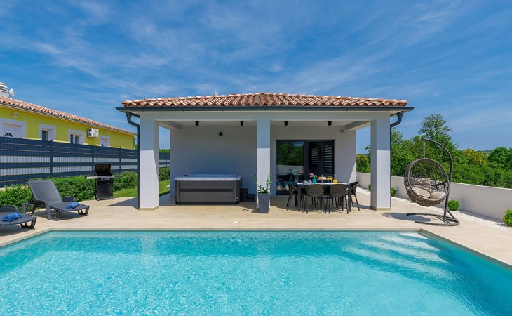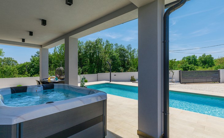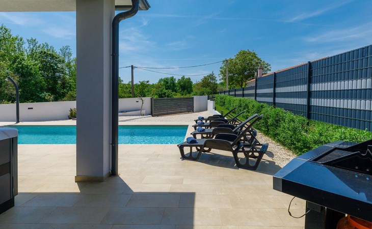 Marčana 11 km von Pula: Schöne Villa "Vine", Baujahr 2020. Im Weiler Prodol, 5 km vom Zentrum von Marčana, ruhige, sonnige Lage, 6 km vom Meer. Zur Alleinbenutzung: Grundstück 600 m2 (eingezäunt), Garten mit Pflanzen und Blumen, Schwimmbad eckig (8 x 4 m, 140 cm tief, saisonale Verfügbarkeit: 01.Mai. - 01.Okt.) mit Innentreppe. Aussendusche. Im Hause: Internetzugang, Alarmanlage, Waschmaschine. Parkplatz (für 2 Autos) beim Haus auf dem Grundstück. Einkaufsgeschäft 4 km, Restaurant 500 m, Bushaltestelle 250 m, Kieselstrand 6 km, Felsstrand 6 km. Reitstall 2 km, Wanderwege ab Haus 100 m, Radweg 150 m.