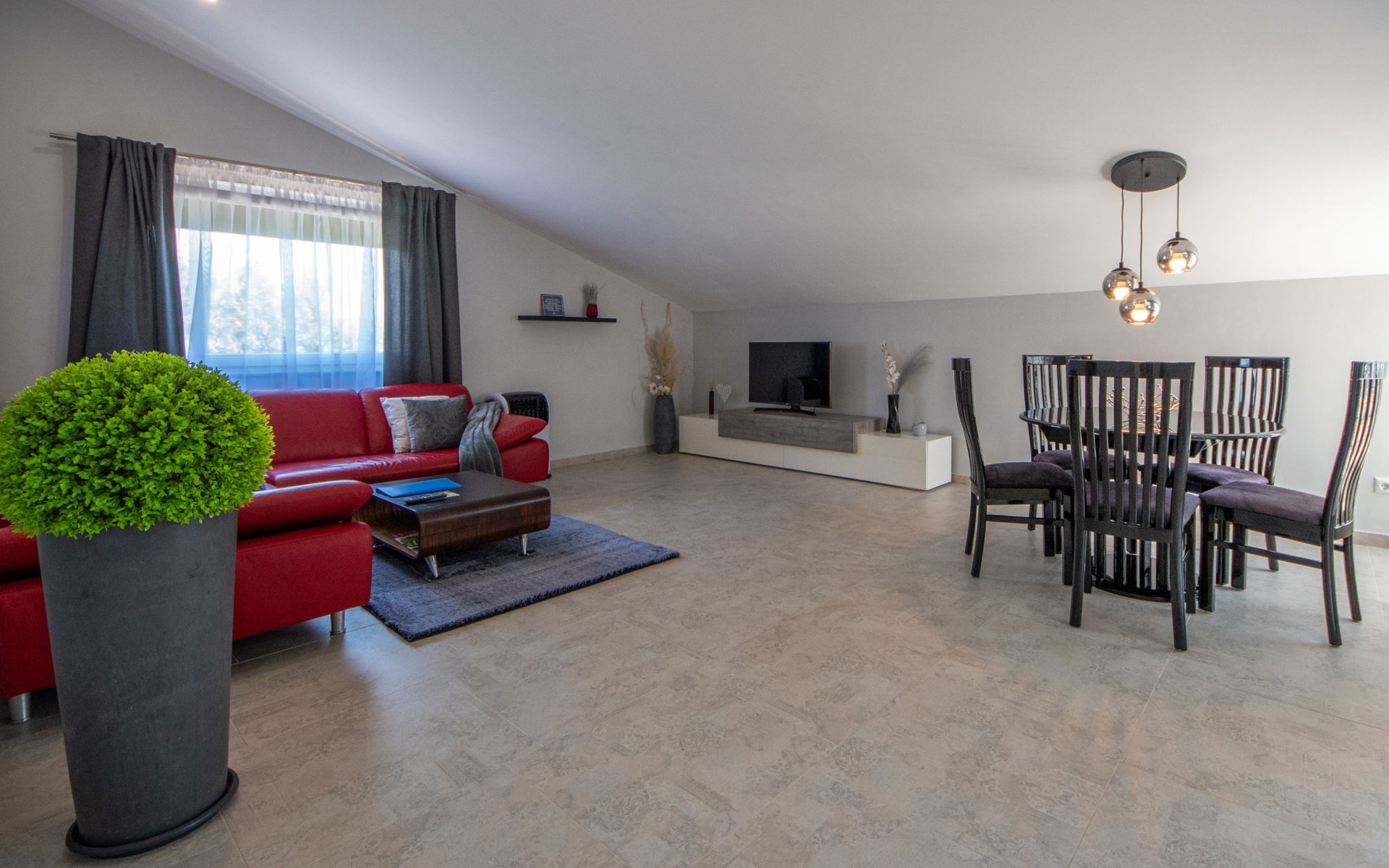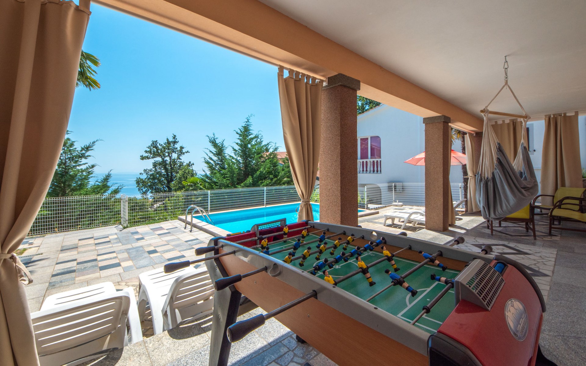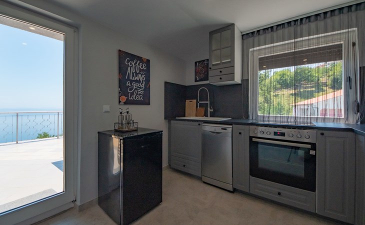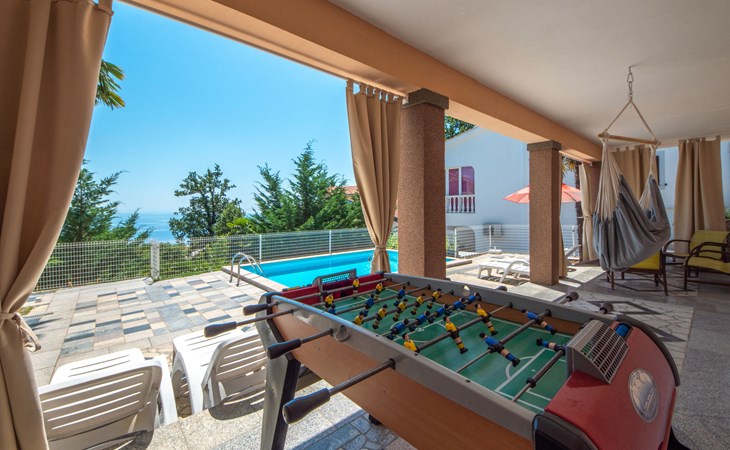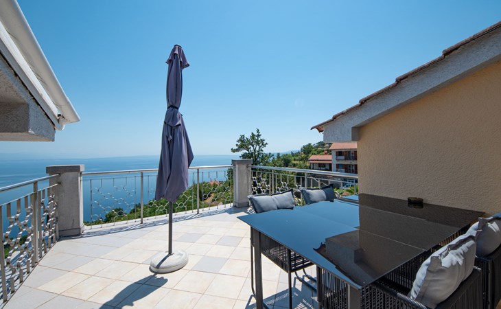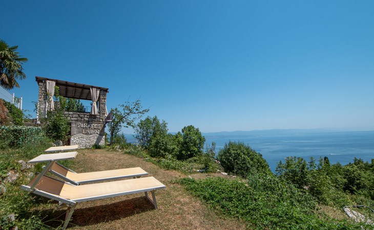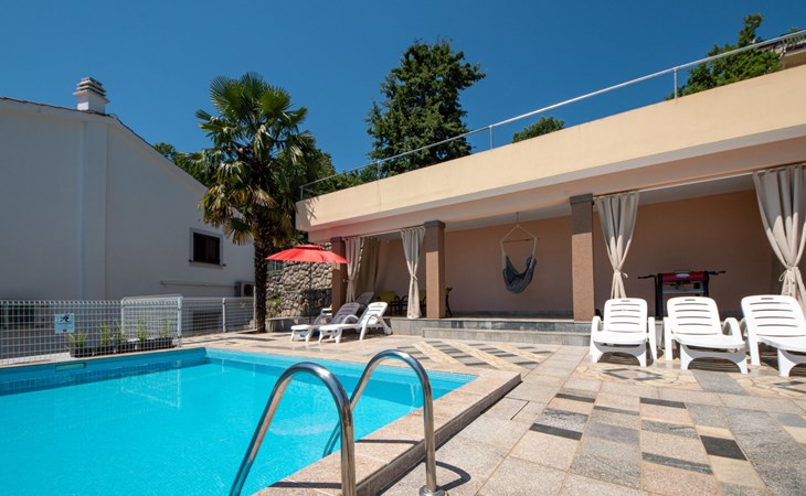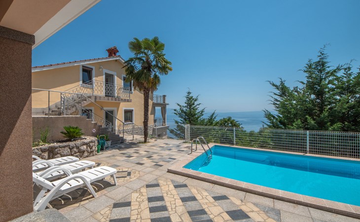 Tuliševica 5 km von Lovran: Dreifamilienhaus "La Mer". Oberhalb von Lovran, im Weiler Tuliševica, 8 km vom Zentrum von Opatija, ruhige, sonnige, erhöhte Lage, 5 km vom Meer, in einer Sackgasse. Zur Mitbenutzung: Grundstück 1'110 m2, Pflanzen, Schwimmbad eckig (6 x 3 m, 110 cm tief, saisonale Verfügbarkeit: 01.Mai. - 01.Okt.). Terrasse (74 m2), Gartenmöbel, Grill. Im Hause: Internetzugang. Einkaufsgeschäft 650 m, Supermarkt 5.5 km, Restaurant 5 km, Bushaltestelle 230 m, Steinstrand 5 km, Strandbad 5 km, betonierter Strand 5 km. Jacht-Hafen 7 km, Tennis 5 km. Der Besitzer akzeptiert keine Jugendgruppen. Zur Mitbenutzung:Terrasse 70 m2. Das veranstalten von Feiern ist nicht gestattet.