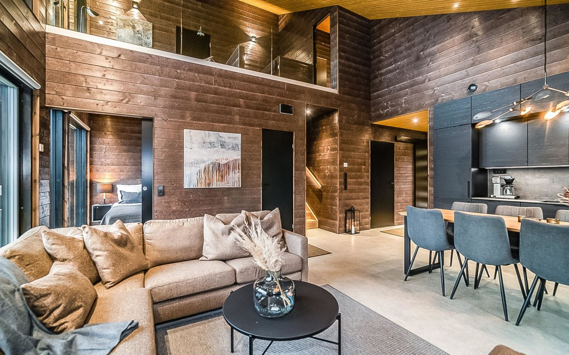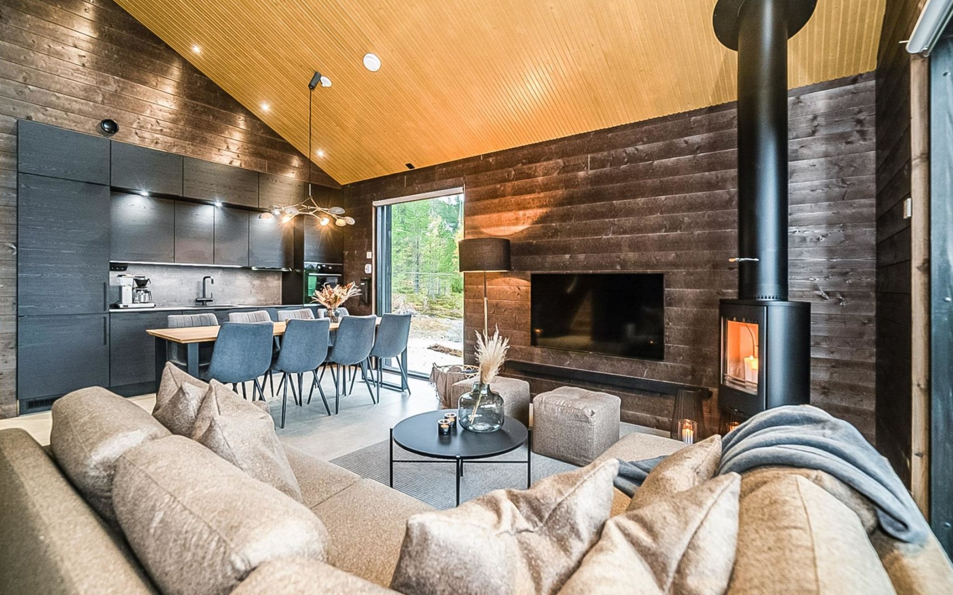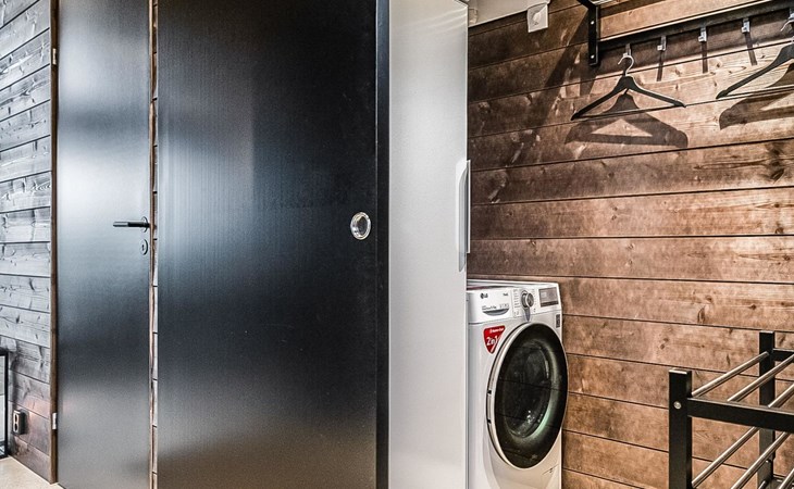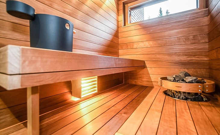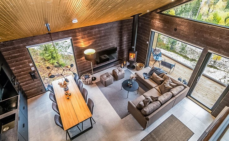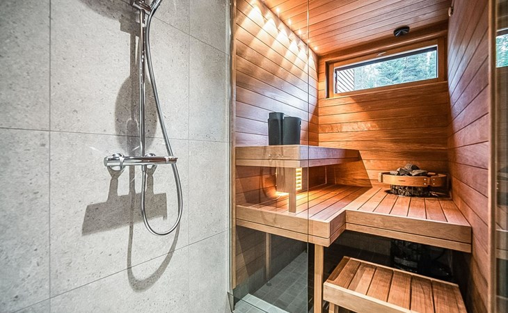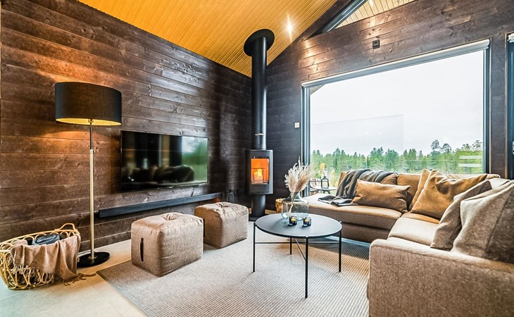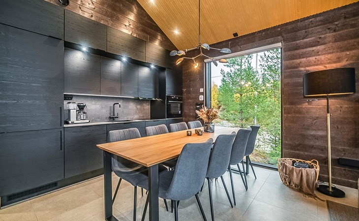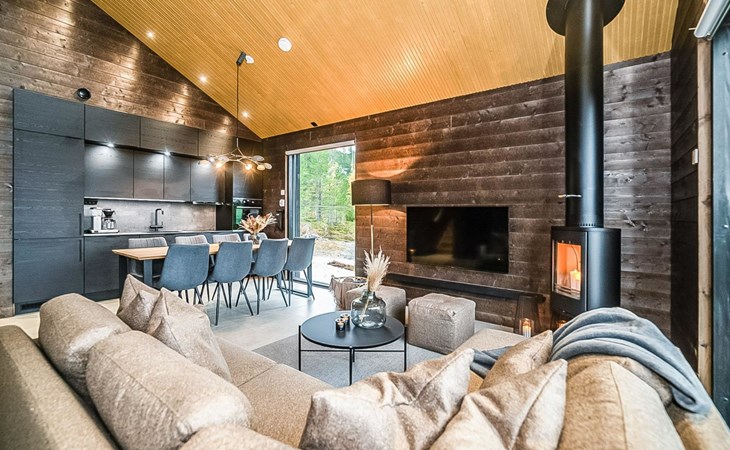 The cabin's spacious living room/kitchen provides an excellent setting for quality time with family and friends. Delight in delicious meals and relax in the comfortable living area. Moreover, the cabin features its own electric sauna, offering relaxation and rejuvenation after a long day.