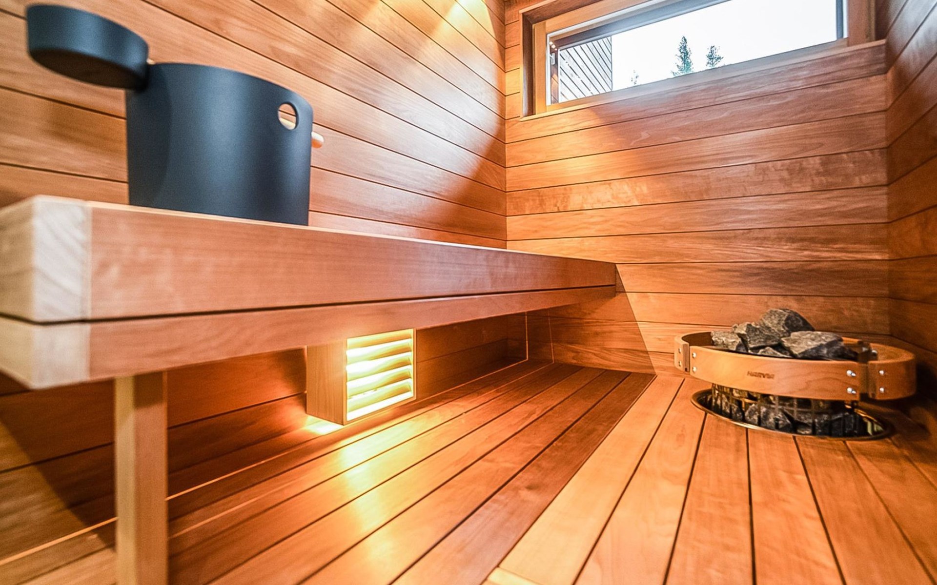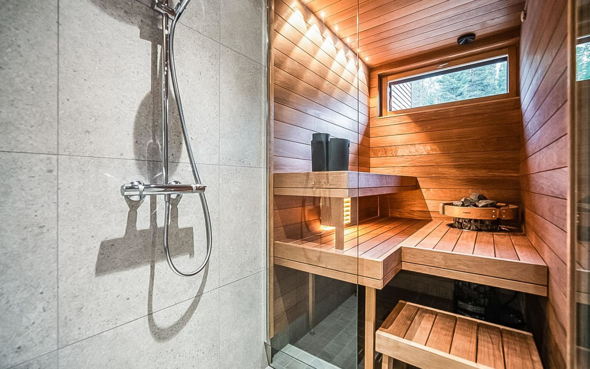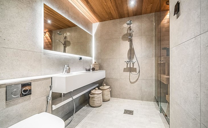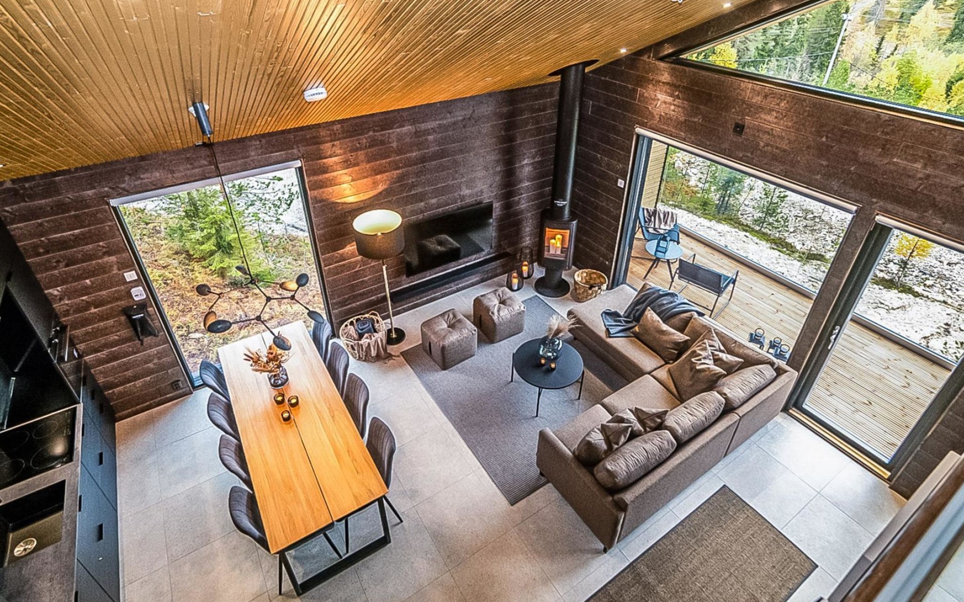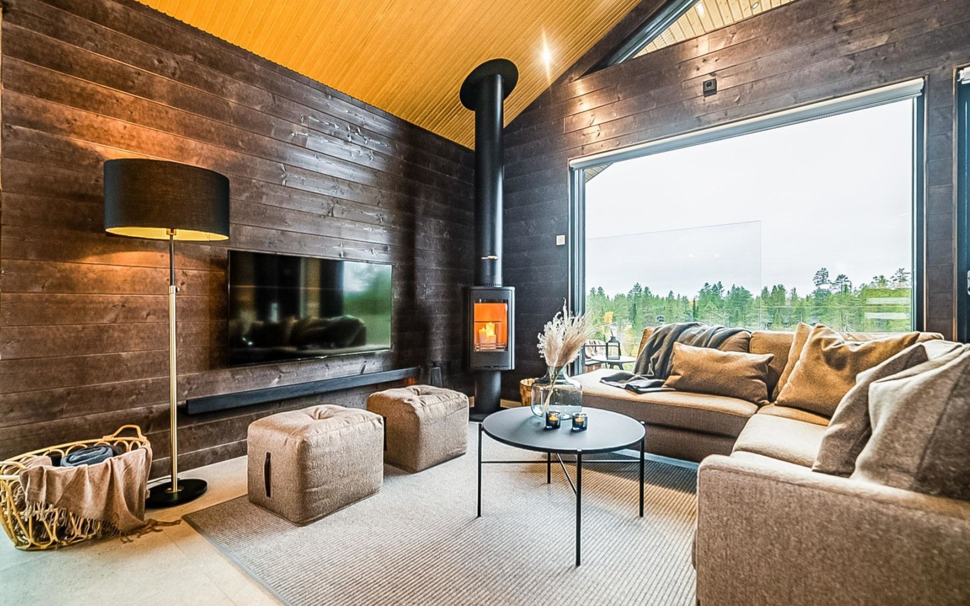 The cabin's spacious living room/kitchen provides an excellent setting for quality time with family and friends. Delight in delicious meals and relax in the comfortable living area. Moreover, the cabin features its own electric sauna, offering relaxation and rejuvenation after a long day.