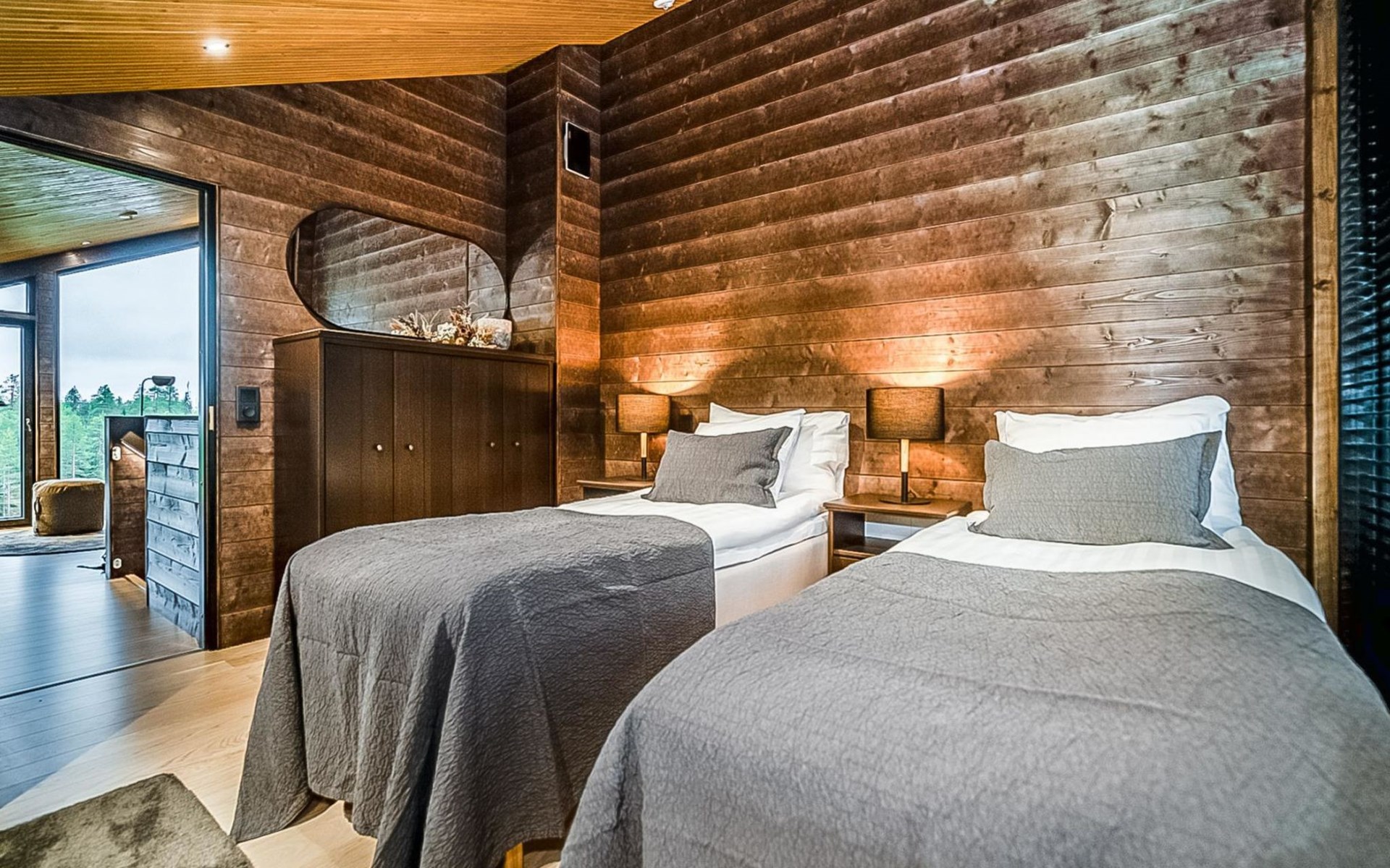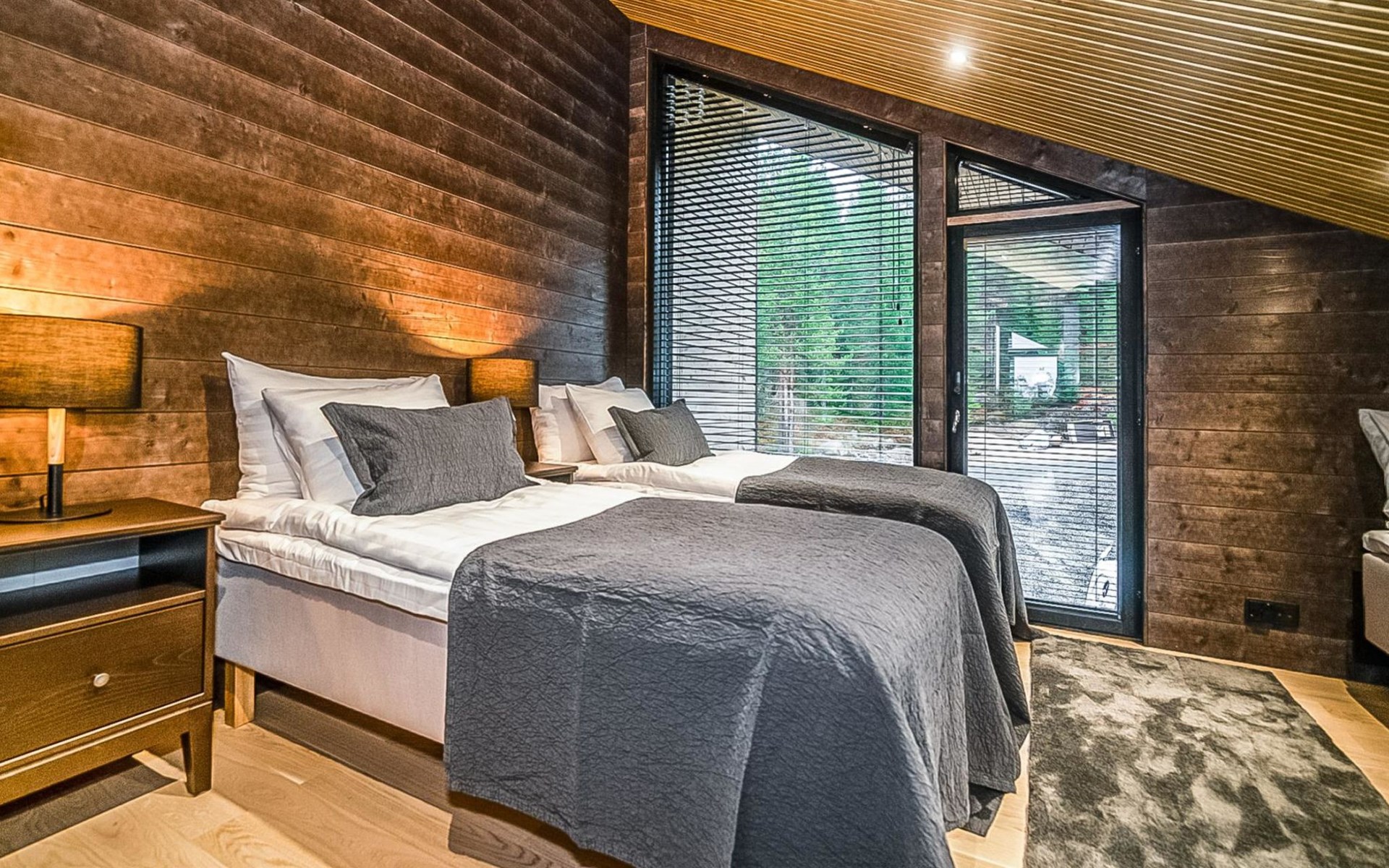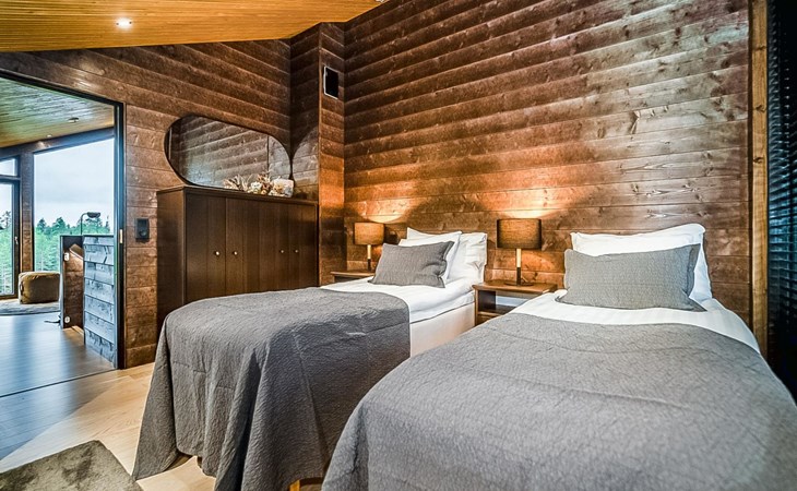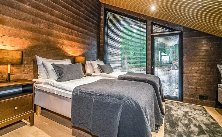 The cabin has three separate bedrooms, ensuring a comfortable and peaceful night's sleep for all guests. The two bedrooms on the ground floor feature spacious double beds, while the upper-floor bedroom accommodates three beds, ensuring ample space and comfort for everyone.