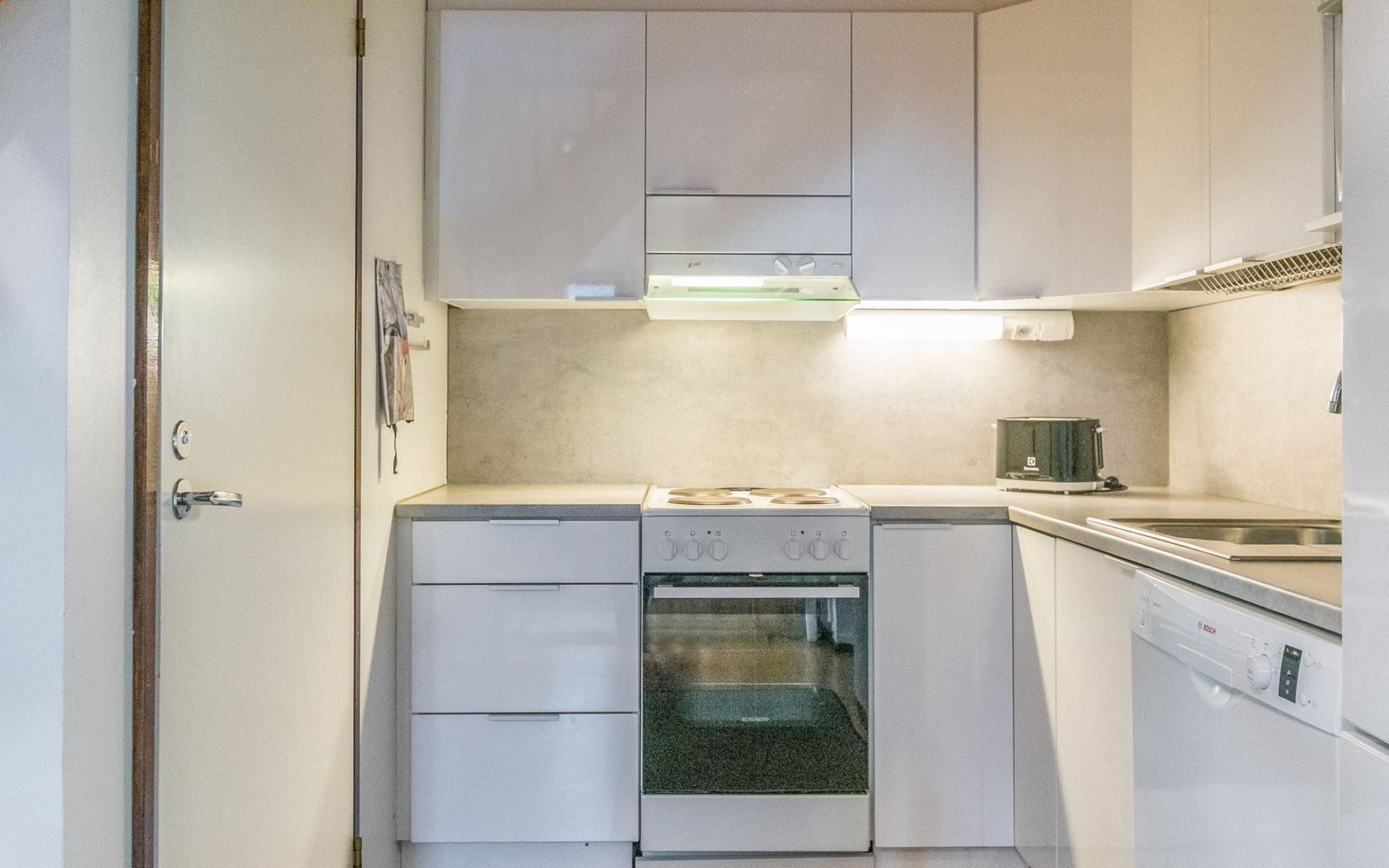 The apartment is equipped with a full set of crockery, coffee maker, kettle, toaster, electric mixer, iron, ironing board and hairdryer.