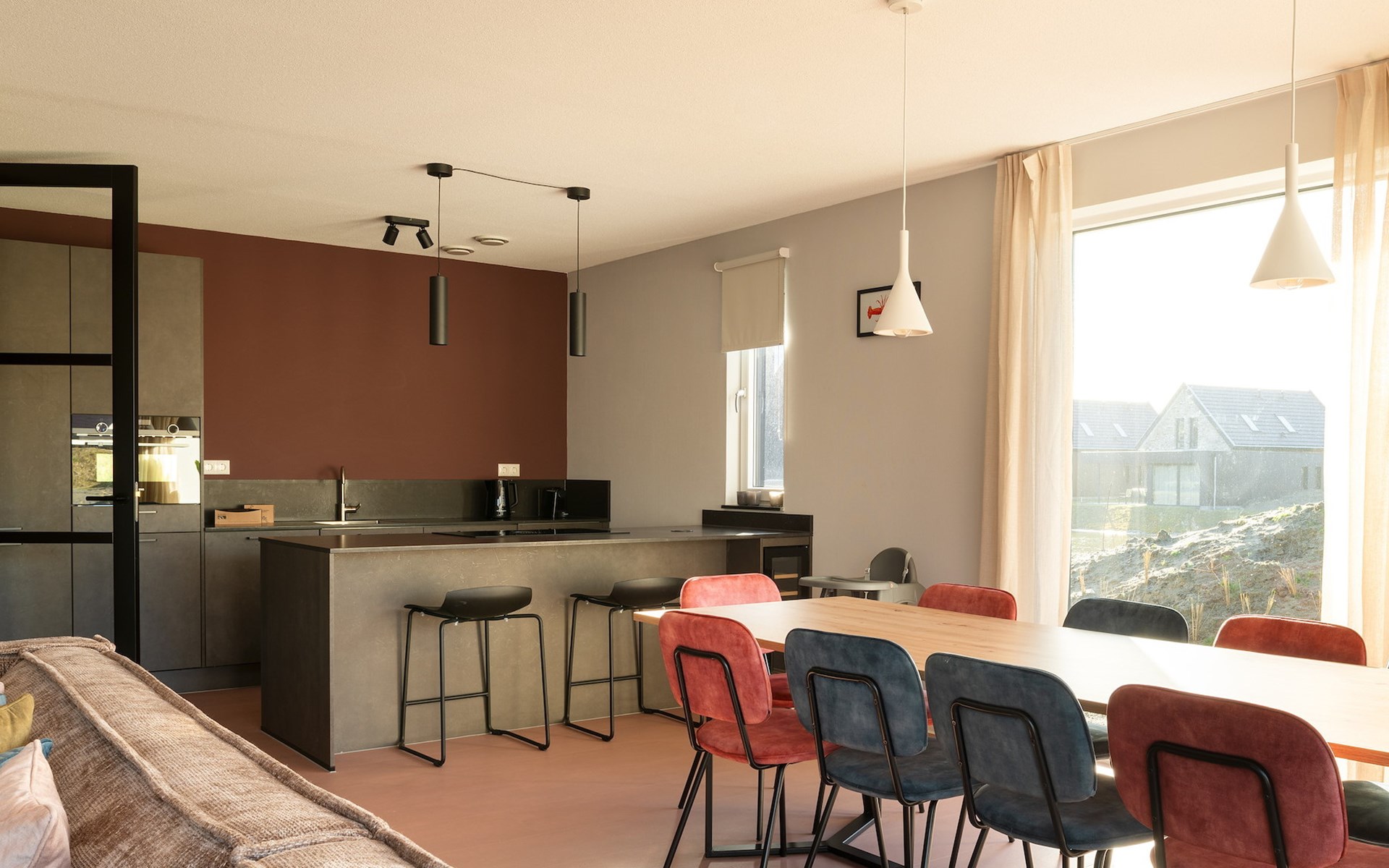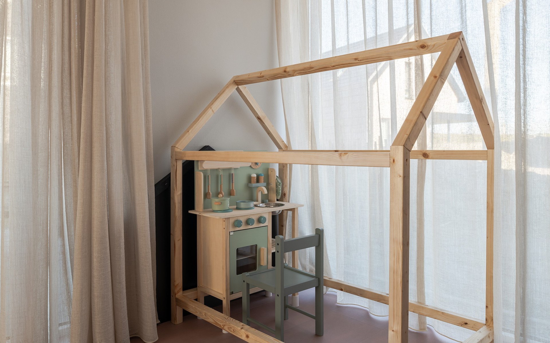 Das großzügige Wohnzimmer verfügt über einen Sitzbereich und einen Smart-TV mit Streaming-Funktion. Es gibt auch einen Essbereich mit Esstisch und einen offenen Spielbereich, in dem Kinder mit einem Spielhaus und verschiedenen Spielelementen viel Spaß haben können. Die luxuriöse offene Küche ist mit einem Bora-Kochfeld, einem Kombiofen, einem Geschirrspüler, einer Nespresso-Maschine und einem Weinkühlschrank komplett ausgestattet.