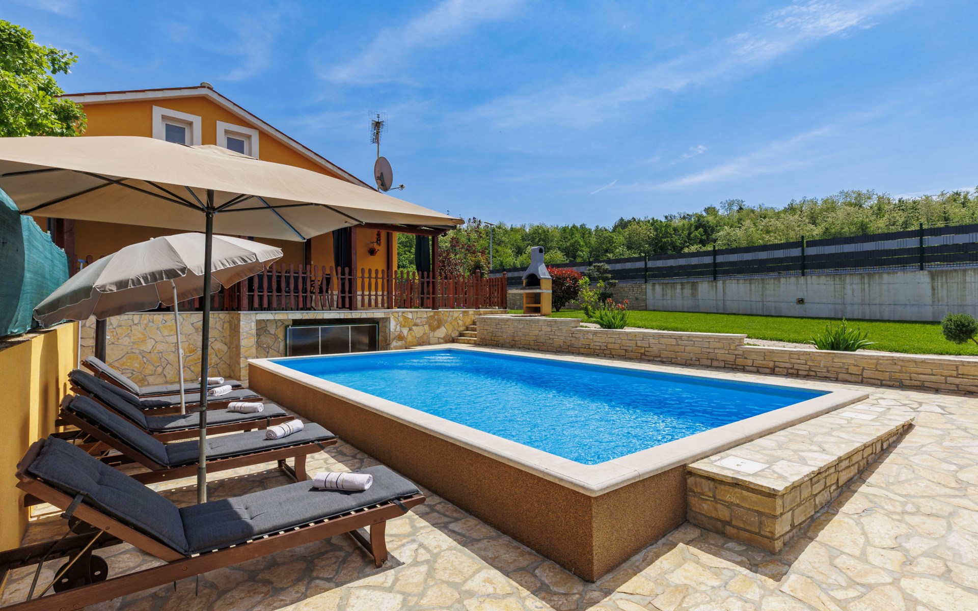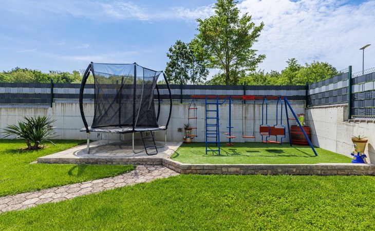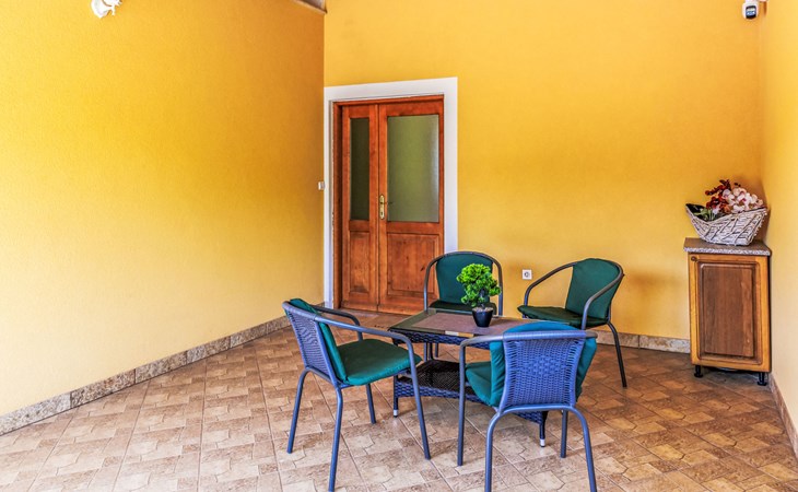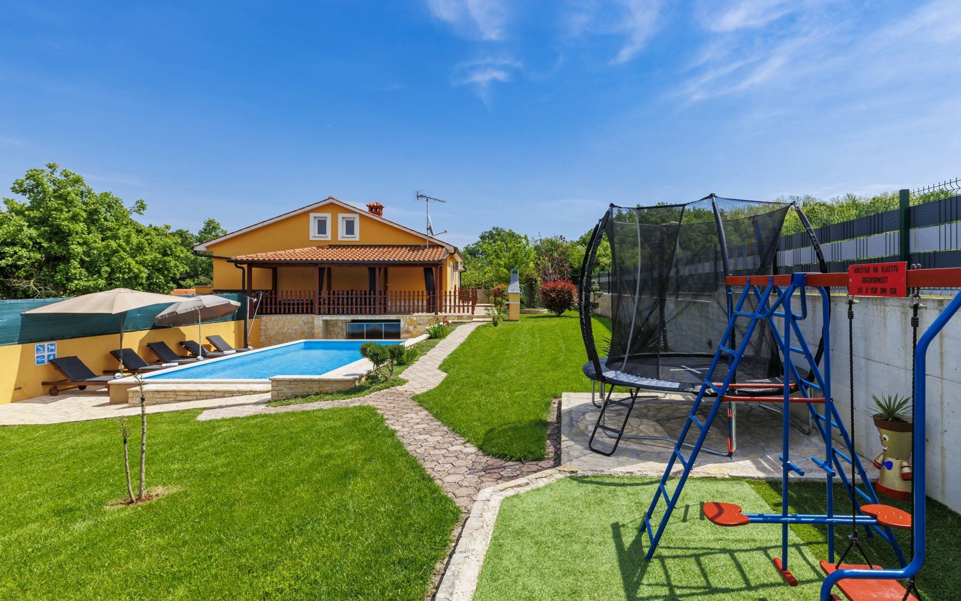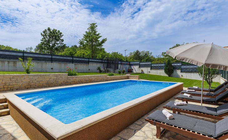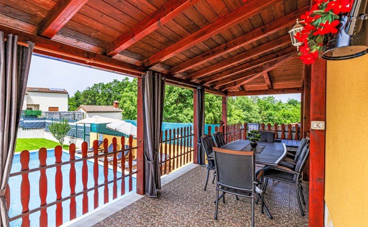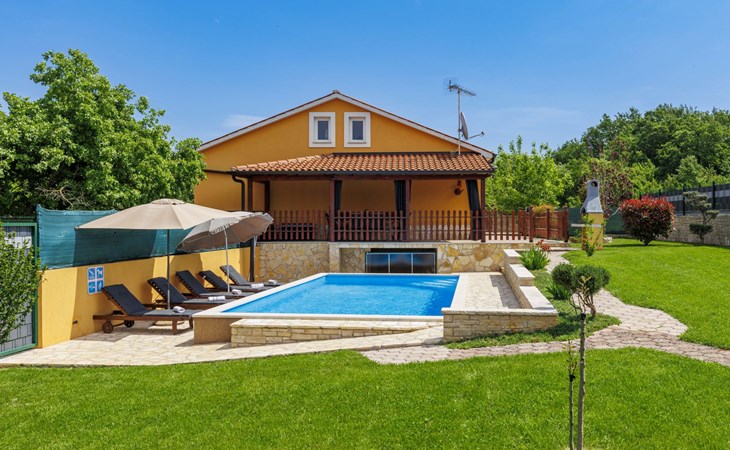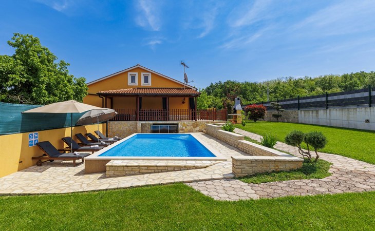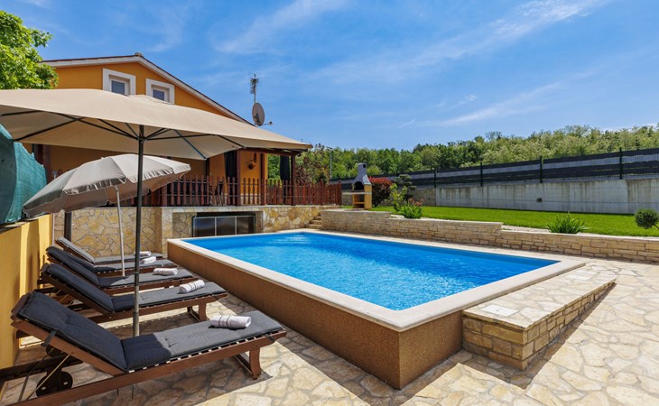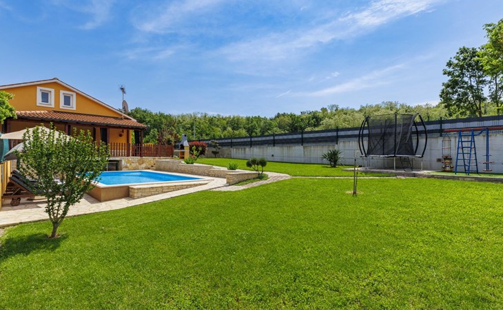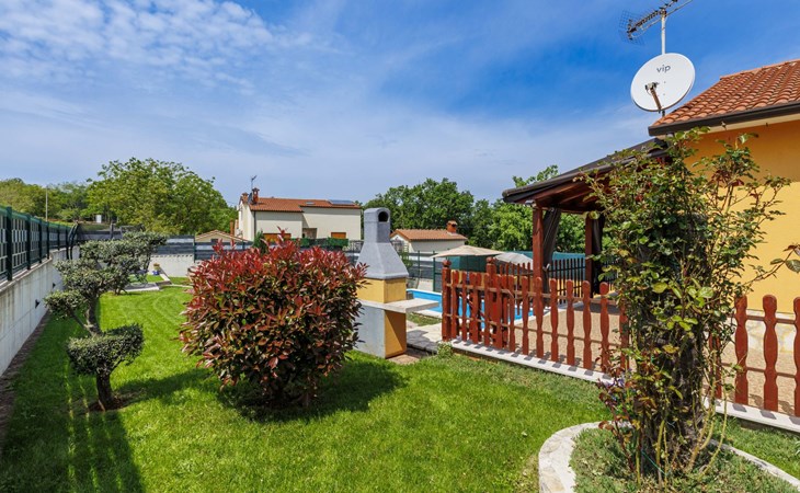 Zweifamilienhaus "Soriso", auf 2 Stockwerken. Im Weiler Rapki, 7 km vom Zentrum von Motovun, 2 km vom Zentrum von Karojba, 19 km vom Zentrum von Poreč, 19 km vom Meer. Zur Alleinbenutzung: Grundstück 450 m2 (eingezäunt) mit Rasen, Schwimmbad eckig (8 x 4 m, 32 m2, 150 cm tief, saisonale Verfügbarkeit: 15.Mai. - 15.Okt.) mit Innentreppe. Aussendusche, Gartenmöbel, Grill, Kinderspielplatz (Schaukel). Im Hause: Internetzugang, Trampolin, Waschmaschine. Parkplatz (für 2 Autos) beim Haus auf dem Grundstück. Einkaufsgeschäft 2 km, Restaurant 2 km, Bushaltestelle 18 km, Bahnstation 18 km, Kieselstrand 19 km. Der Besitzer akzeptiert keine Jugendgruppen. Bitte beachten: Der Besitzer wohnt im selben Haus. Videoüberwachung der Einfahrt und des Parkplatzes.