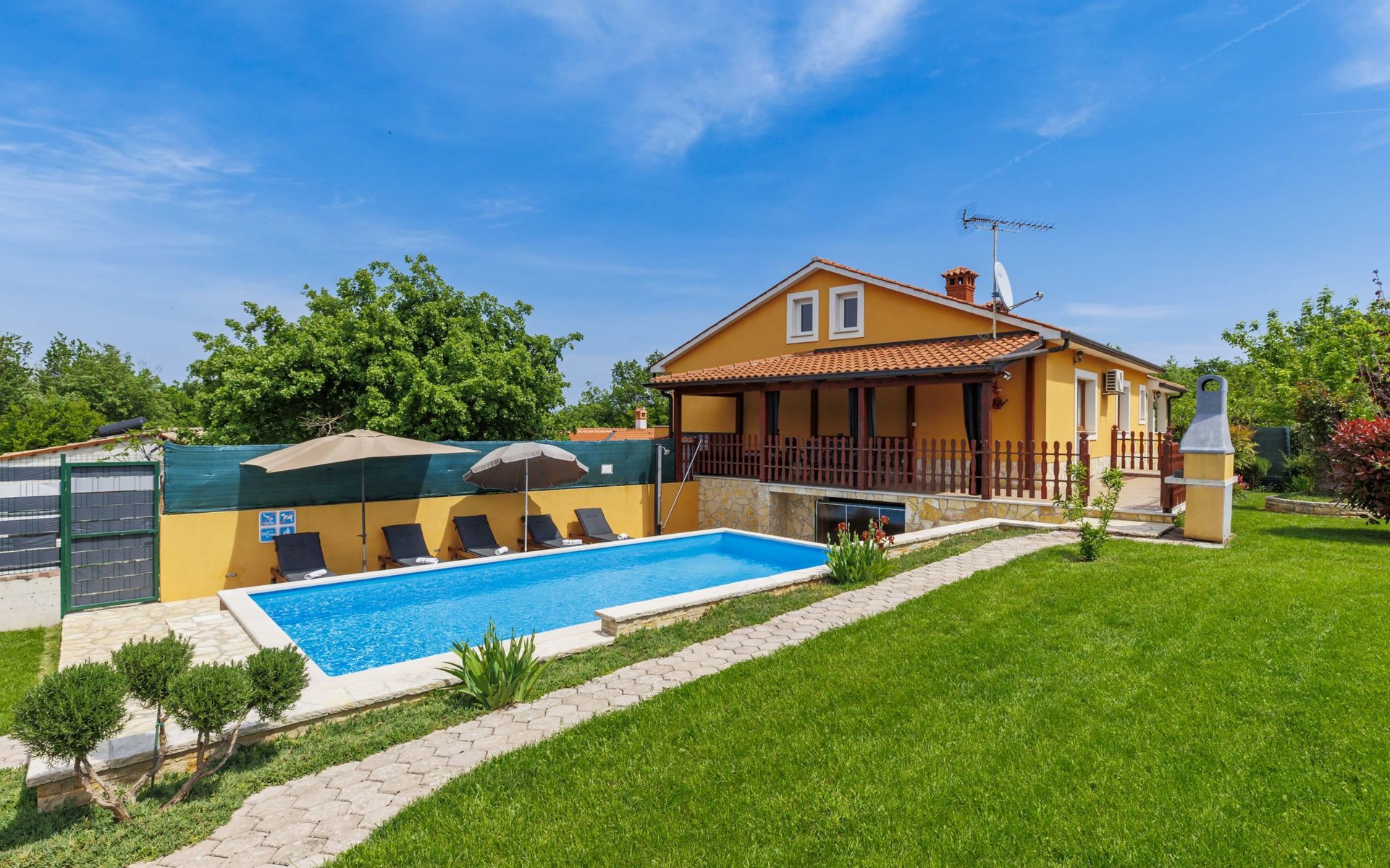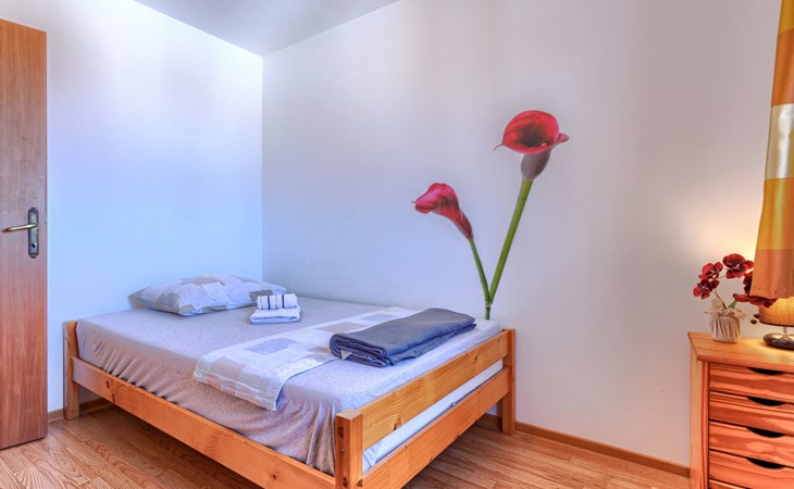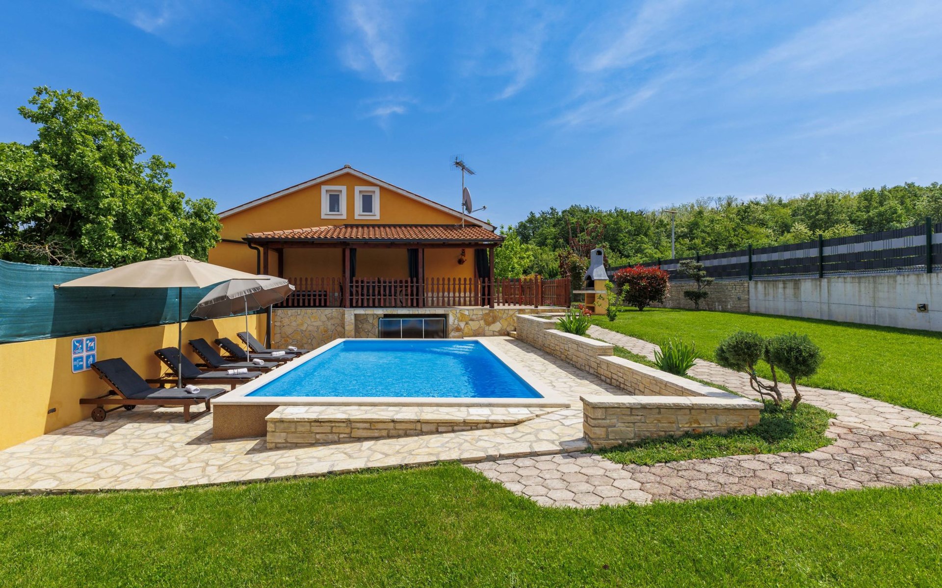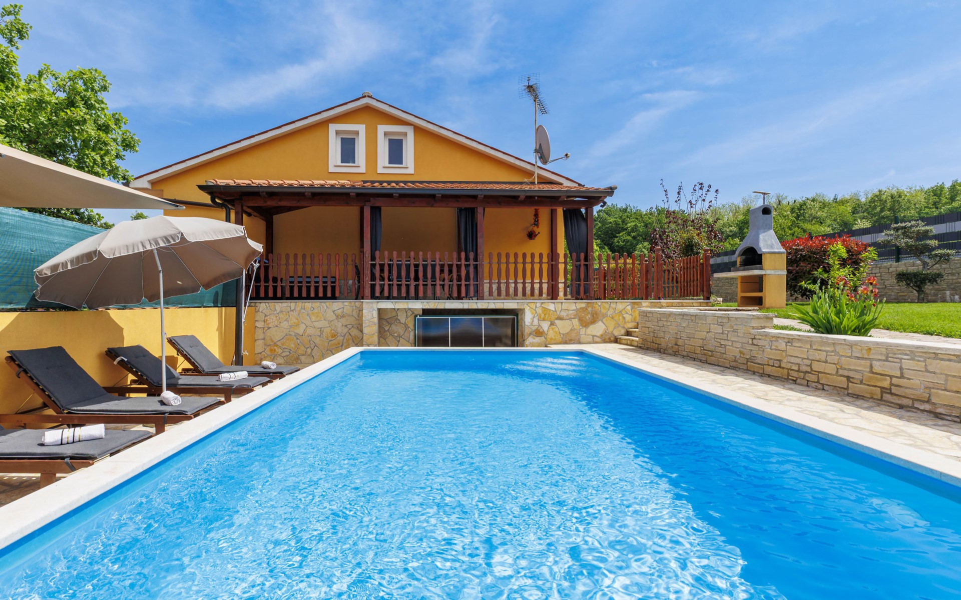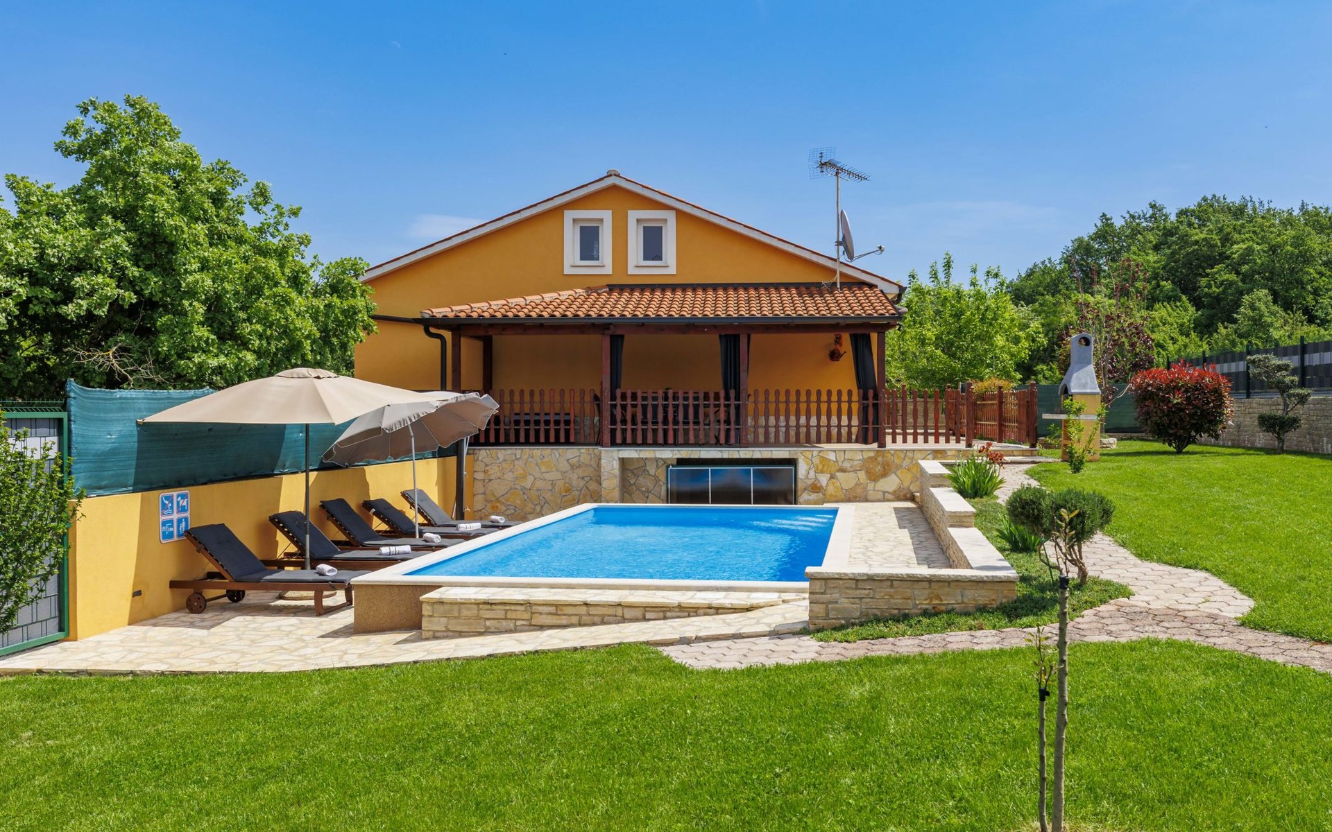 Zweifamilienhaus "Soriso", auf 2 Stockwerken. Im Weiler Rapki, 7 km vom Zentrum von Motovun, 2 km vom Zentrum von Karojba, 19 km vom Zentrum von Poreč, 19 km vom Meer. Zur Alleinbenutzung: Grundstück 450 m2 (eingezäunt) mit Rasen, Schwimmbad eckig (8 x 4 m, 32 m2, 150 cm tief, saisonale Verfügbarkeit: 15.Mai. - 15.Okt.) mit Innentreppe. Aussendusche, Gartenmöbel, Grill, Kinderspielplatz (Schaukel). Im Hause: Internetzugang, Trampolin, Waschmaschine. Parkplatz (für 2 Autos) beim Haus auf dem Grundstück. Einkaufsgeschäft 2 km, Restaurant 2 km, Bushaltestelle 18 km, Bahnstation 18 km, Kieselstrand 19 km. Der Besitzer akzeptiert keine Jugendgruppen. Bitte beachten: Der Besitzer wohnt im selben Haus. Videoüberwachung der Einfahrt und des Parkplatzes.