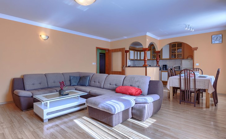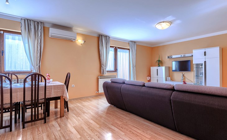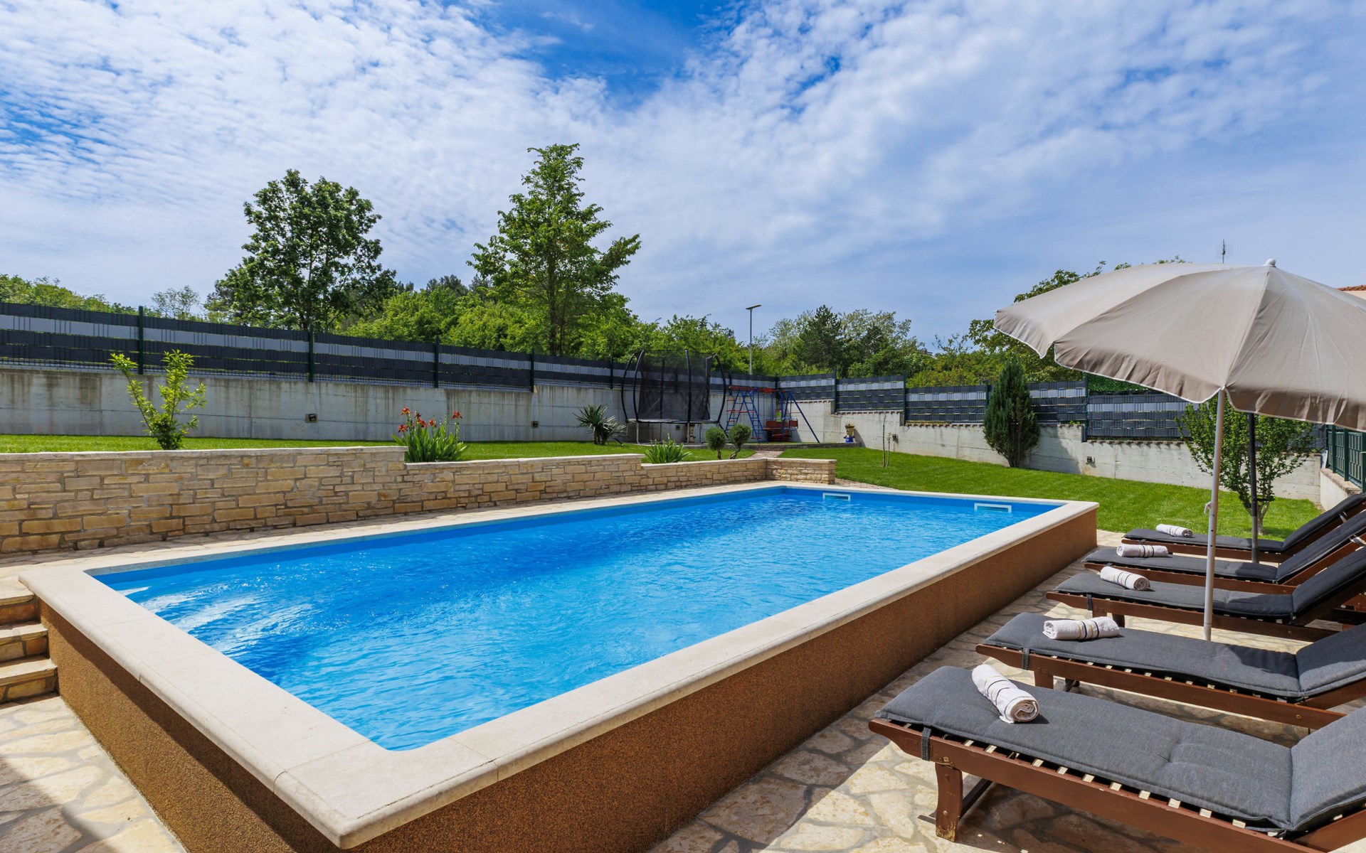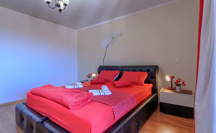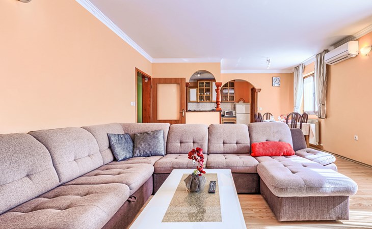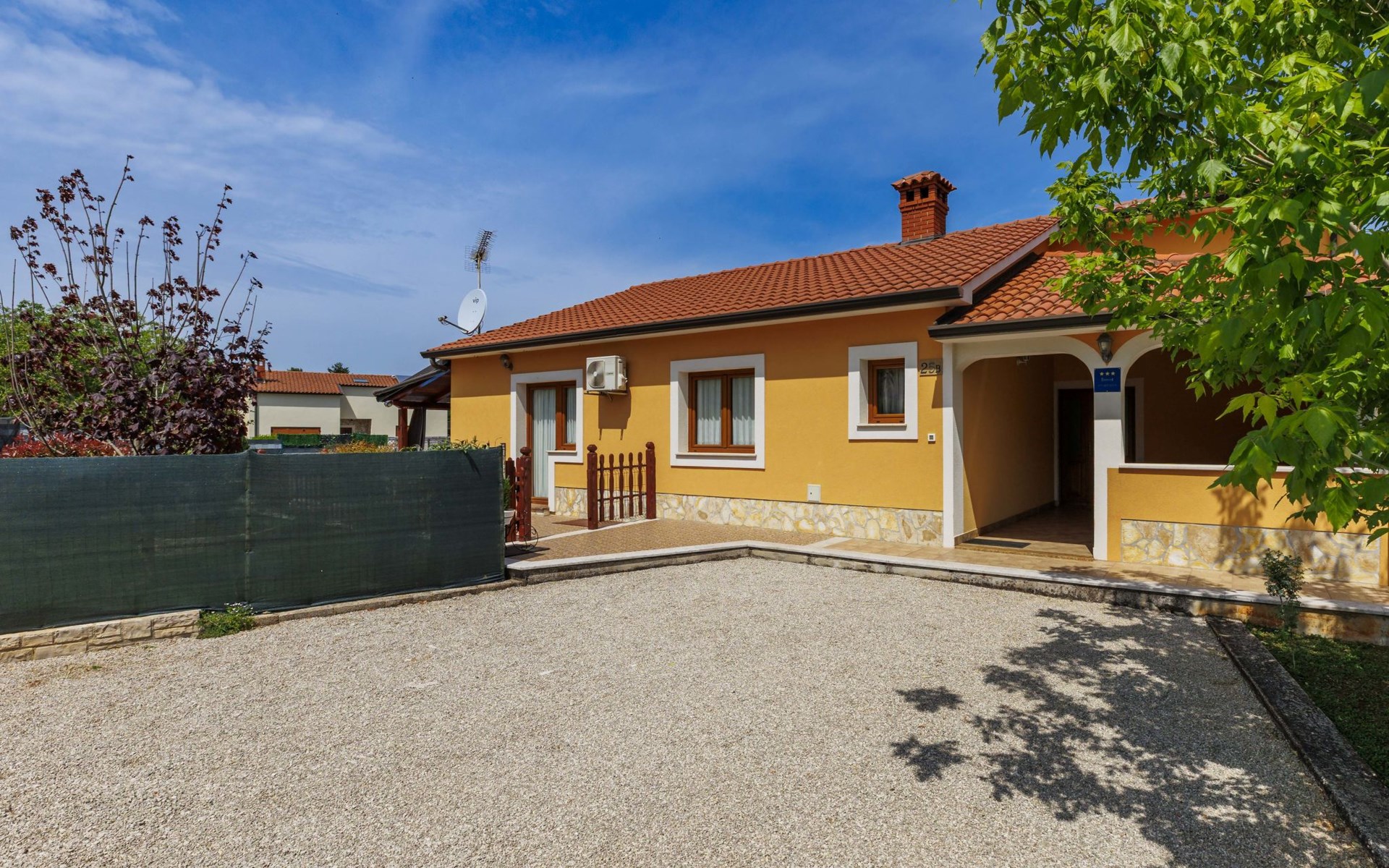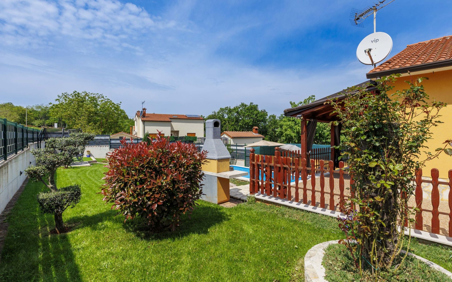 Zweifamilienhaus "Soriso", auf 2 Stockwerken. Im Weiler Rapki, 7 km vom Zentrum von Motovun, 2 km vom Zentrum von Karojba, 19 km vom Zentrum von Poreč, 19 km vom Meer. Zur Alleinbenutzung: Grundstück 450 m2 (eingezäunt) mit Rasen, Schwimmbad eckig (8 x 4 m, 32 m2, 150 cm tief, saisonale Verfügbarkeit: 15.Mai. - 15.Okt.) mit Innentreppe. Aussendusche, Gartenmöbel, Grill, Kinderspielplatz (Schaukel). Im Hause: Internetzugang, Trampolin, Waschmaschine. Parkplatz (für 2 Autos) beim Haus auf dem Grundstück. Einkaufsgeschäft 2 km, Restaurant 2 km, Bushaltestelle 18 km, Bahnstation 18 km, Kieselstrand 19 km. Der Besitzer akzeptiert keine Jugendgruppen. Bitte beachten: Der Besitzer wohnt im selben Haus. Videoüberwachung der Einfahrt und des Parkplatzes.