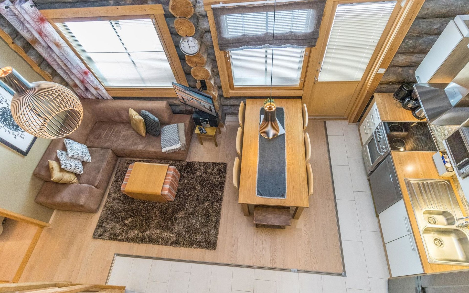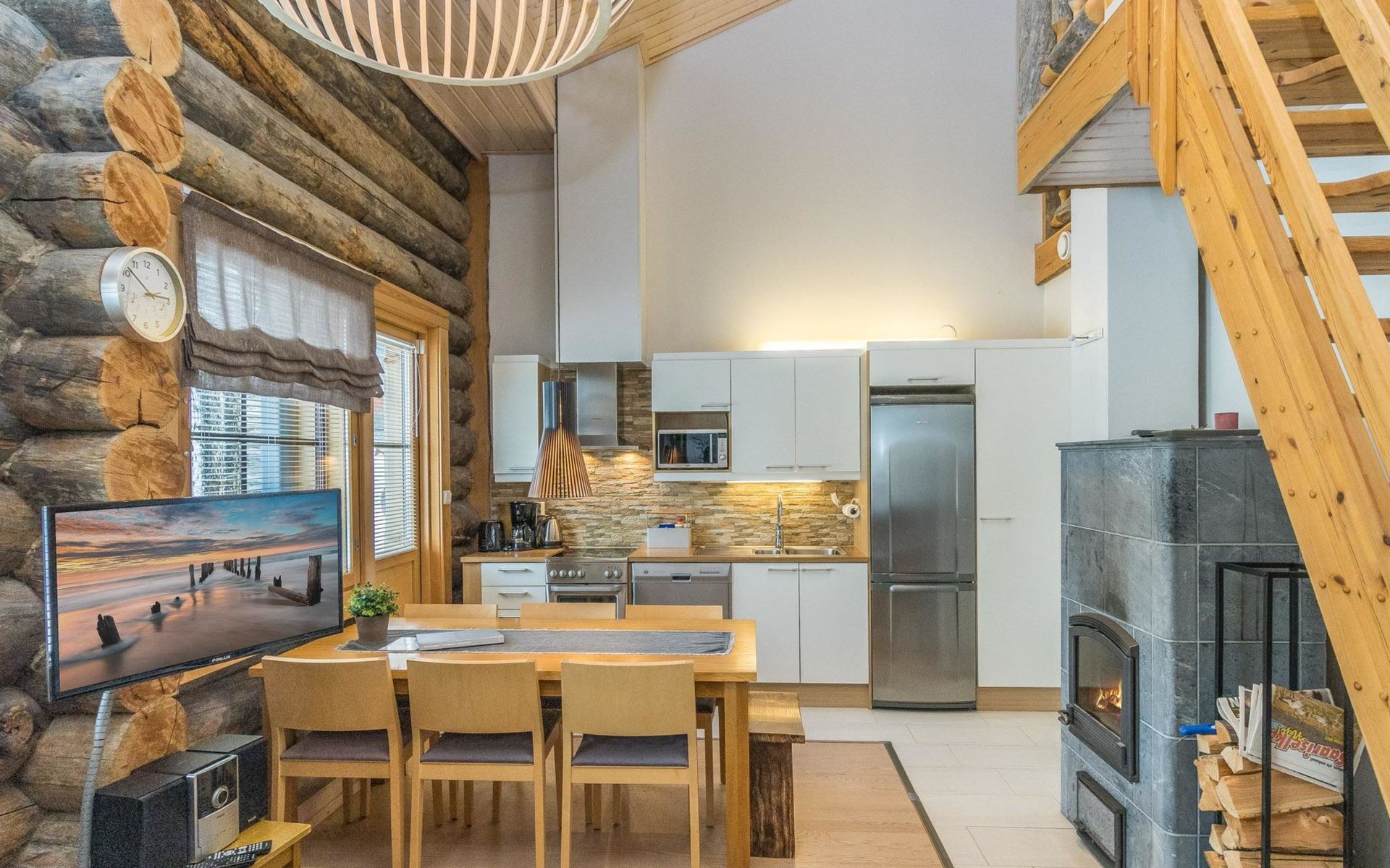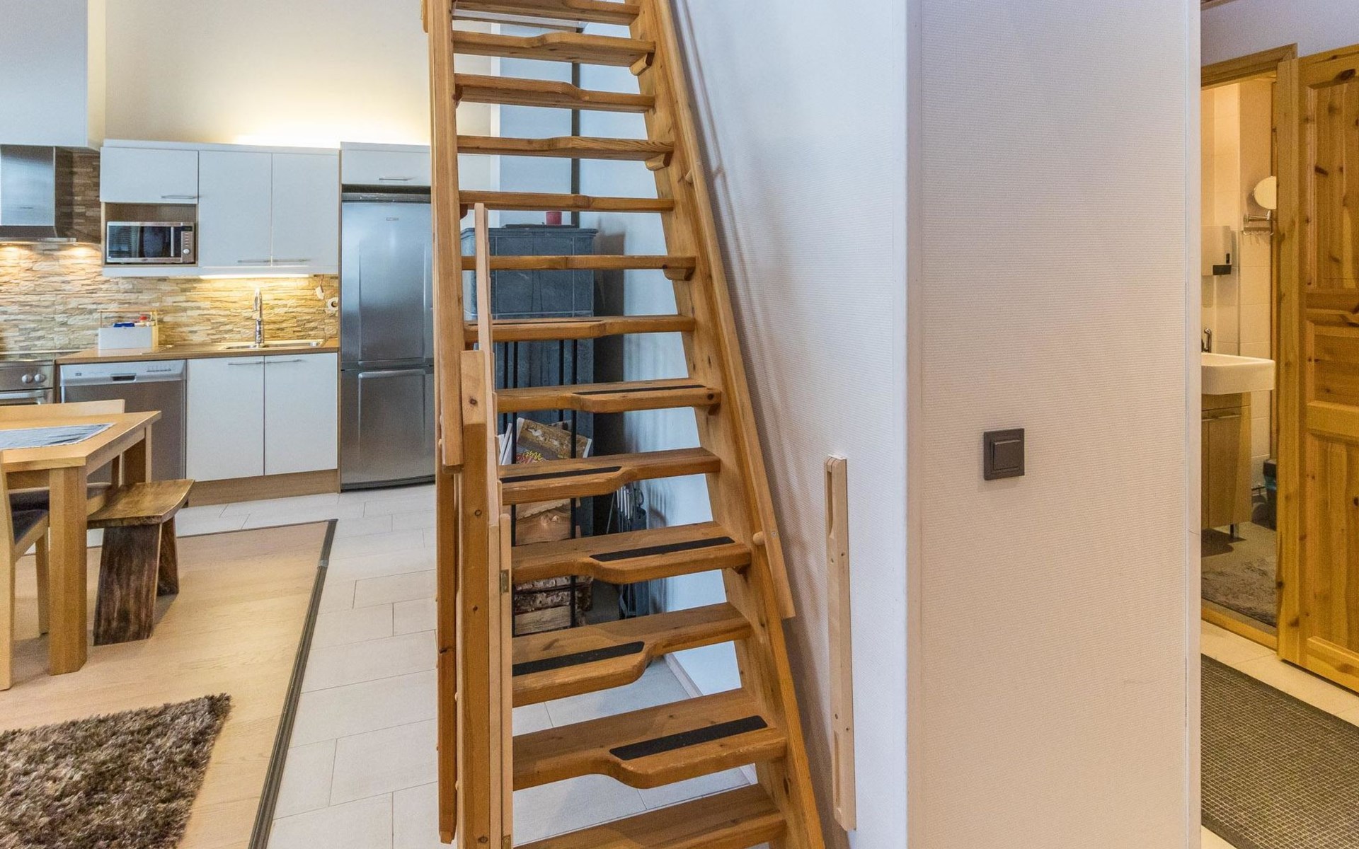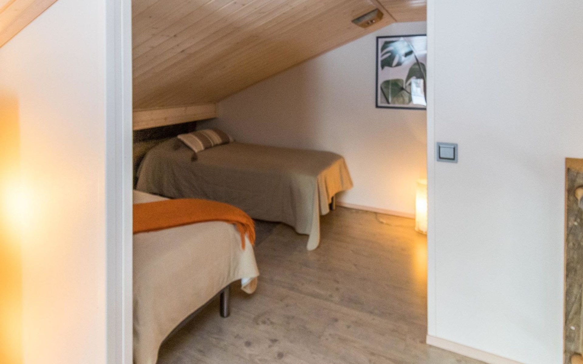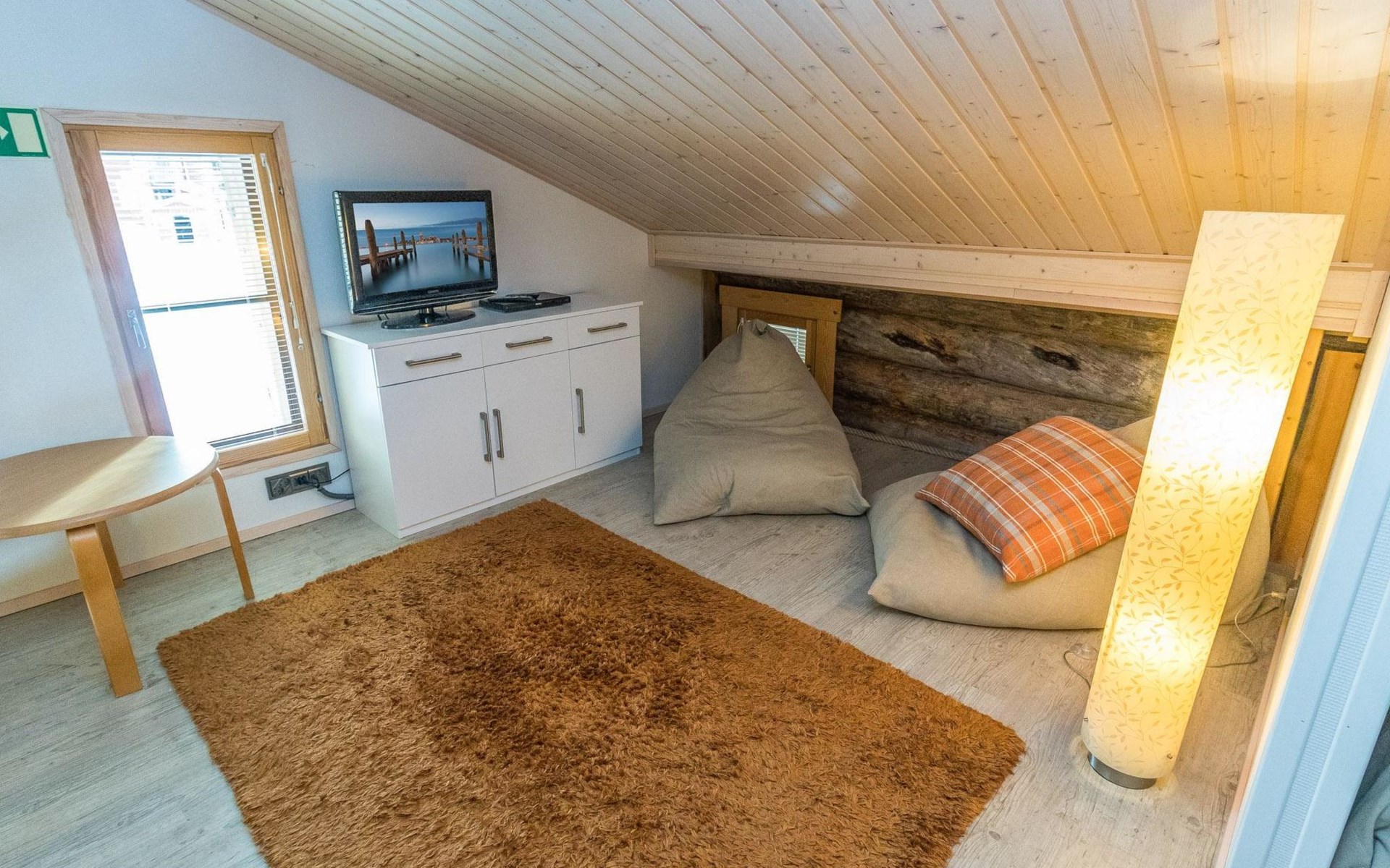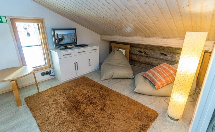 On the entrance floor there are two bedrooms, each with two beds. Additional sleeping accommodation is available on the loft, where there is an alcove with two beds. In addition to the alcove, the loft has a TV, DVD, sitting area with two beanbag chairs.