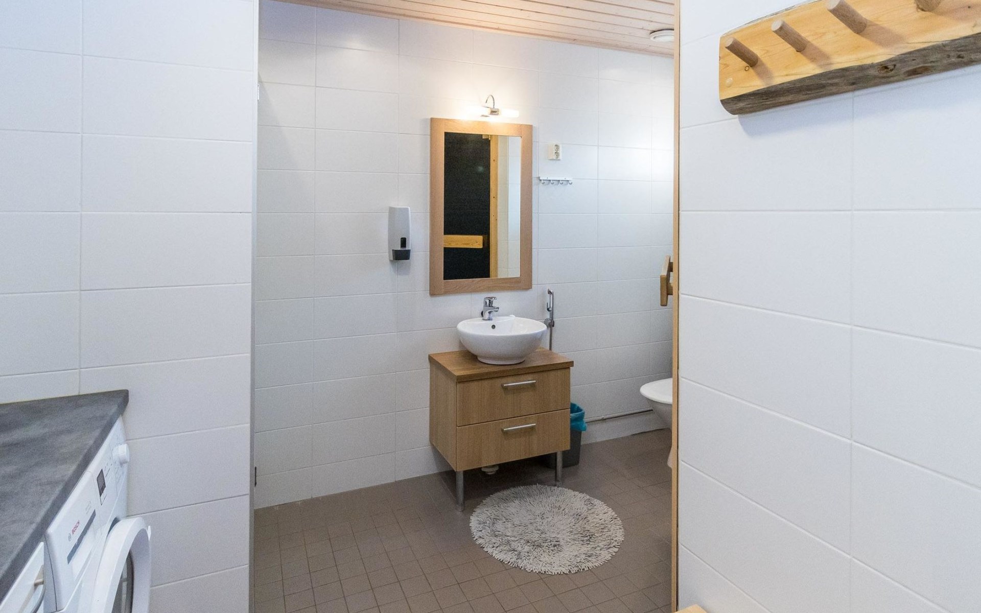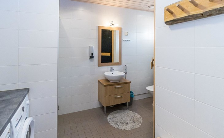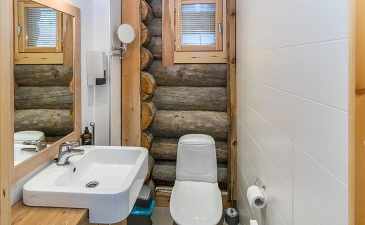 The apartment has two toilets, one of them is in the washroom.