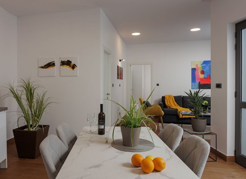 Mastrinka (Čiovo) 4 km von Trogir: Mehrfamilienhaus "Vinka". Sonnige Lage, 30 m vom Meer, 30 m vom Strand, Strasse zu überqueren, an einer Strasse. Zur Mitbenutzung: Grundstück 500 m2. Grill. Im Hause: Internetzugang, Waschmaschine (extra) (zur Mitbenutzung). Öffentliche Parkplätze auf der Strasse. Einkaufsgeschäft, Restaurant 800 m, Bushaltestelle 240 m, Kieselstrand, Felsstrand 30 m. Bitte beachten: private Bootsanlegestelle (extra) auf Anfrage. Flugplatz 5.5 km vom Haus.