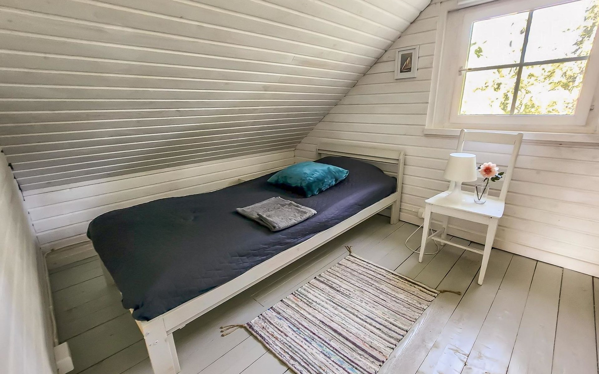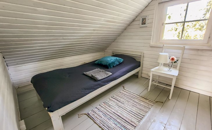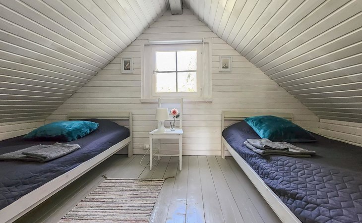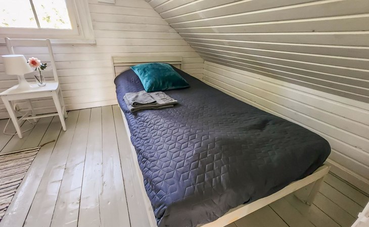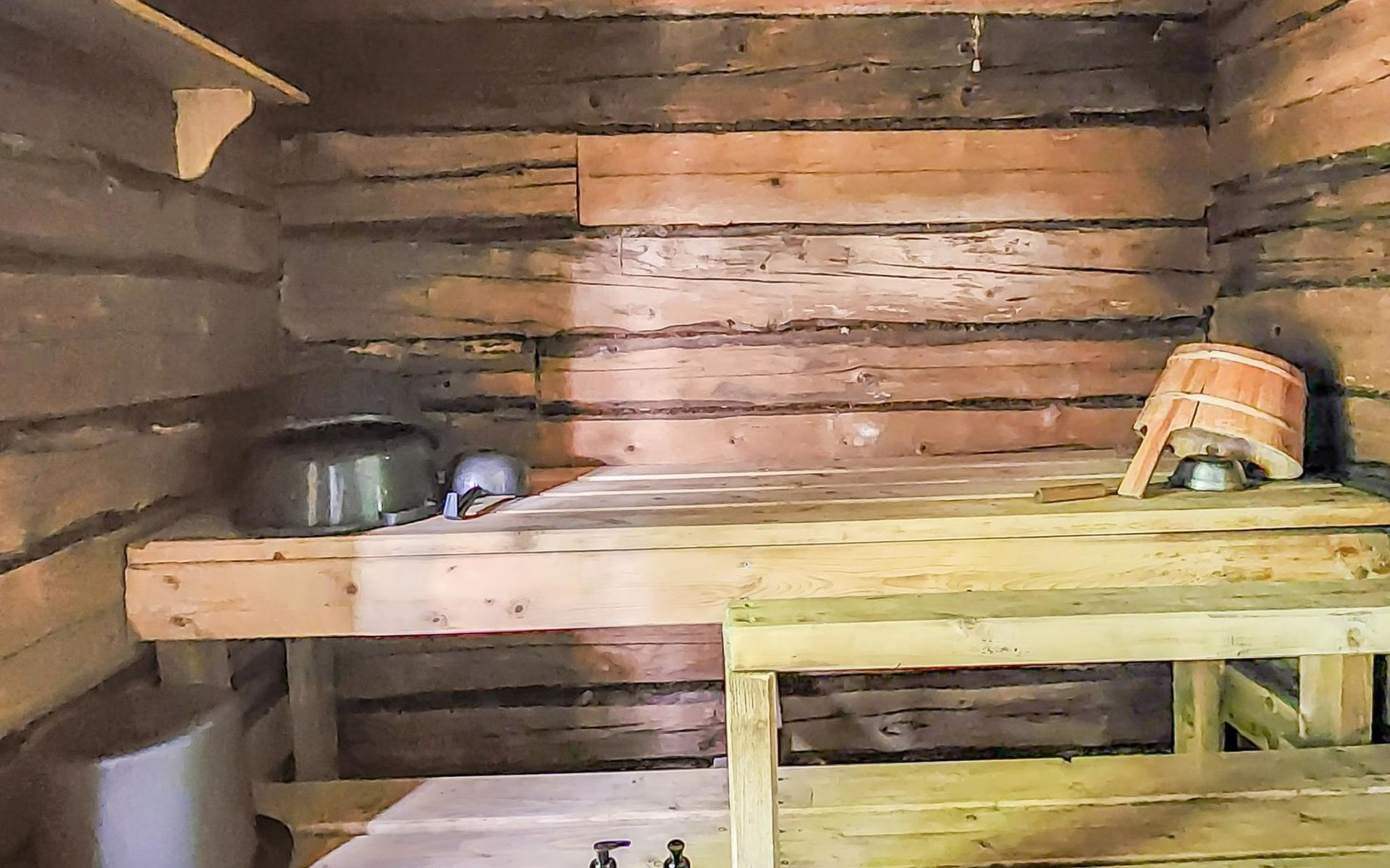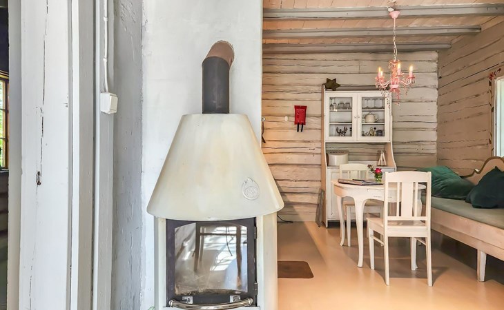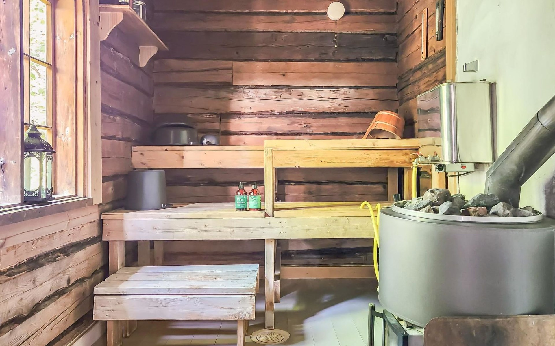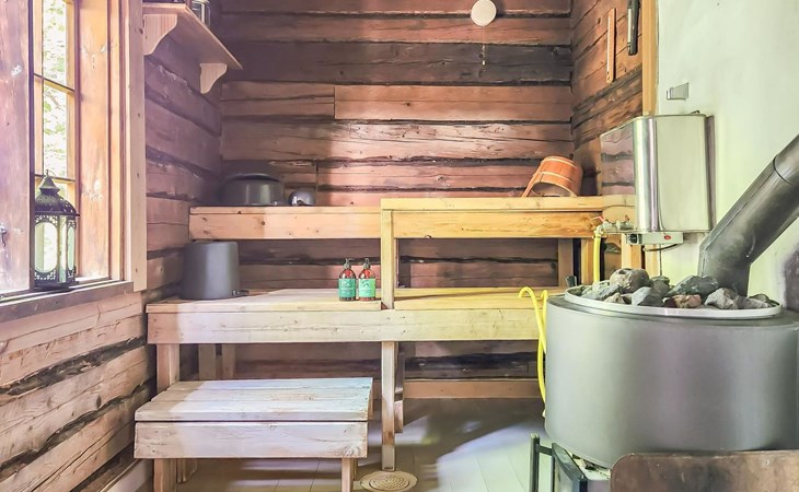 An atmospheric log cabin with a fireplace that you can enjoy in cooler weather. The kitchen has a gas stove and oven, as well as other cooking equipment. From the living room you can access a large glass-covered terrace, where you can enjoy your morning coffee even in the rain. Upstairs, the cabin has sleeping accommodations for four people in separate beds. The beds are 200 cm x 80 cm. In connection with the cabin, there is a large old-fashioned wood-heated sauna with washing facilities.