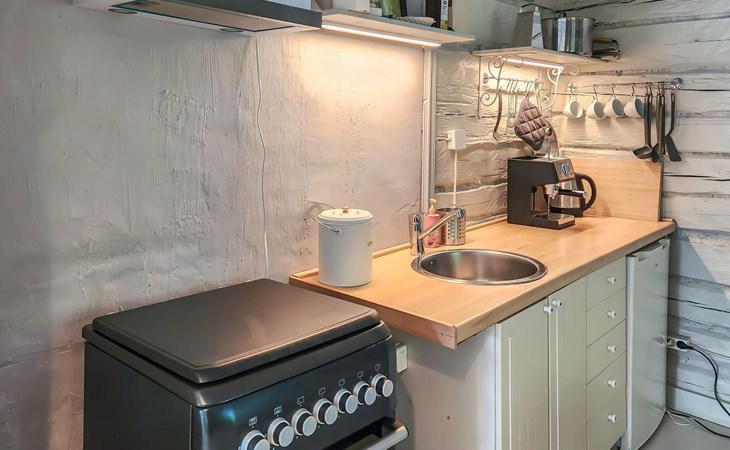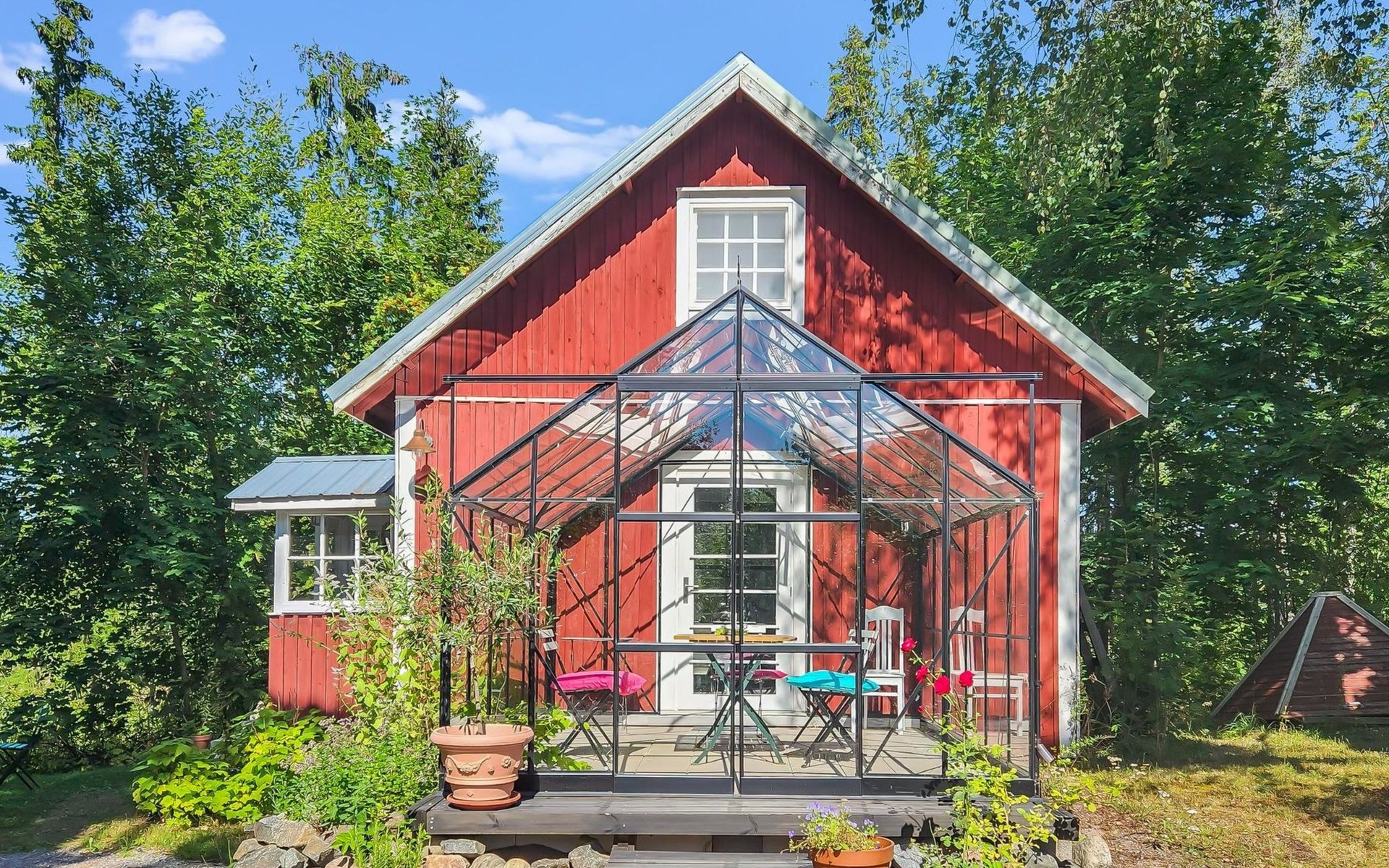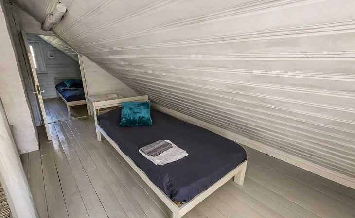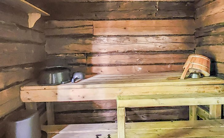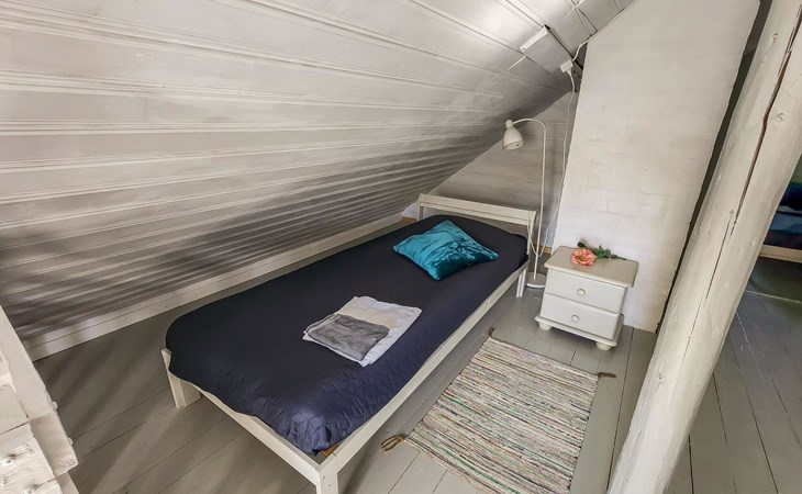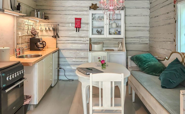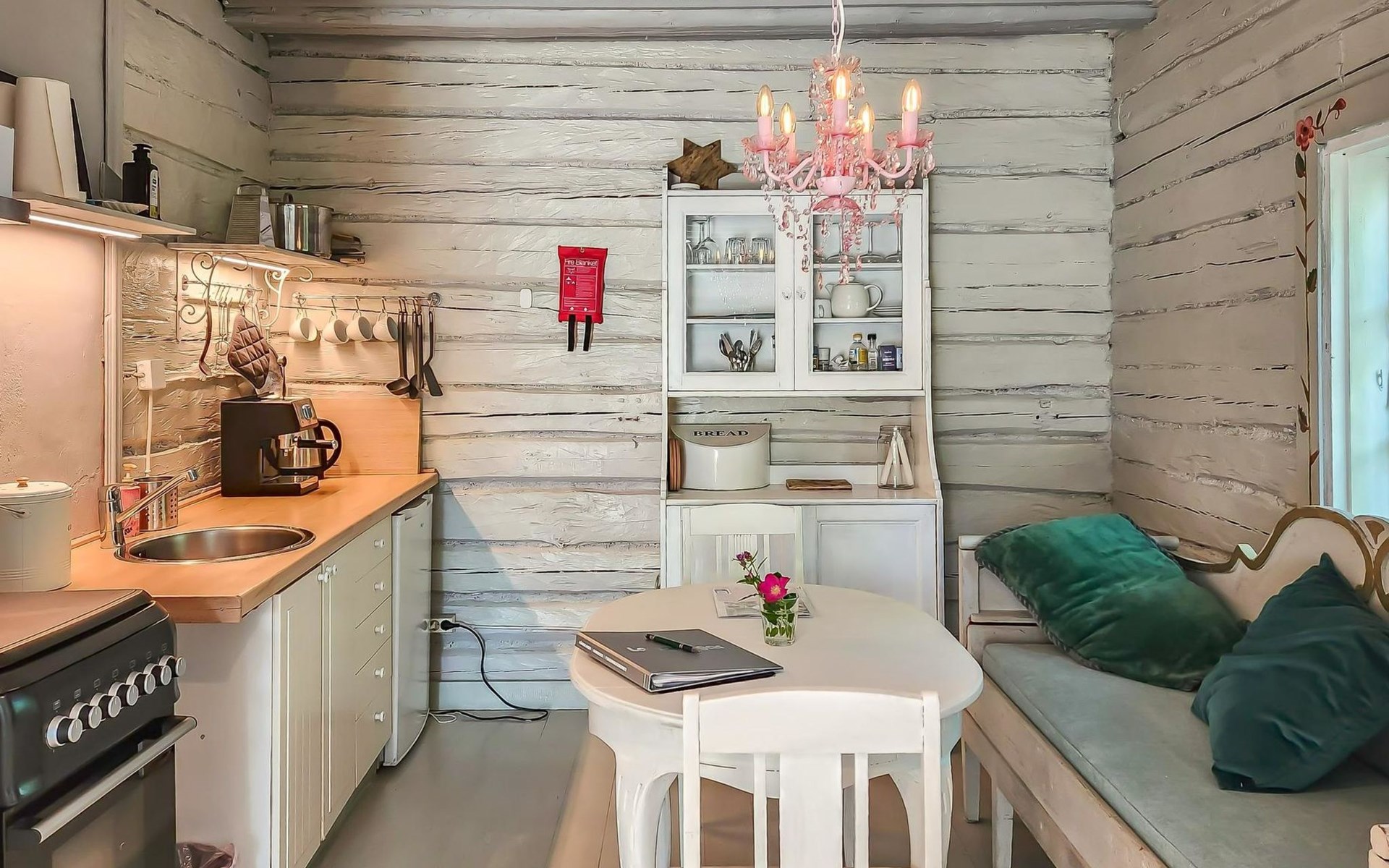 An atmospheric log cabin with a fireplace that you can enjoy in cooler weather. The kitchen has a gas stove and oven, as well as other cooking equipment. From the living room you can access a large glass-covered terrace, where you can enjoy your morning coffee even in the rain. Upstairs, the cabin has sleeping accommodations for four people in separate beds. The beds are 200 cm x 80 cm. In connection with the cabin, there is a large old-fashioned wood-heated sauna with washing facilities.