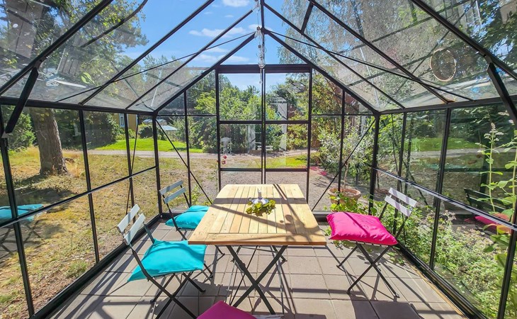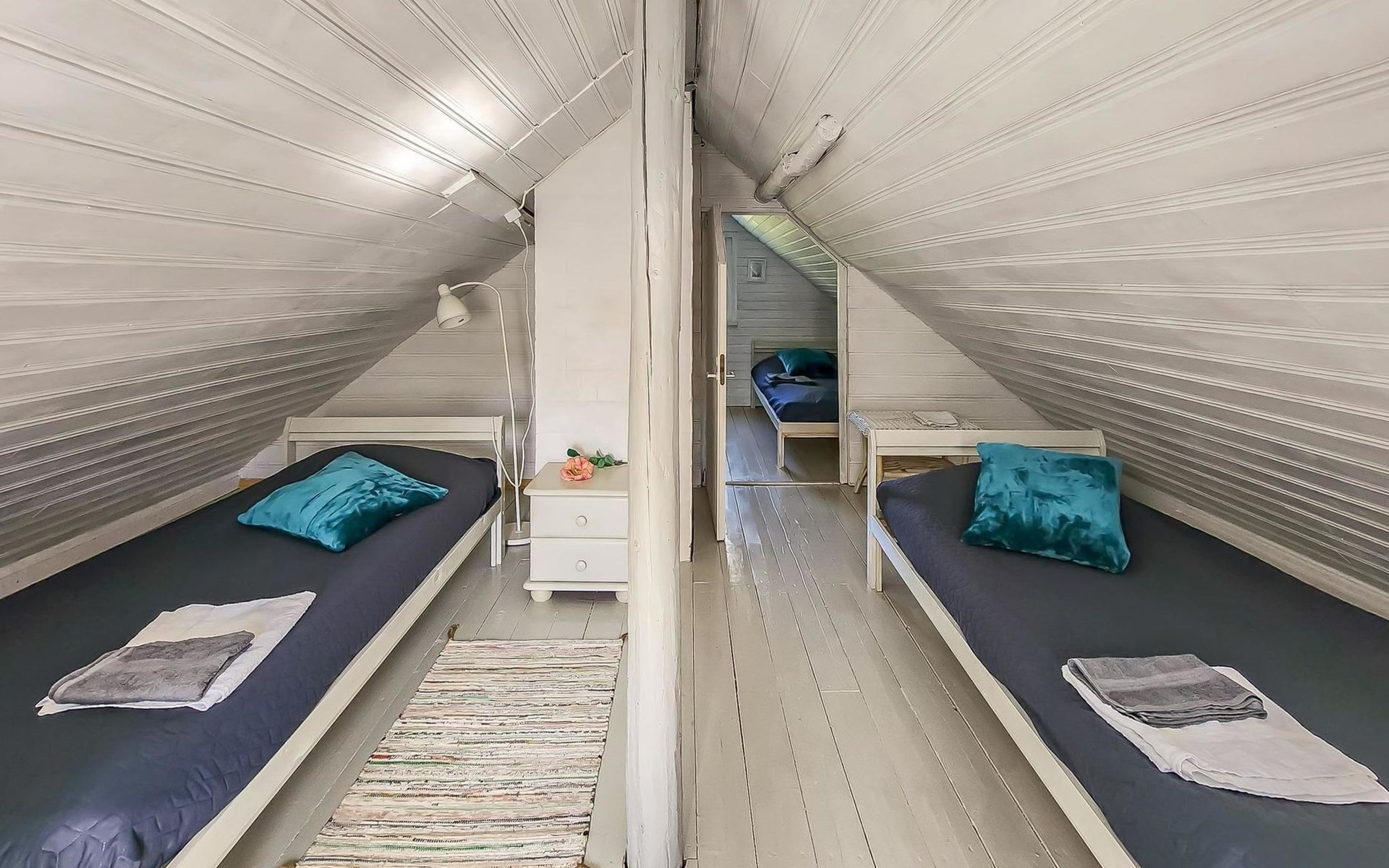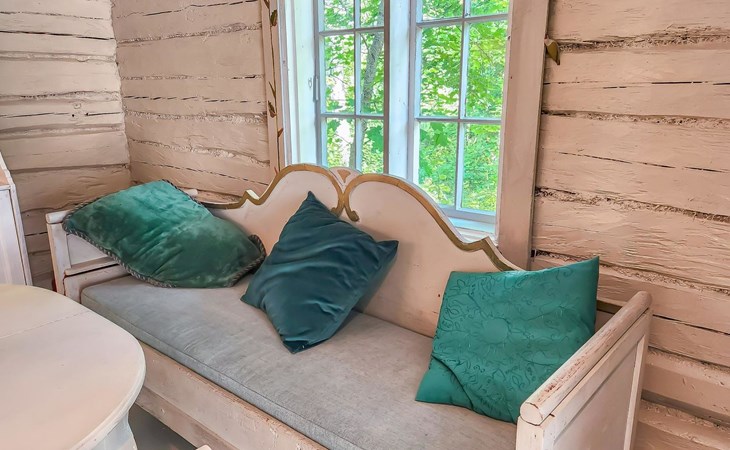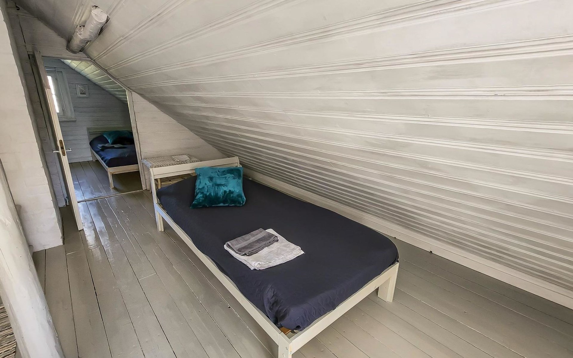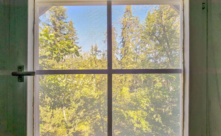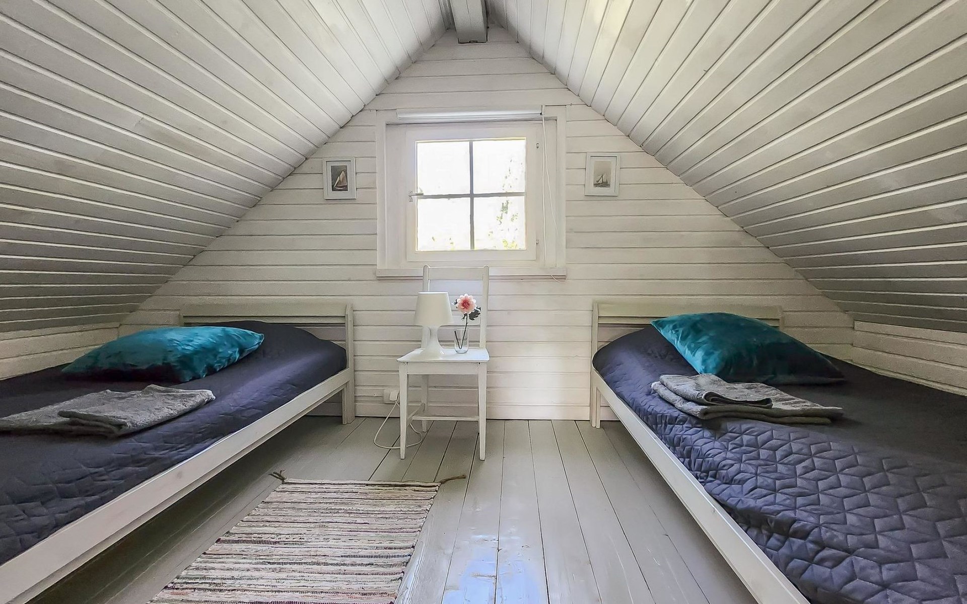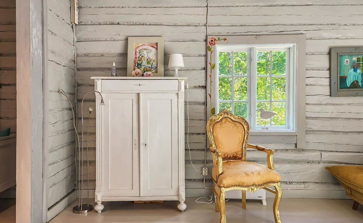 An atmospheric log cabin with a fireplace that you can enjoy in cooler weather. The kitchen has a gas stove and oven, as well as other cooking equipment. From the living room you can access a large glass-covered terrace, where you can enjoy your morning coffee even in the rain. Upstairs, the cabin has sleeping accommodations for four people in separate beds. The beds are 200 cm x 80 cm. In connection with the cabin, there is a large old-fashioned wood-heated sauna with washing facilities.