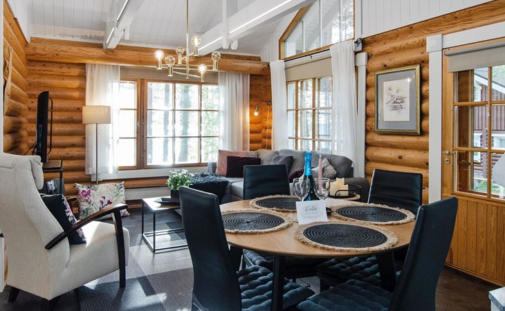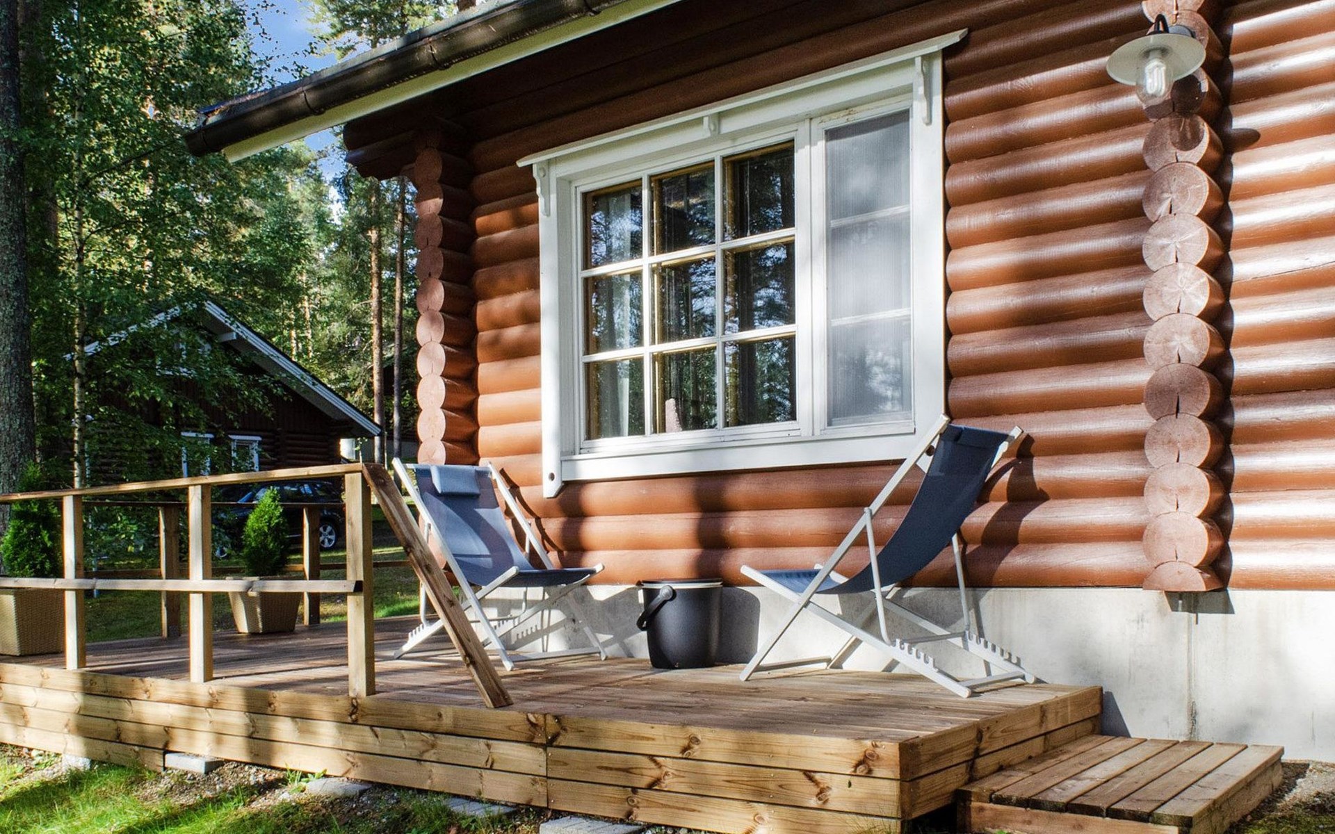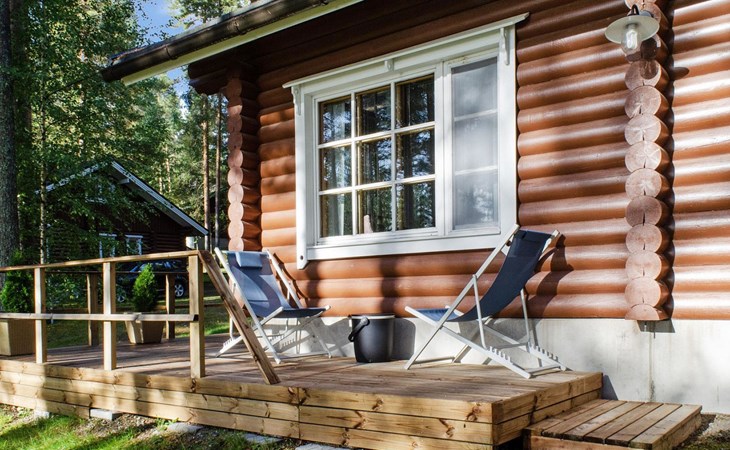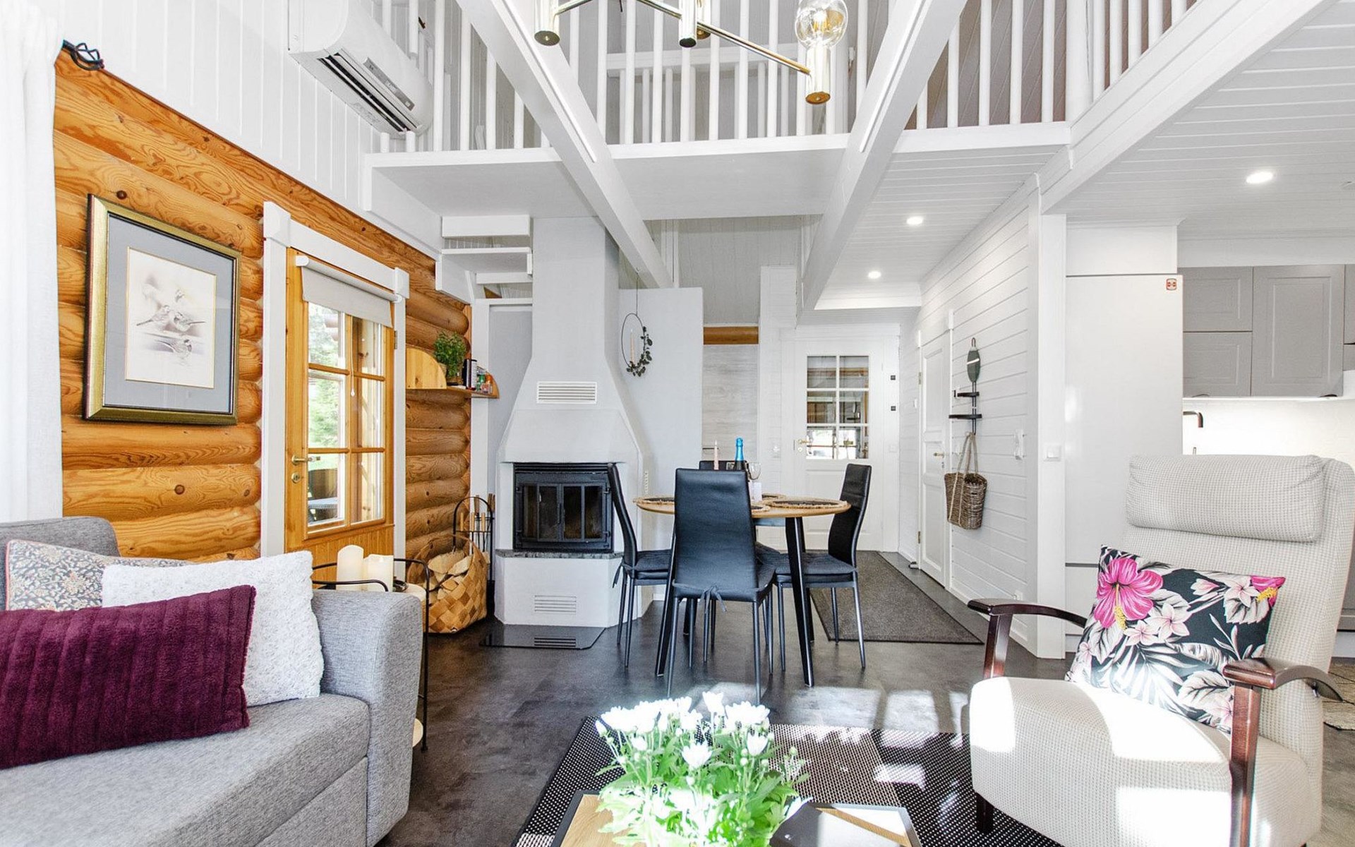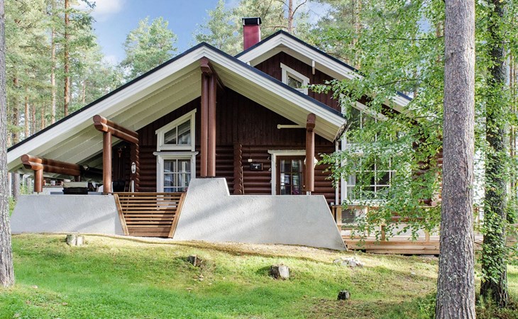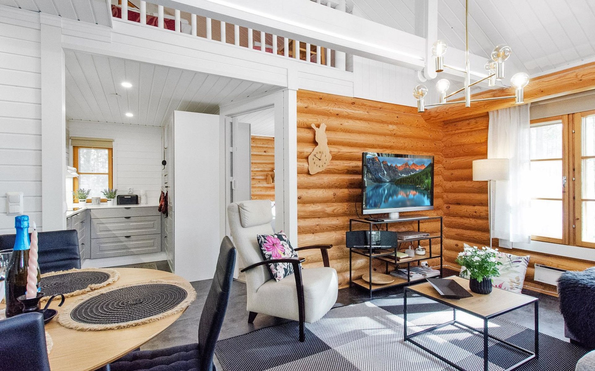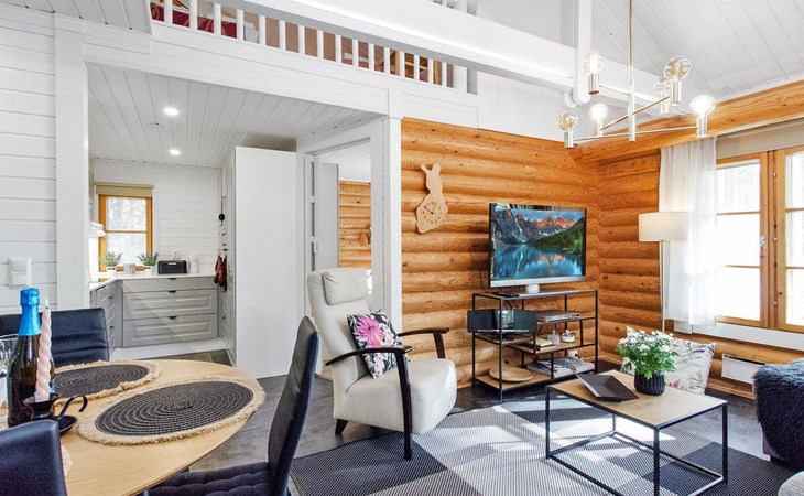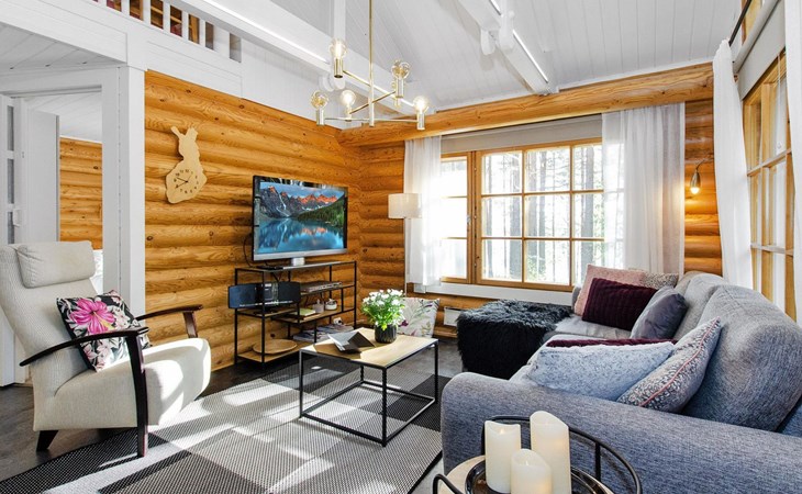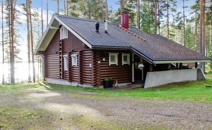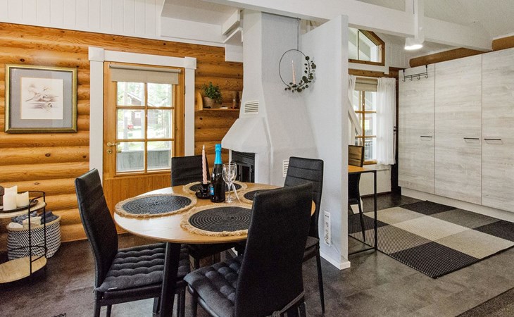 This round log cabin was built in 1990 and renovated/refurnished in 2021. Terrace was expanded in 2022. The cabin has a living room/kitchen, bedroom with double bed, loft (18 m²) with 4 beds, washroom, electric sauna, and terrace.