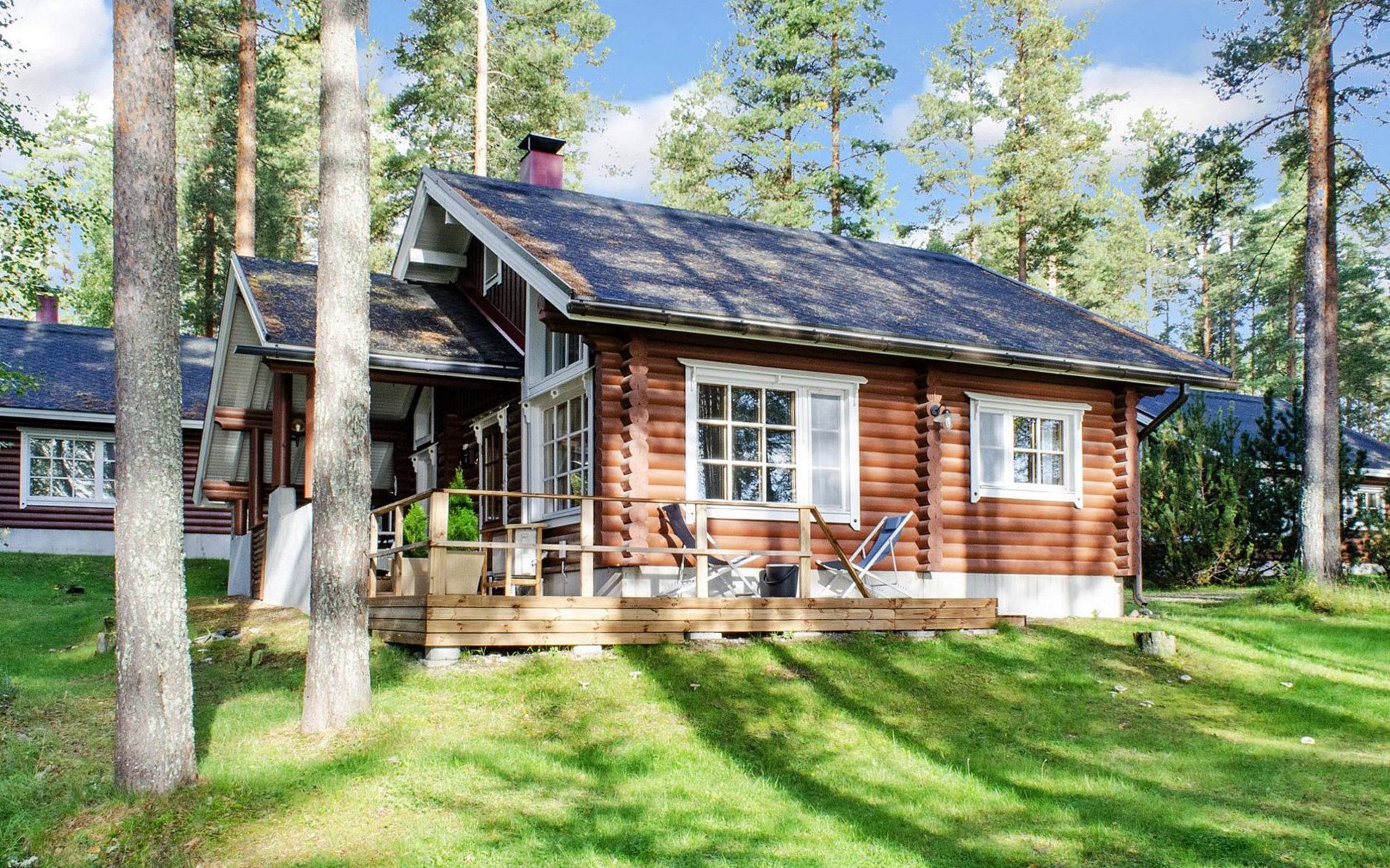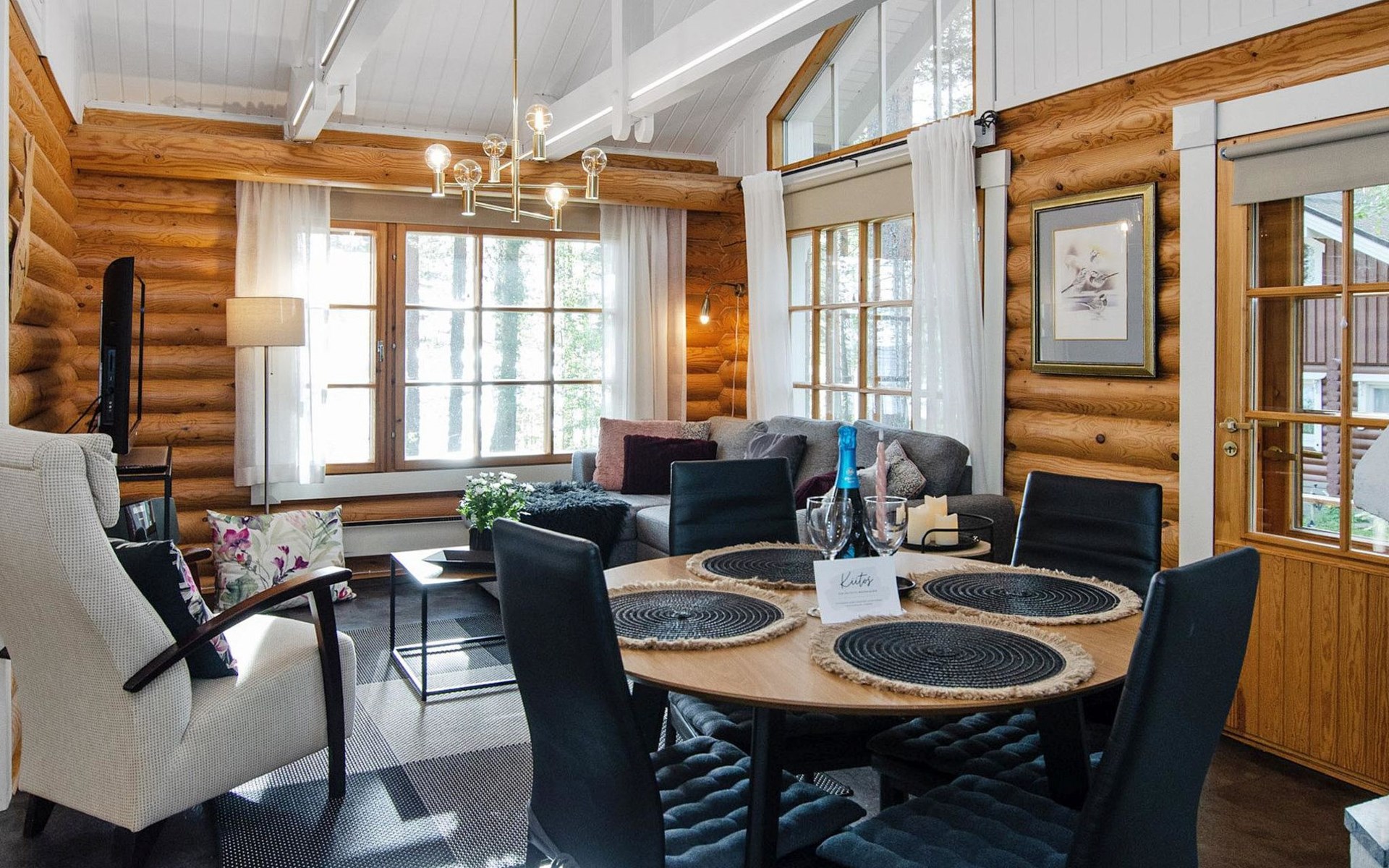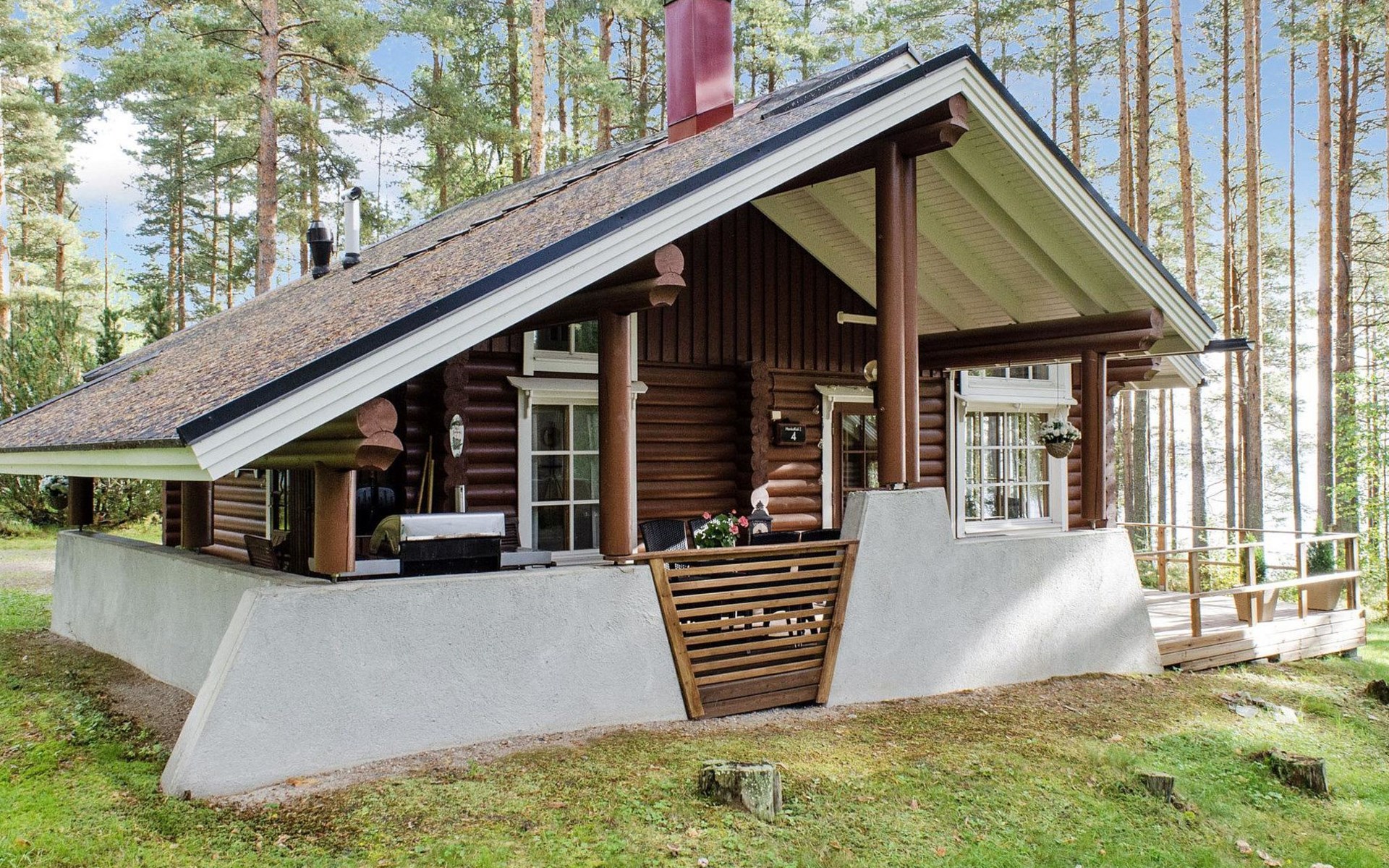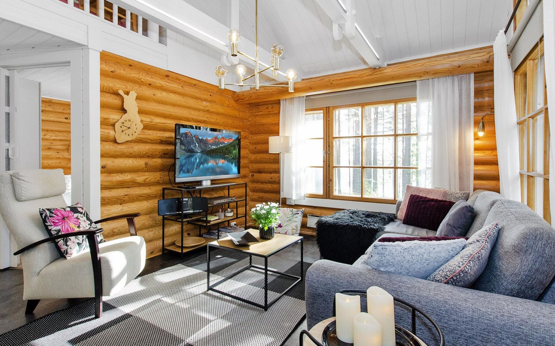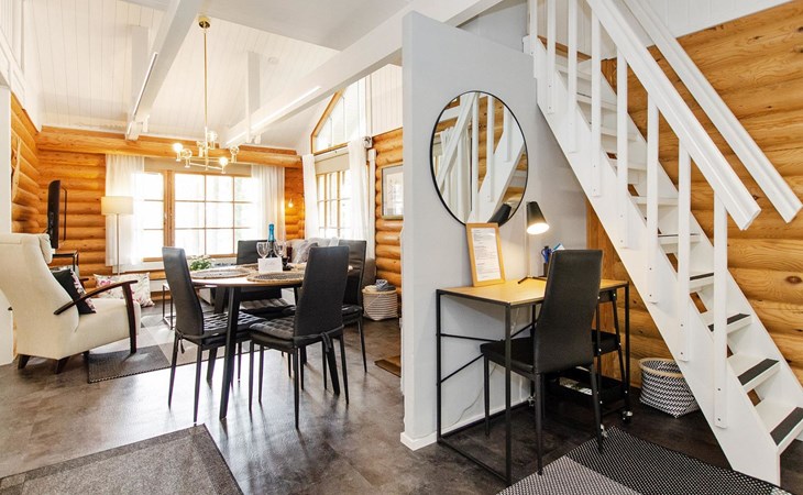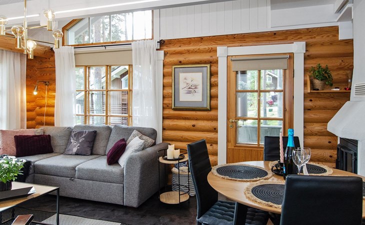 This round log cabin was built in 1990 and renovated/refurnished in 2021. Terrace was expanded in 2022. The cabin has a living room/kitchen, bedroom with double bed, loft (18 m²) with 4 beds, washroom, electric sauna, and terrace.