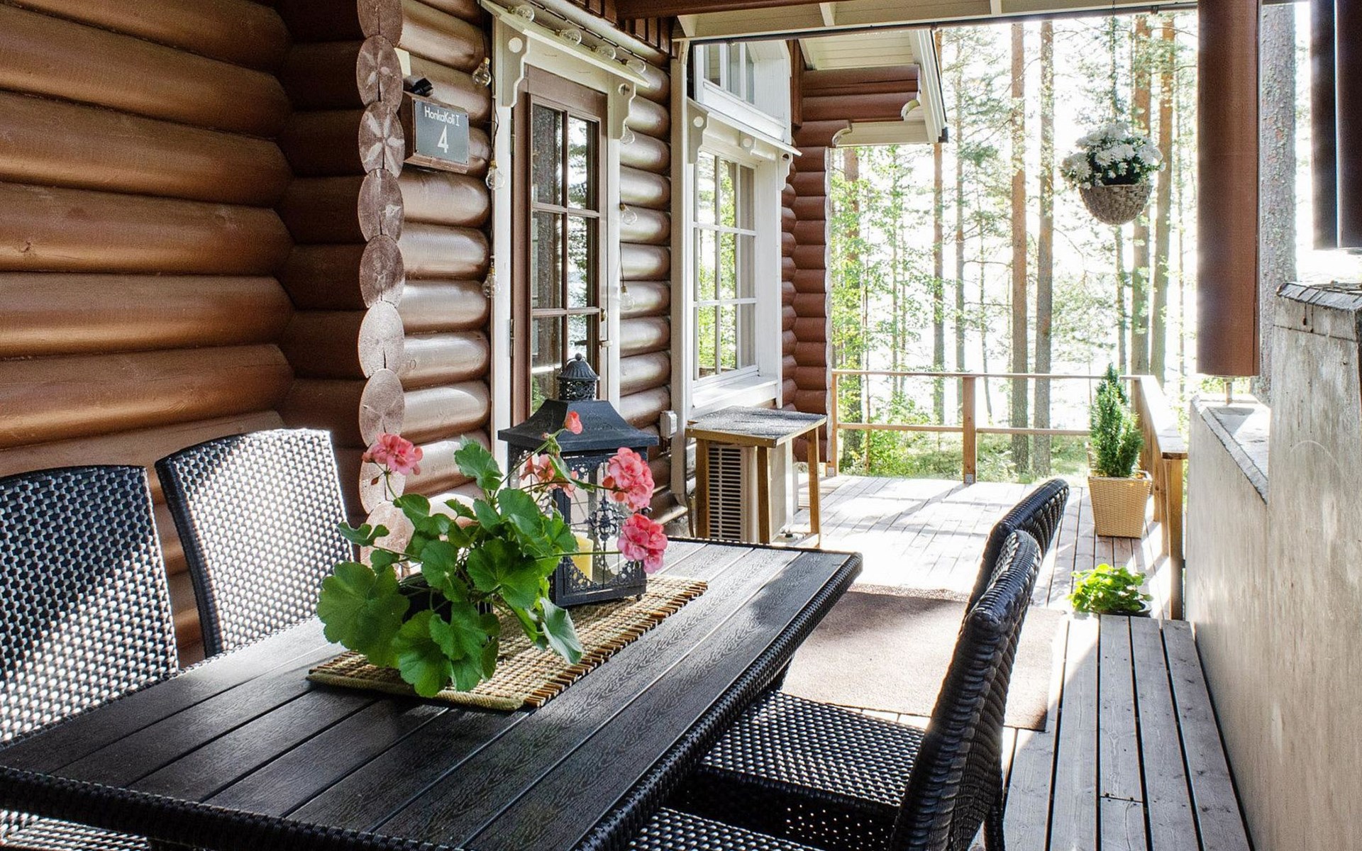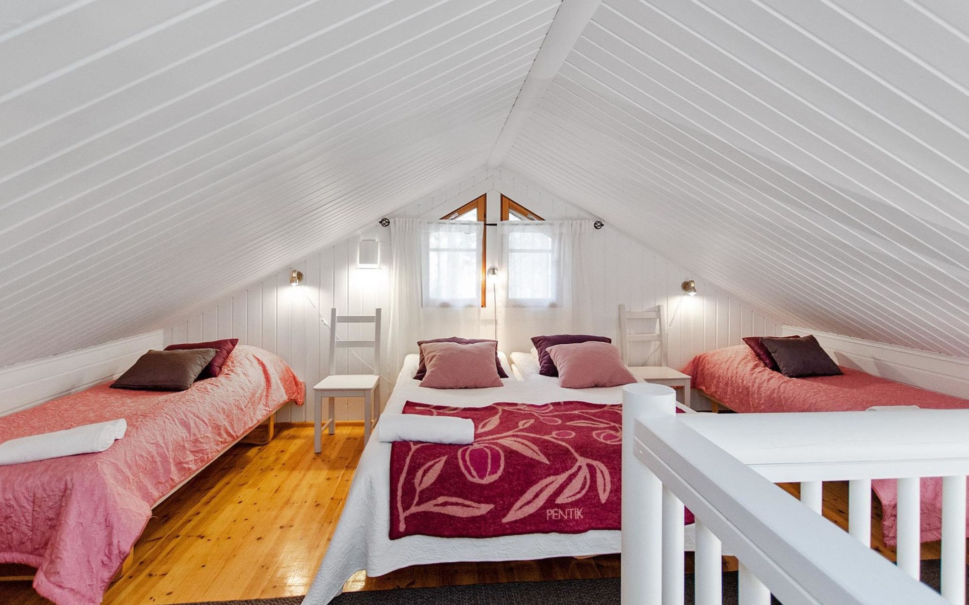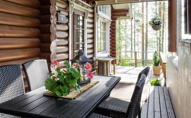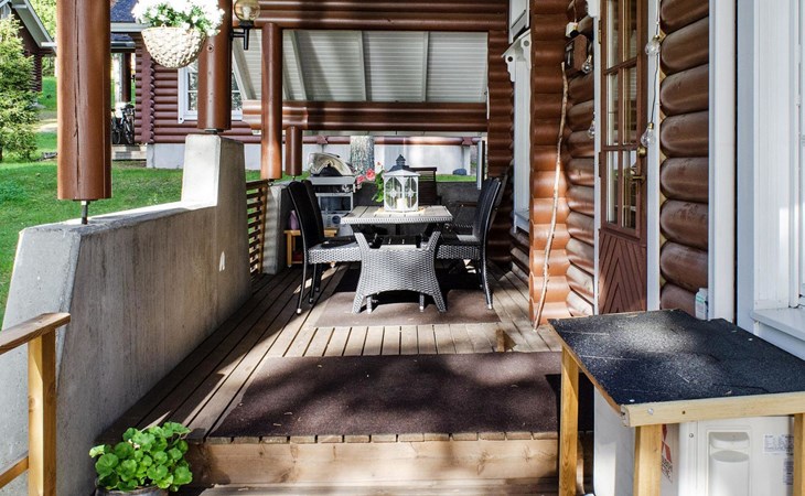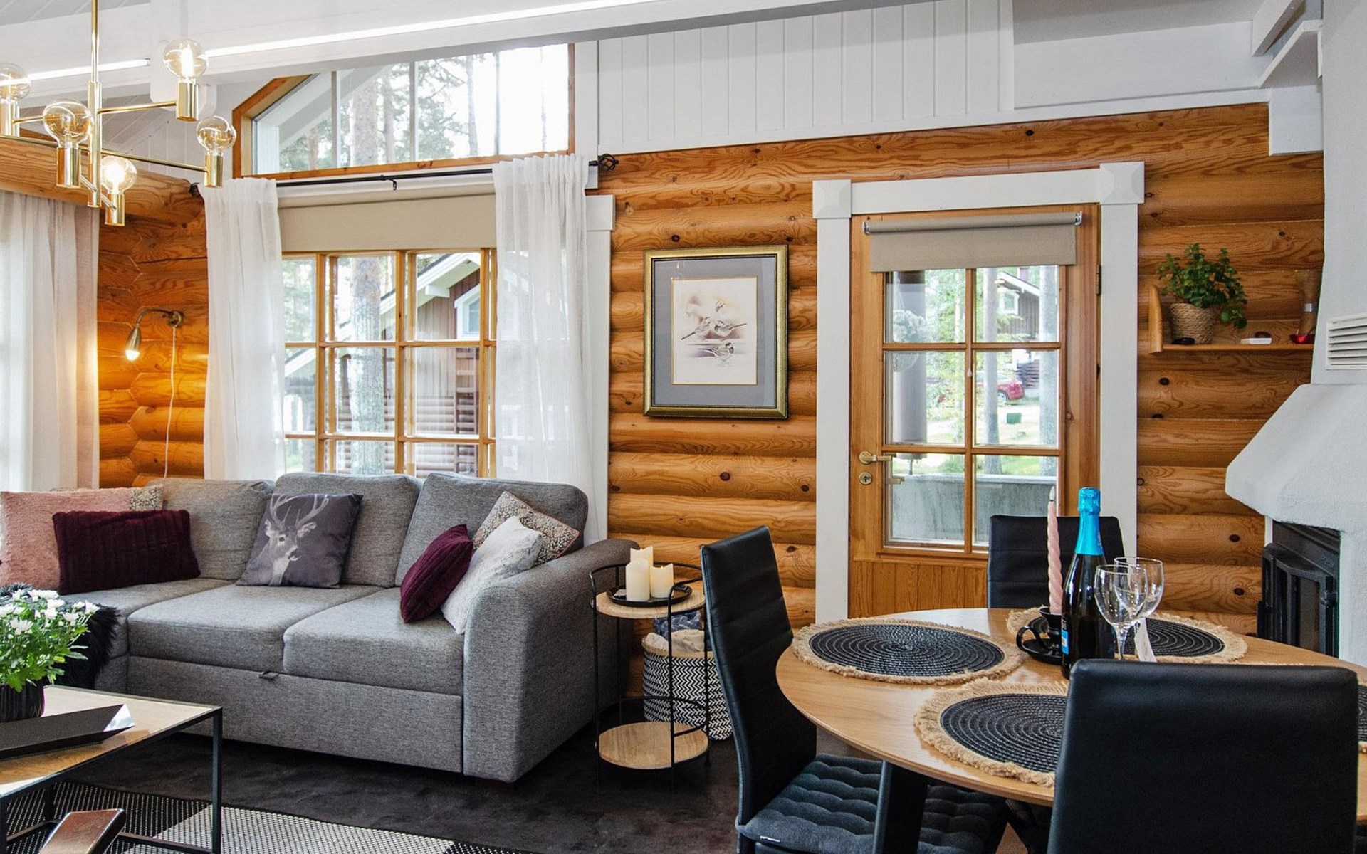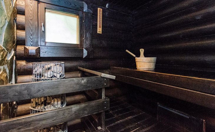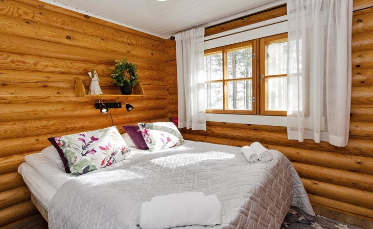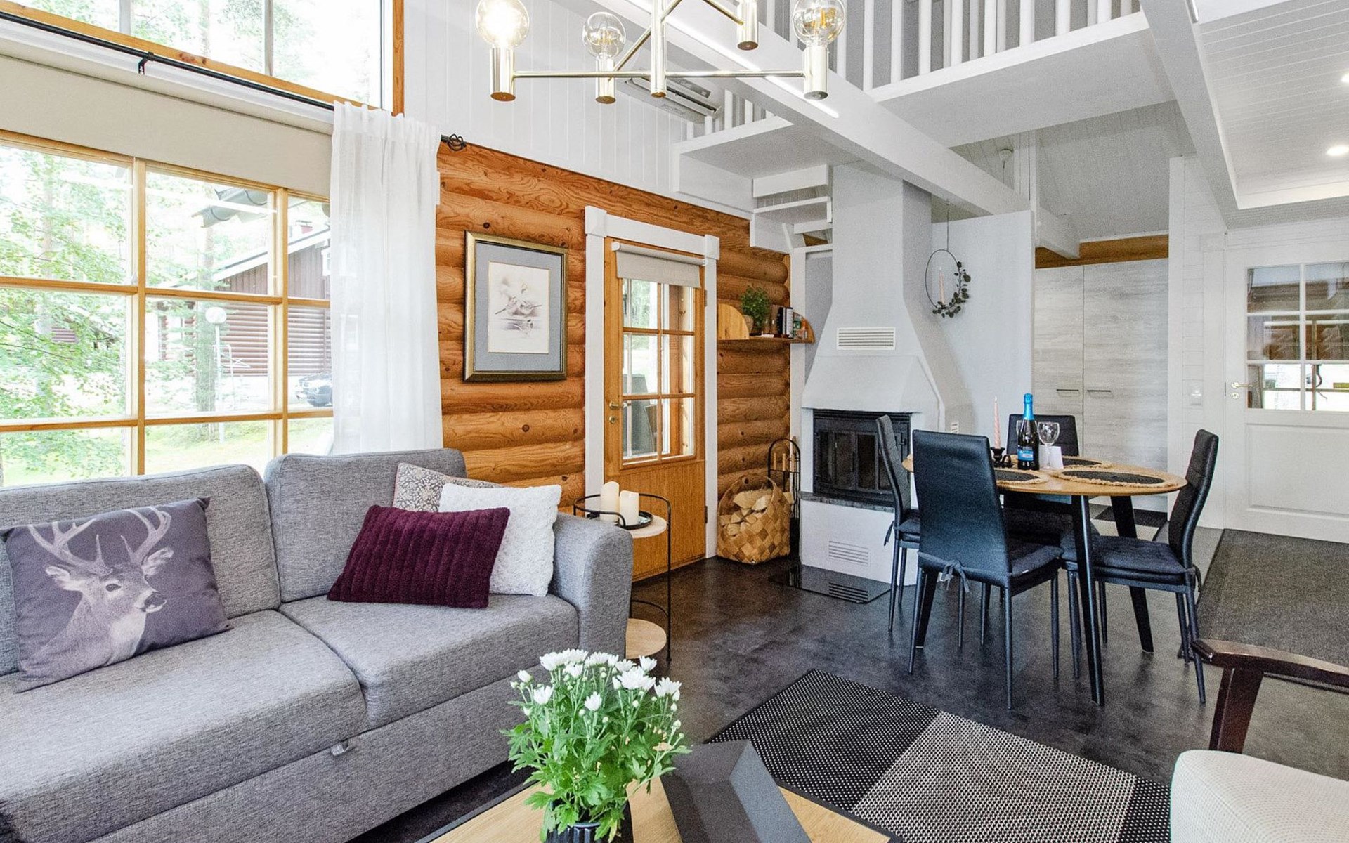 This round log cabin was built in 1990 and renovated/refurnished in 2021. Terrace was expanded in 2022. The cabin has a living room/kitchen, bedroom with double bed, loft (18 m²) with 4 beds, washroom, electric sauna, and terrace.