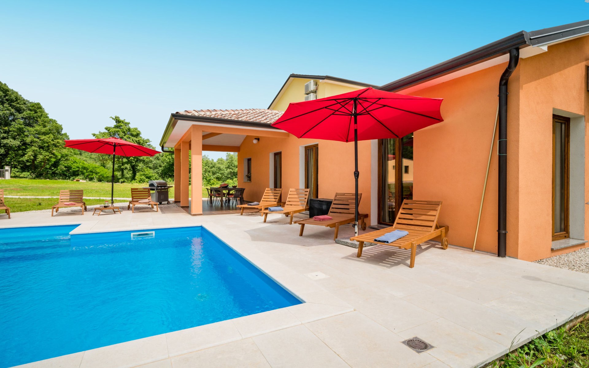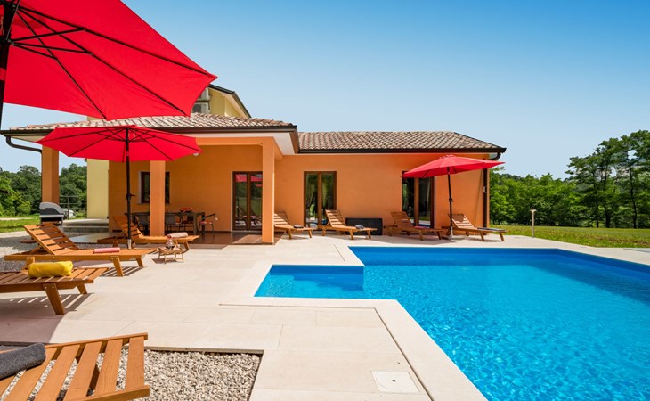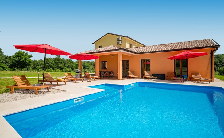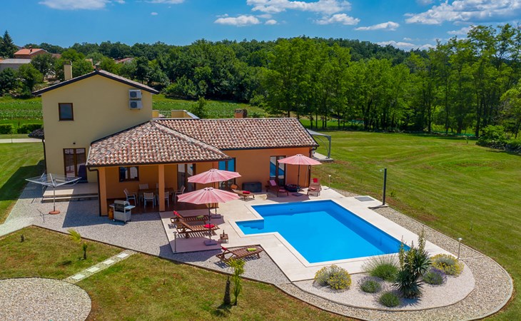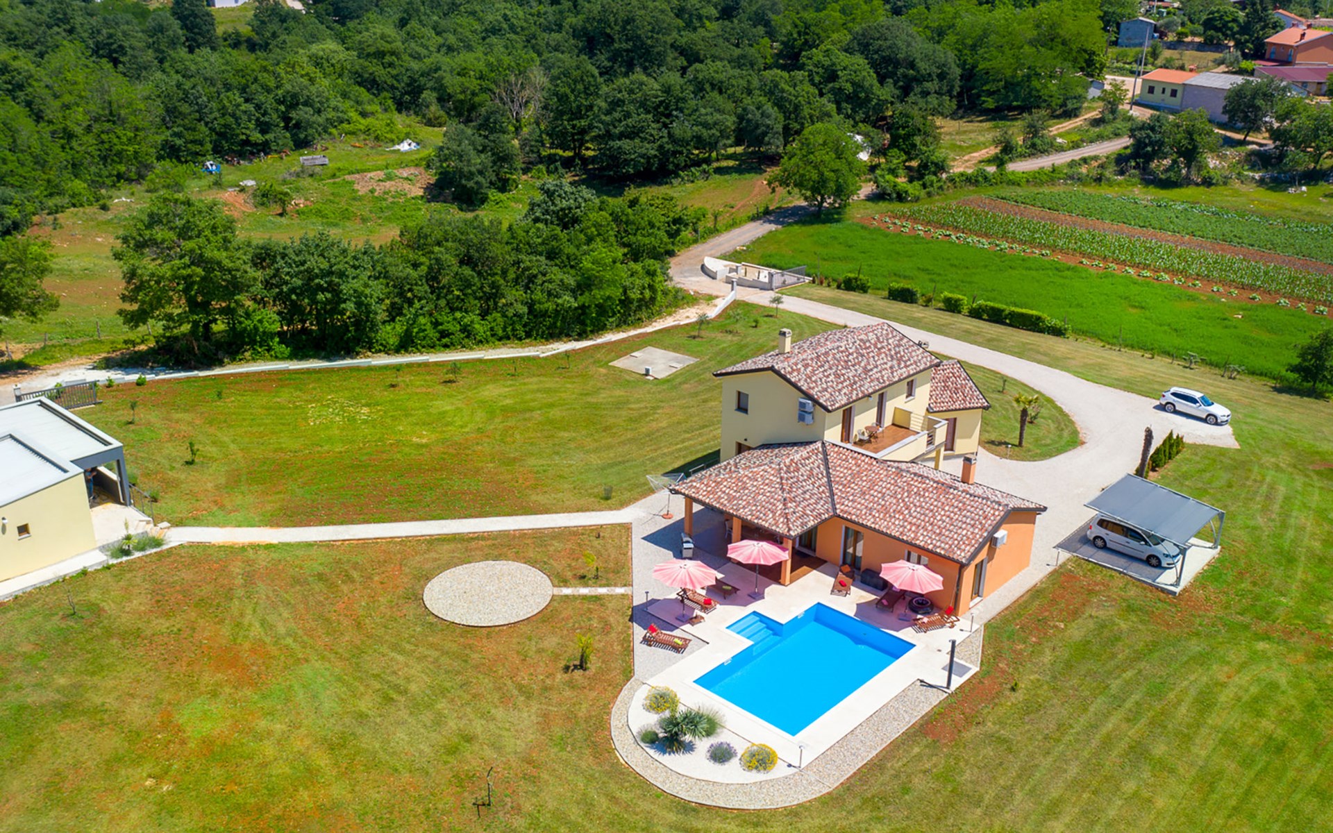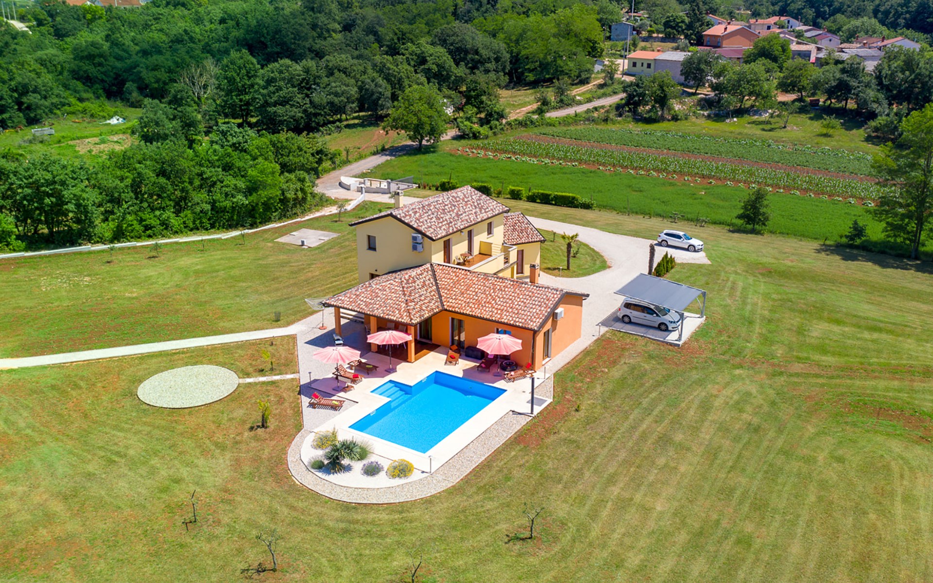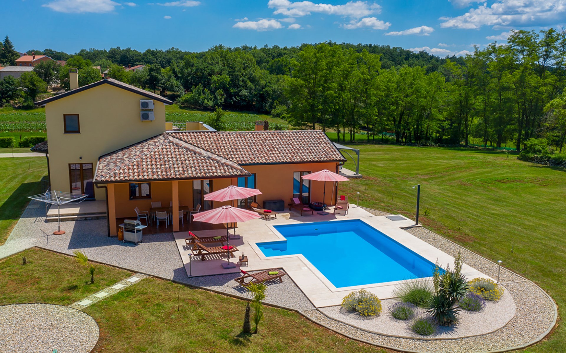 Frankovići 10 km von Motovun: Schönes Einfamilienhaus "Villa Frankovići", auf 2 Stockwerken, Baujahr 2017. Im Weiler Frankovići, 8 km vom Zentrum von Pazin, 33 km vom Zentrum von Poreč, 30 km vom Meer, im Grünen. Zur Alleinbenutzung: Grundstück 14'000 m2, Rasen, Schwimmbad eckig (8 x 5 m, 46 m2, 140 cm tief, saisonale Verfügbarkeit: 01.Mai. - 30.Sep.) mit Innentreppe. Aussendusche, Terrasse (27 m2), Gartenmöbel. Im Hause: Internetzugang, Waschmaschine. Parkplatz (für 3 Autos) beim Haus auf dem Grundstück. Einkaufsgeschäft 3 km, Supermarkt 11 km, Restaurant 3 km, Bushaltestelle 5.5 km, Kieselstrand 30 km. Wanderwege ab Haus 300 m, Radweg 350 m.