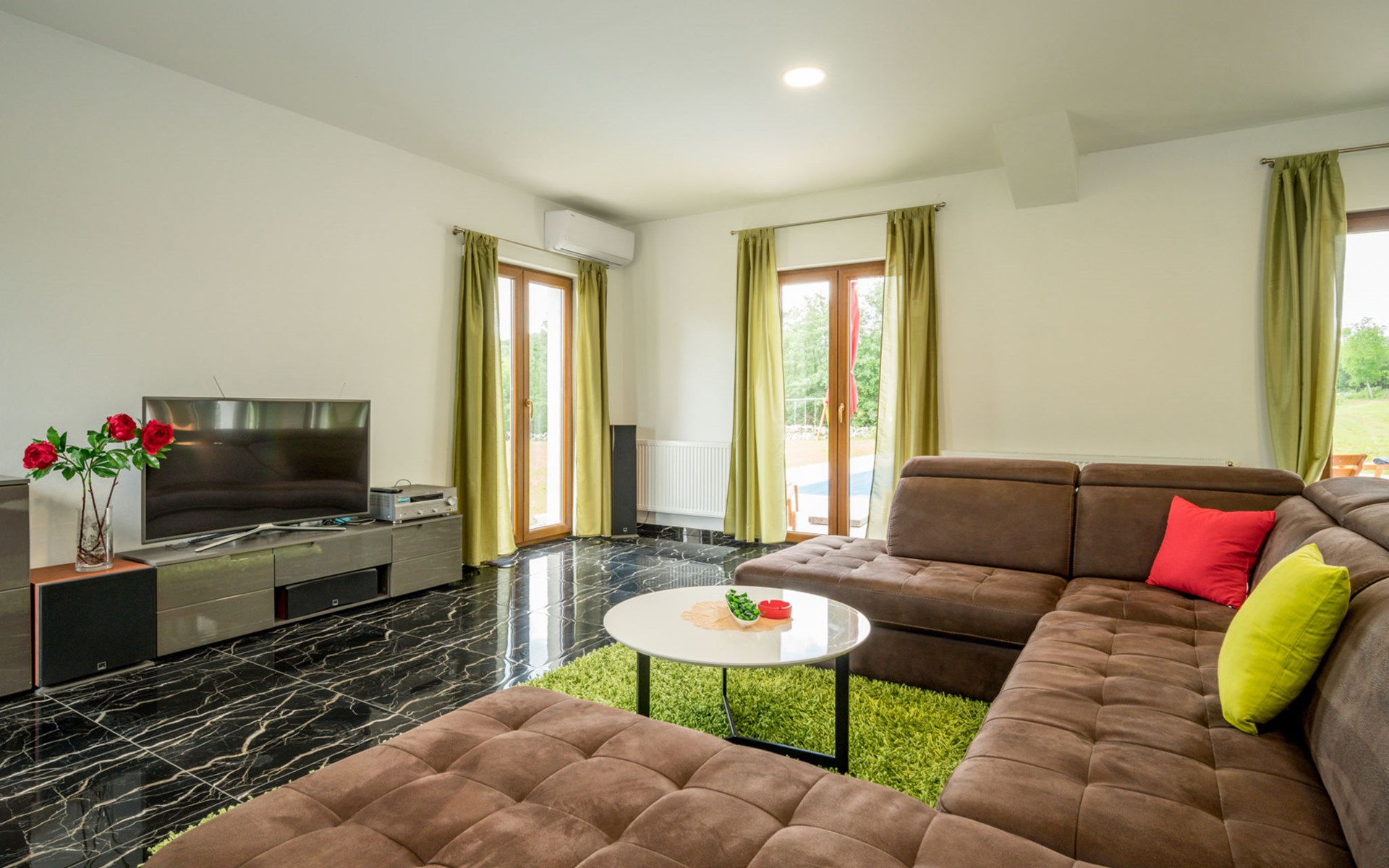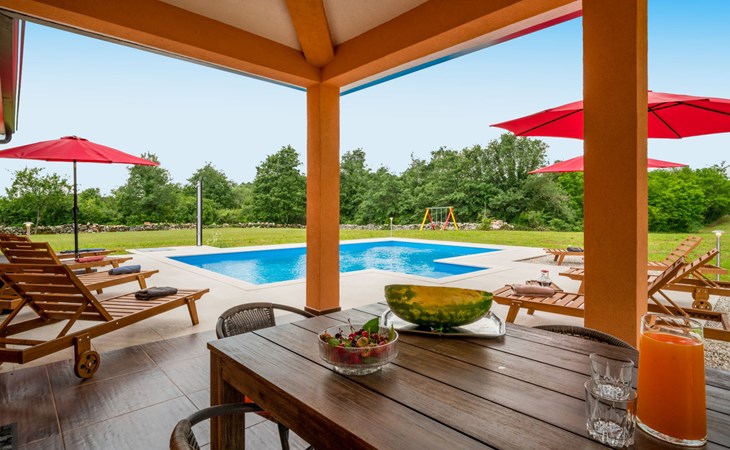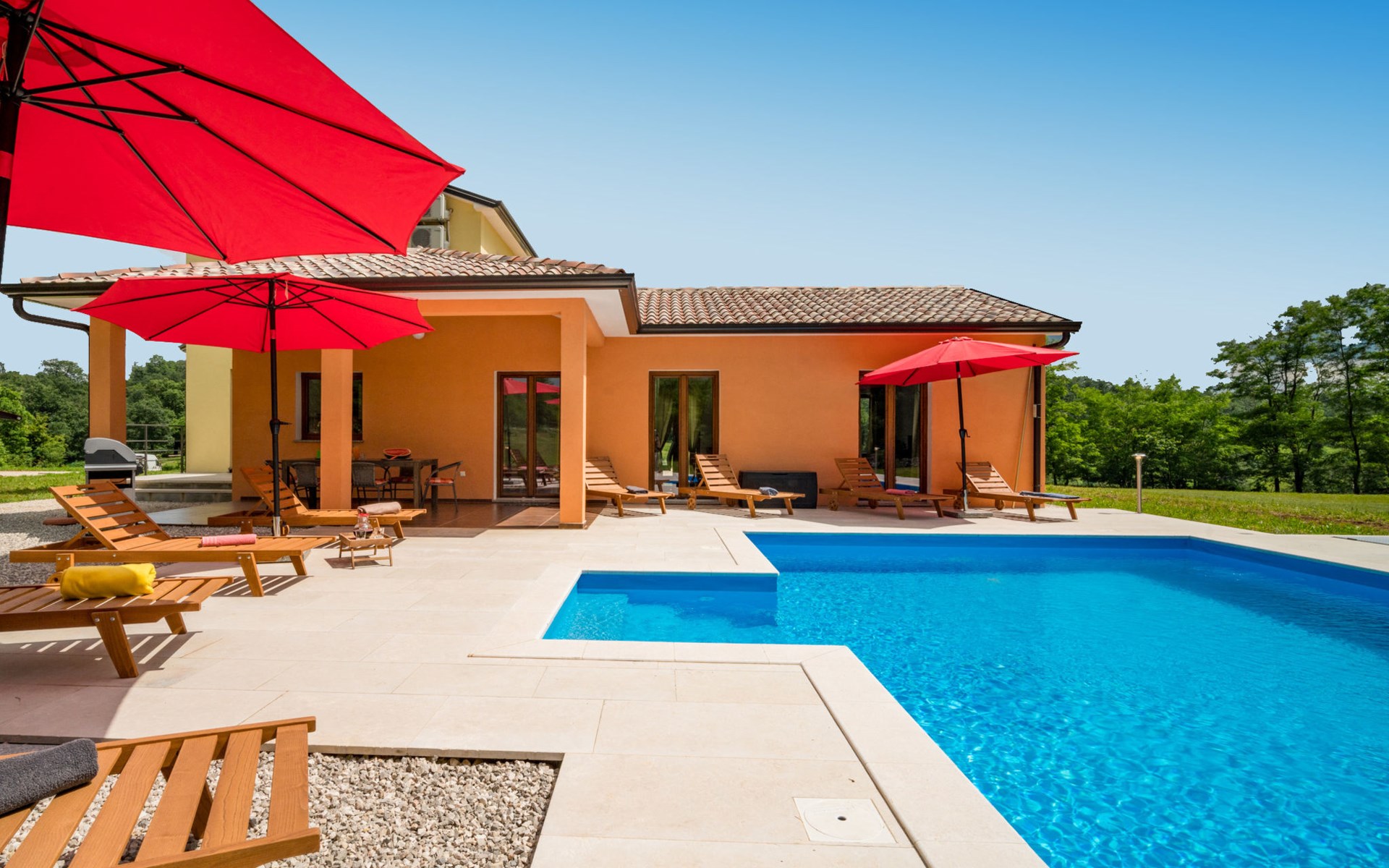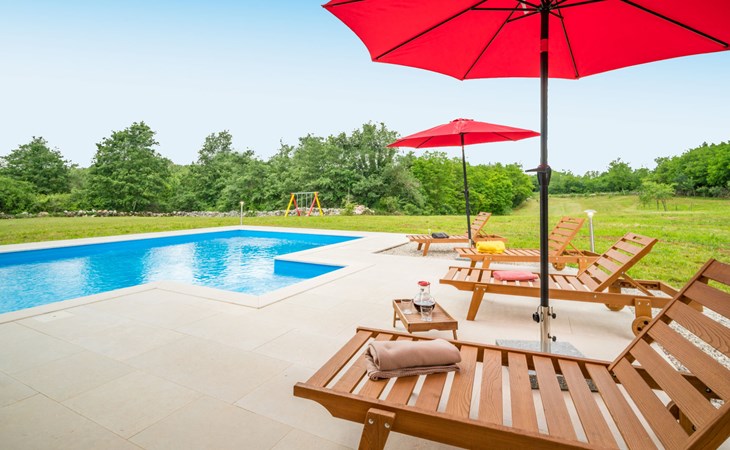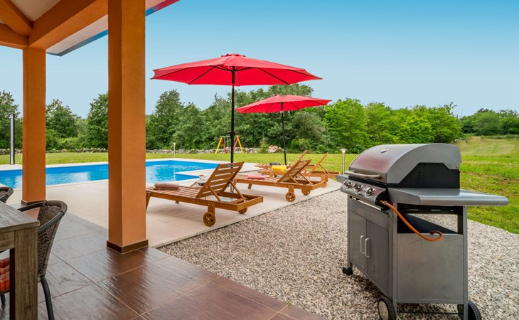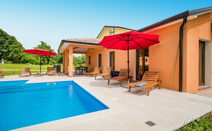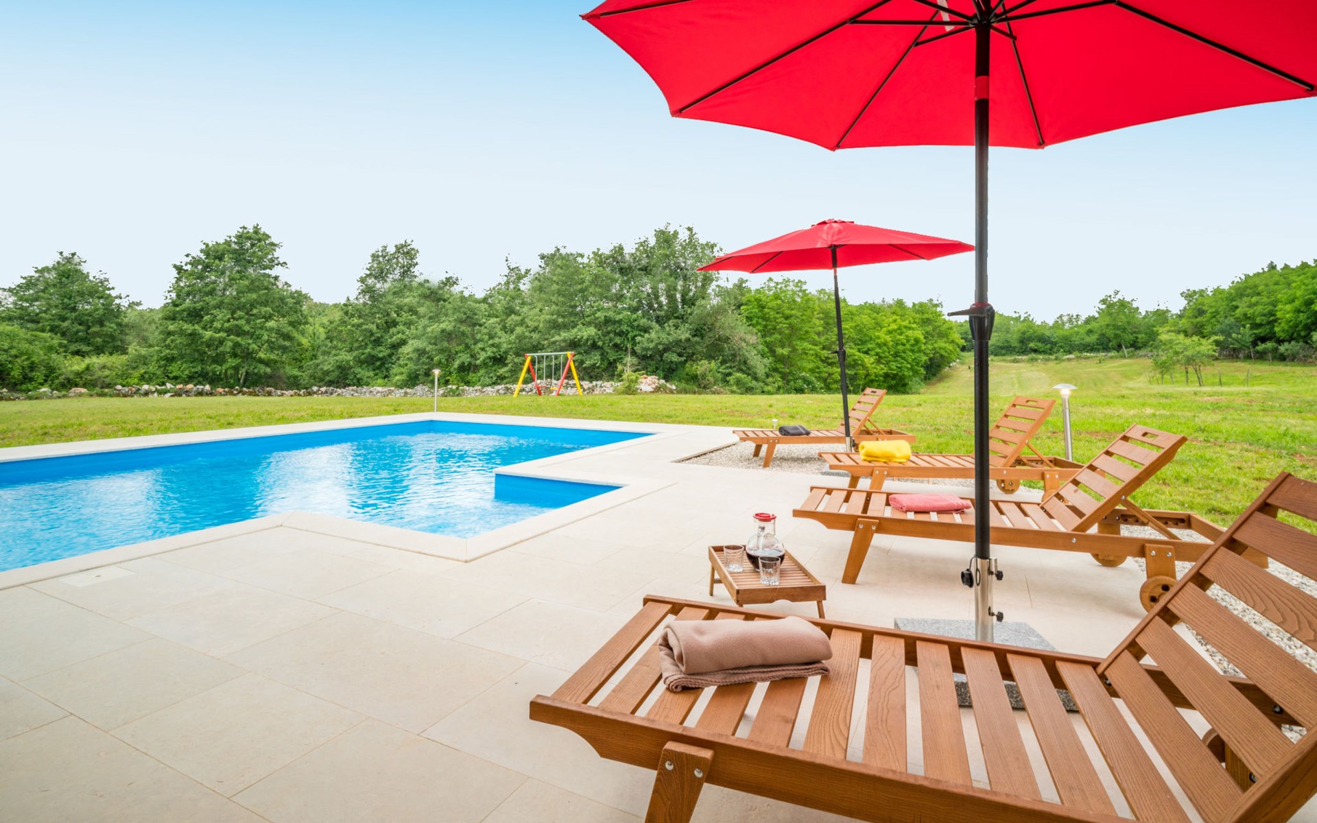 Frankovići 10 km von Motovun: Schönes Einfamilienhaus "Villa Frankovići", auf 2 Stockwerken, Baujahr 2017. Im Weiler Frankovići, 8 km vom Zentrum von Pazin, 33 km vom Zentrum von Poreč, 30 km vom Meer, im Grünen. Zur Alleinbenutzung: Grundstück 14'000 m2, Rasen, Schwimmbad eckig (8 x 5 m, 46 m2, 140 cm tief, saisonale Verfügbarkeit: 01.Mai. - 30.Sep.) mit Innentreppe. Aussendusche, Terrasse (27 m2), Gartenmöbel. Im Hause: Internetzugang, Waschmaschine. Parkplatz (für 3 Autos) beim Haus auf dem Grundstück. Einkaufsgeschäft 3 km, Supermarkt 11 km, Restaurant 3 km, Bushaltestelle 5.5 km, Kieselstrand 30 km. Wanderwege ab Haus 300 m, Radweg 350 m.