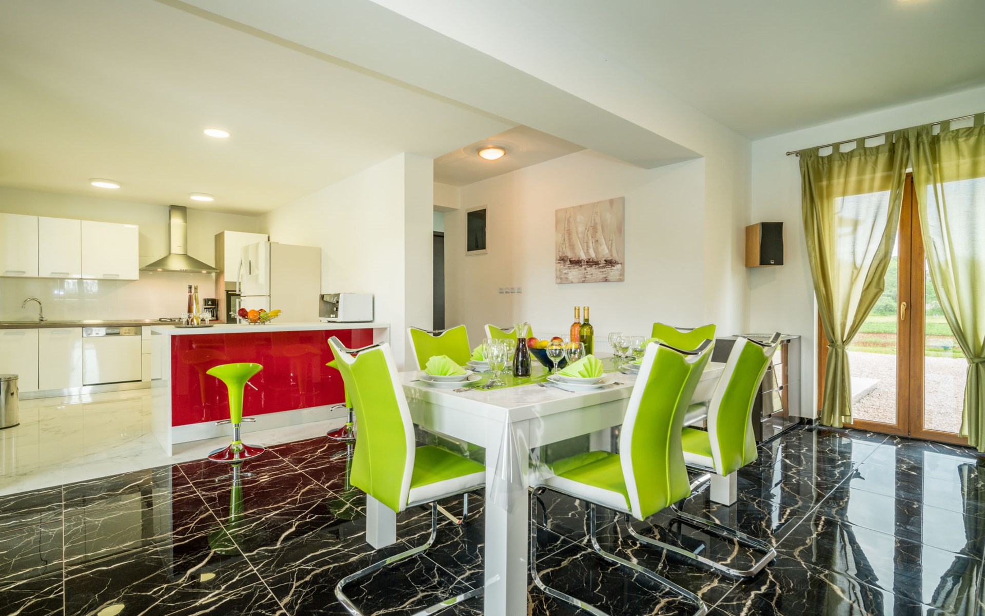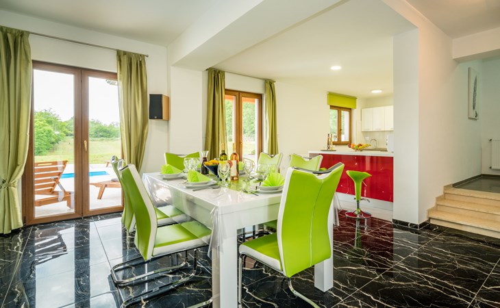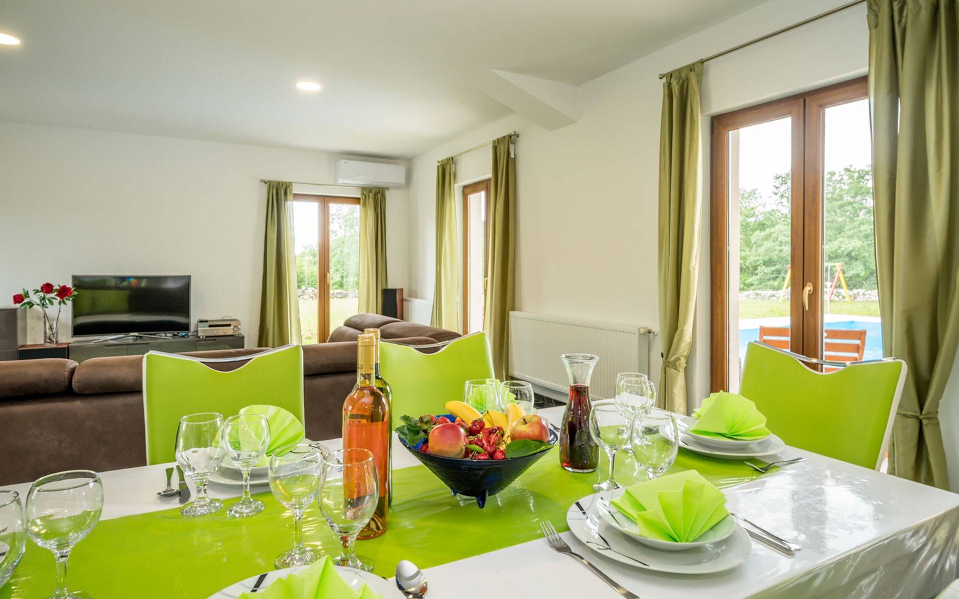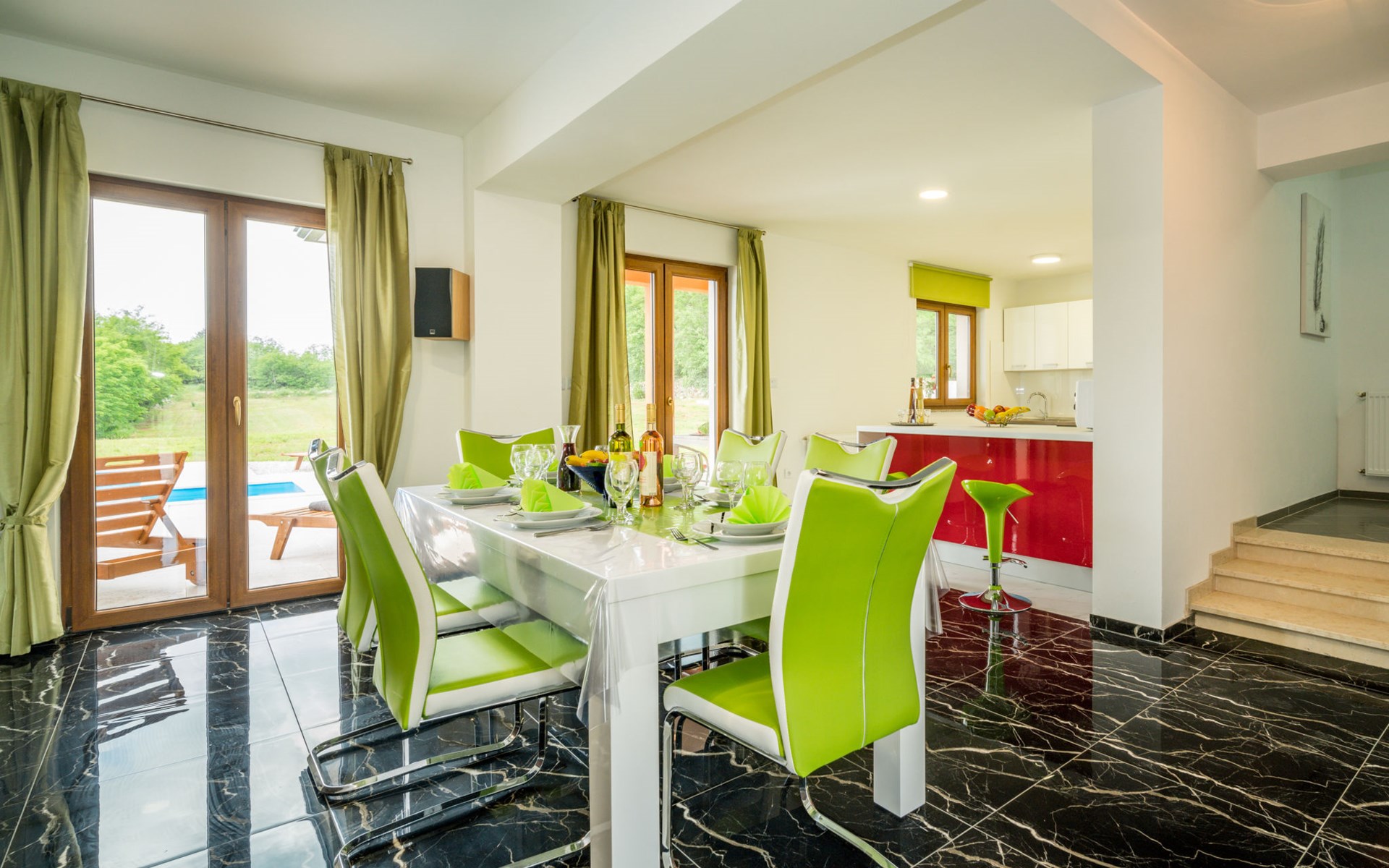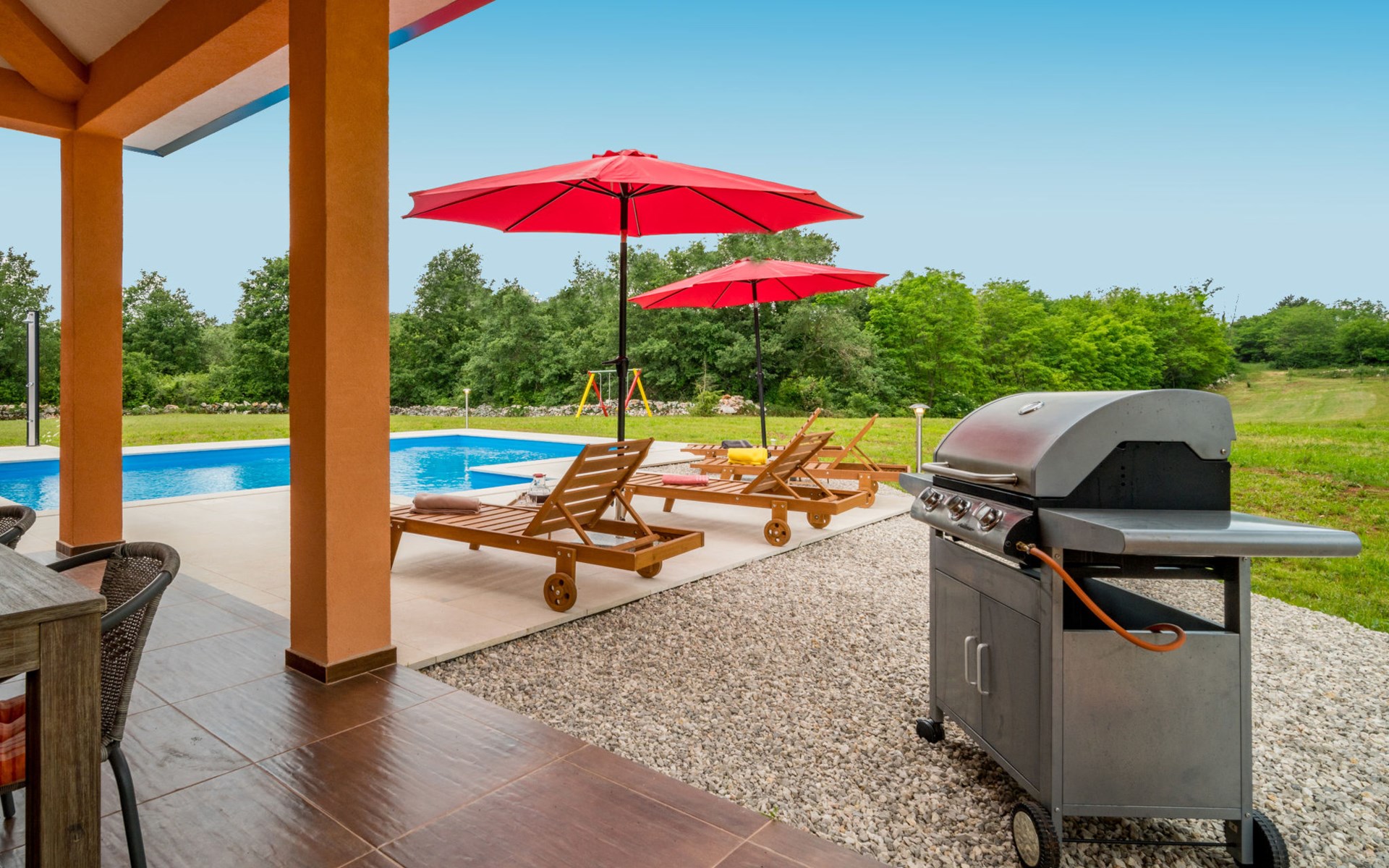 Frankovići 10 km von Motovun: Schönes Einfamilienhaus "Villa Frankovići", auf 2 Stockwerken, Baujahr 2017. Im Weiler Frankovići, 8 km vom Zentrum von Pazin, 33 km vom Zentrum von Poreč, 30 km vom Meer, im Grünen. Zur Alleinbenutzung: Grundstück 14'000 m2, Rasen, Schwimmbad eckig (8 x 5 m, 46 m2, 140 cm tief, saisonale Verfügbarkeit: 01.Mai. - 30.Sep.) mit Innentreppe. Aussendusche, Terrasse (27 m2), Gartenmöbel. Im Hause: Internetzugang, Waschmaschine. Parkplatz (für 3 Autos) beim Haus auf dem Grundstück. Einkaufsgeschäft 3 km, Supermarkt 11 km, Restaurant 3 km, Bushaltestelle 5.5 km, Kieselstrand 30 km. Wanderwege ab Haus 300 m, Radweg 350 m.