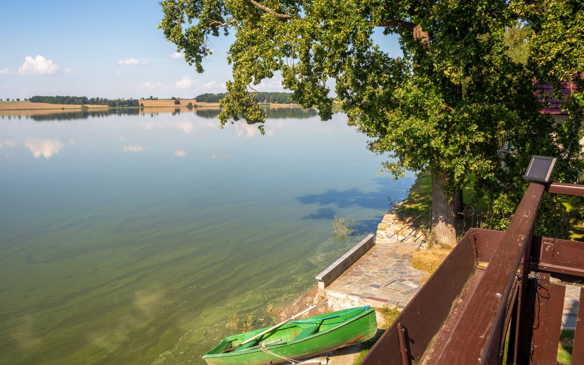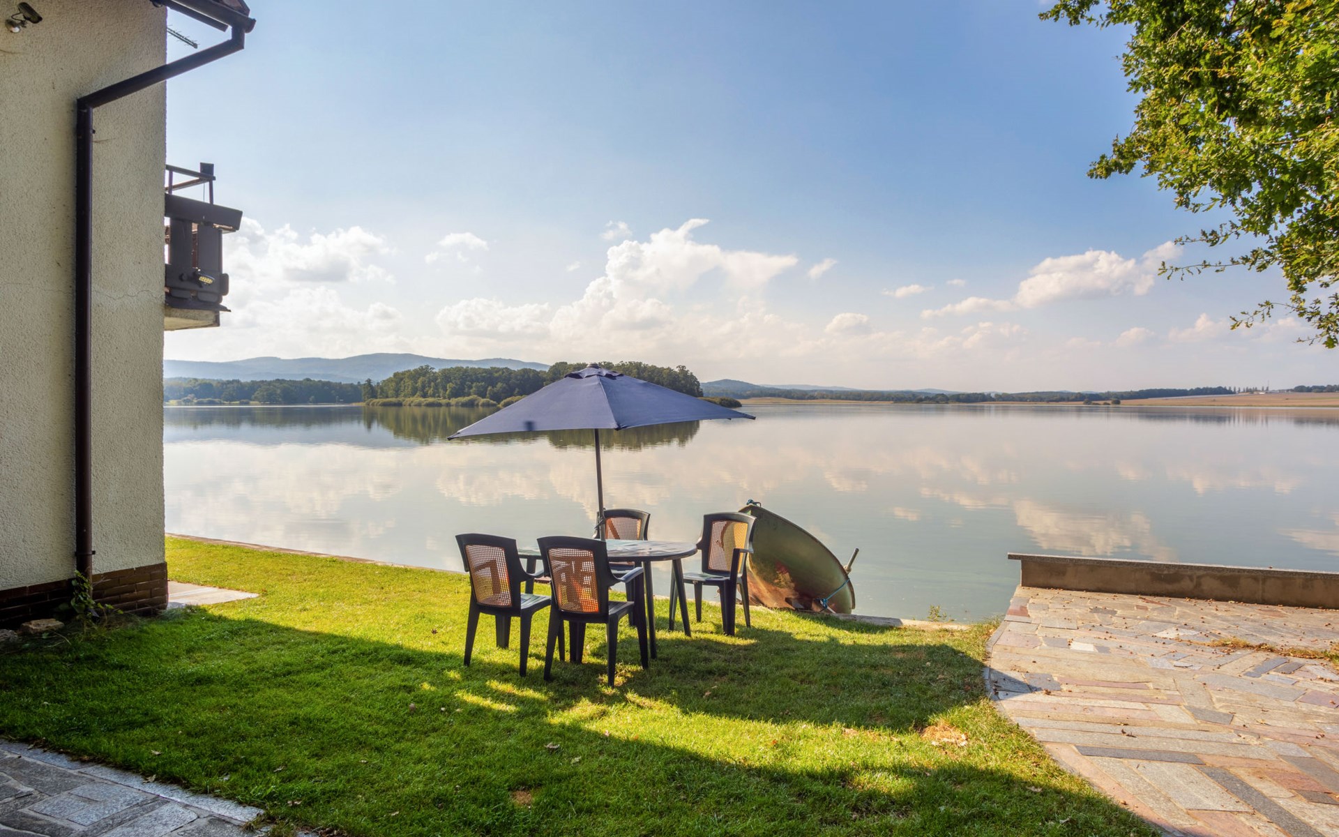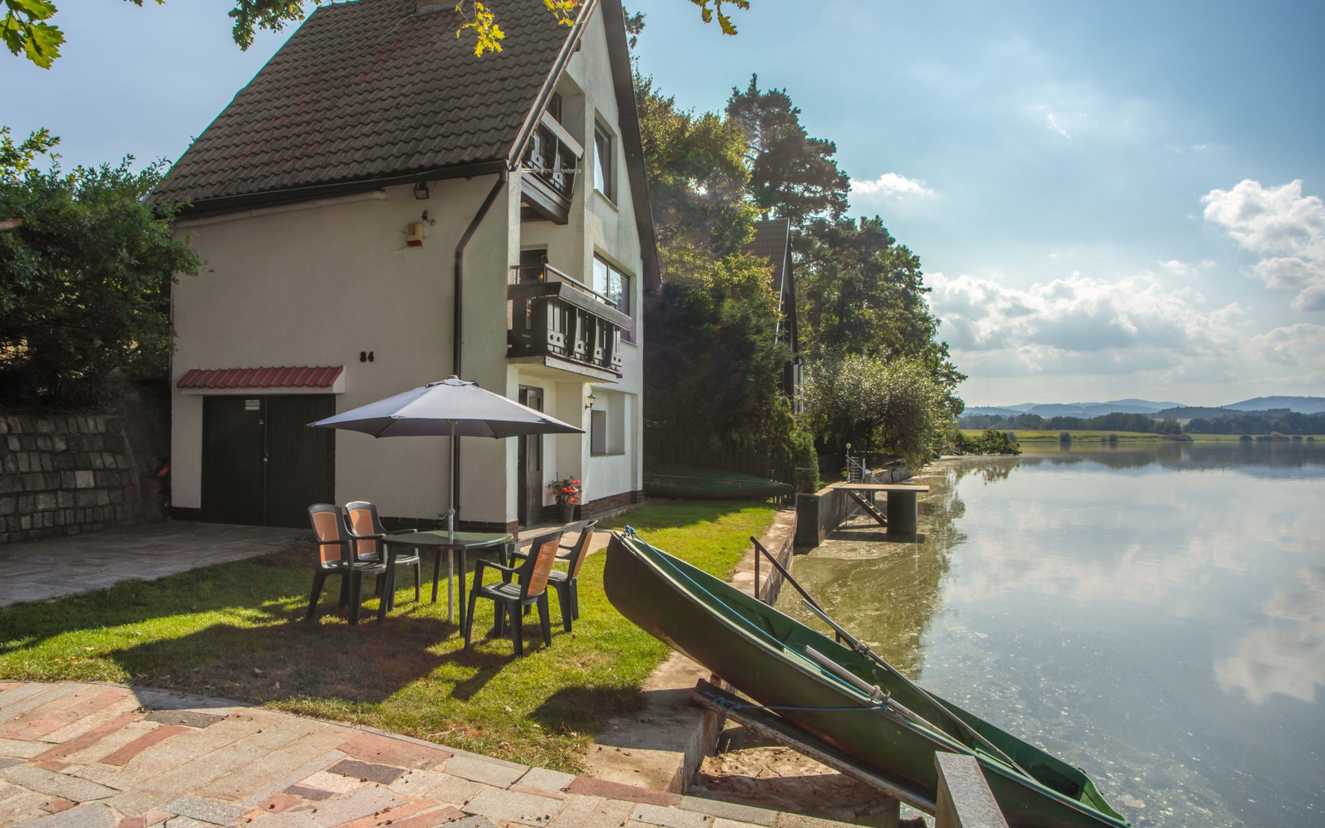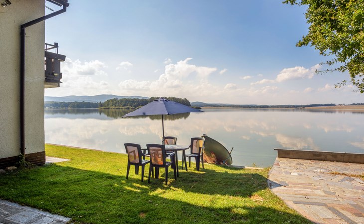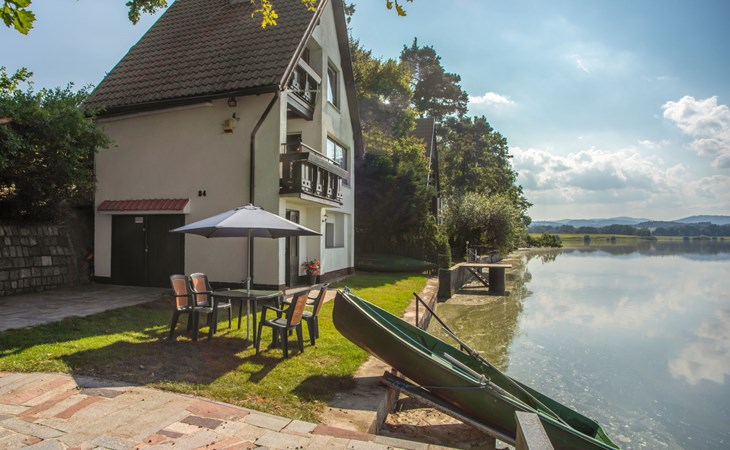 Freistehendes Chalet "Panorama", 400 m.ü.M., auf 4 Stockwerken. 500 m vom Zentrum von Dehtáře, am Ortsrand Holašovice, 15 km vom Zentrum von Hluboká nad Vltavou, ruhige, sonnige Lage, direkt am See. Zur Alleinbenutzung: naturbelassenes Grundstück 420 m2, Garten (nicht eingezäunt) Bäumen, Wiese. Terrasse, Gartenmöbel, Feuerstelle, Badesteg, Badeplatz. Zur Verfügung: Kanu, Boot. 800 m lange schmale Zufahrt. Parkplatz (für 2 Autos) auf dem Grundstück. Einkaufsgeschäft 1.5 km, Supermarkt 15 km, Restaurant 1.5 km, Biergarten 400 m, Bushaltestelle "Dehtáře" 500 m, Bahnstation "Netolice" 11 km, Sandstrand 3 m, Freibad 15 km, Hallenbad 15 km, Badesee "Dehtáře" 3 m. Golfplatz (18 Loch) 15 km, Wanderwege ab Haus, Radweg 10 m. Nahe gelegene Sehenswürdigkeiten: UNESCO Holašovice 6 km, Hluboká nad Vltavou 15 km, České Budějovice 15 km, Dívčí kámen 18 km, Český Krumlov 36 km. Bekannte Seen in der Umgebung sind gut erreichbar: Dehtáře 3 m.