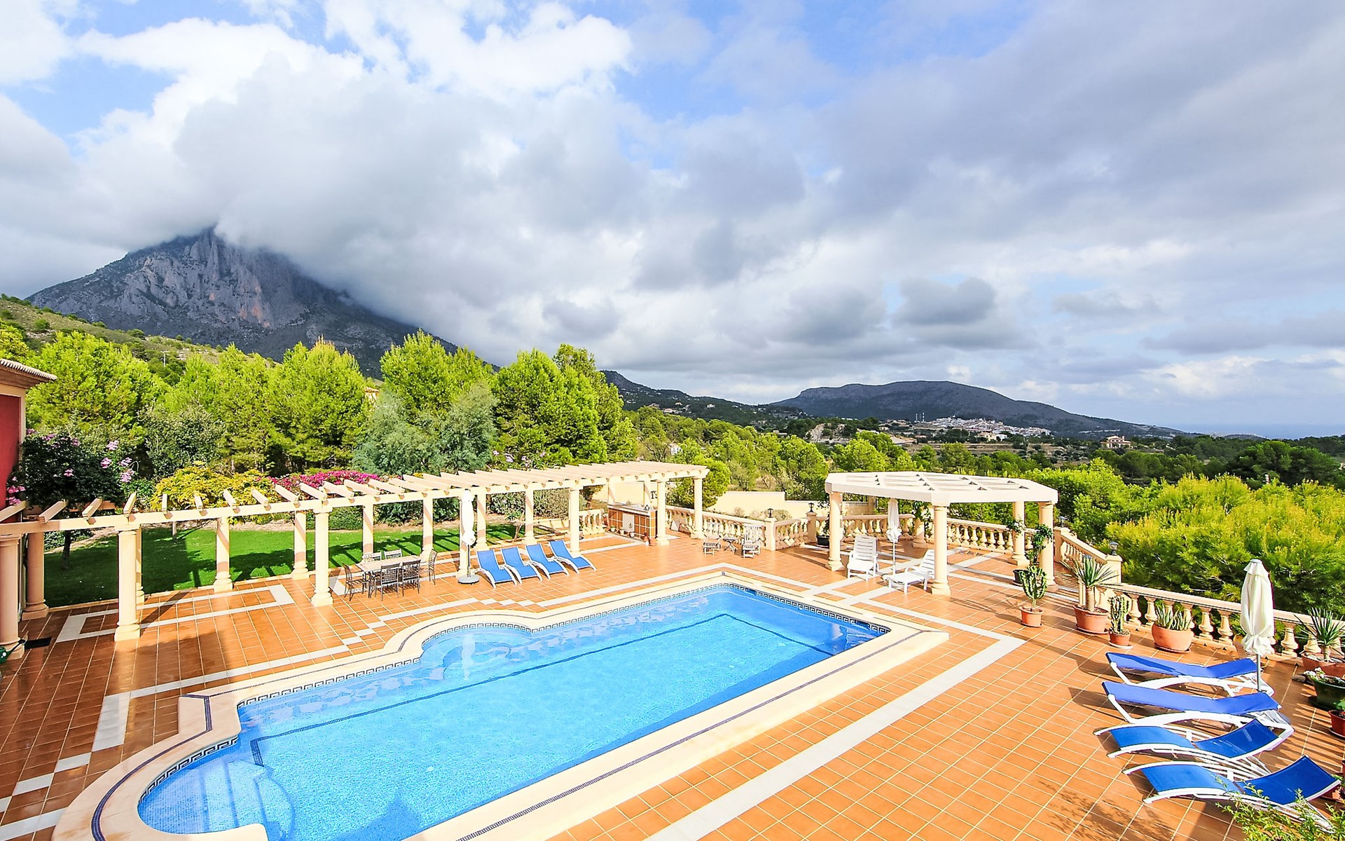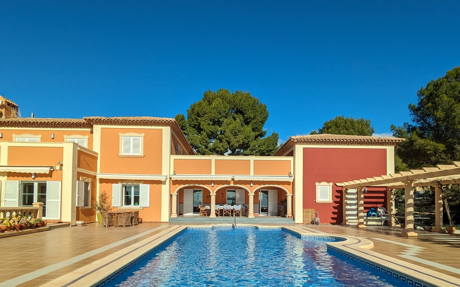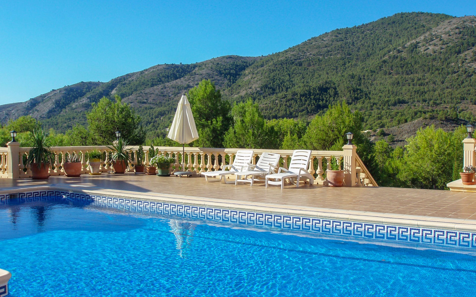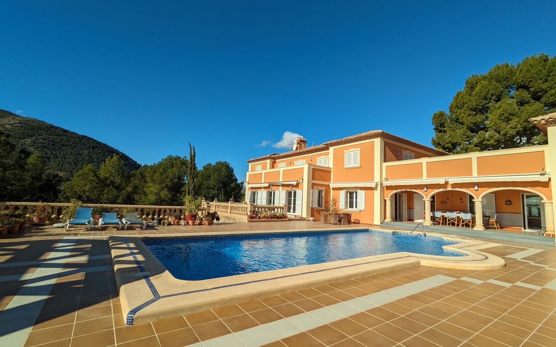 Finestrat 15 km von Benidorm: Sehr grosse, sehr moderne, luxuriöse Villa "Villa Orquideas", auf 3 Stockwerken, umgeben von Bäumen und Feldern. Ausserhalb des Ortes, 2 km vom Zentrum von Finestrat, alleinstehende, ruhige, sonnige Lage, 10 km vom Meer, 10 km vom Strand, im Grünen. Zur Alleinbenutzung: naturbelassenes Grundstück 20'000 m2 (eingezäunt), grosser terrassierter Garten mit Rasen 100 m2 Bäumen, Naturgarten 30'000 m2 (eingezäunt), Teich, Naturteich, Schwimmbad (12 x 100 - 200 cm tief, saisonale Verfügbarkeit: 01.Jan. - 31.Dez.) mit Innentreppe. Dusche/WC im Poolbereich, Sitzplatz (400 m2), Laube (20 m2), Gartenmöbel, Grill. Im Hause: Tischtennis. Parkplatz (für 4 Autos) auf dem Grundstück. Supermarkt 2 km, Restaurant 2 km, Bar 2 km, Bushaltestelle "Finestrat" 2 km, Bahnstation "Alicante-Benidorm" 13 m, Sandstrand "Benidorm" 10 km. Golfplatz (9 Loch) 4 km, Wanderwege ab Haus 50 m. Nahe gelegene Sehenswürdigkeiten: Aeropuerto Alicante 57 km, Aqualandia 20 km, Mundomar 20 km, Terra Mitica 18 km, Terra Natura 18 km, Alicante 41 km. Wandergebiete: Camino de Santiago del Sureste. Bitte beachten: Fahrzeug empfohlen. Babyausstattung auf Anfrage. Der Besitzer akzeptiert keine Jugendgruppen. Das Leitungswasser hat keine Trinkwasserqualität.