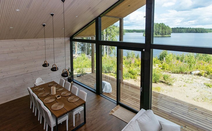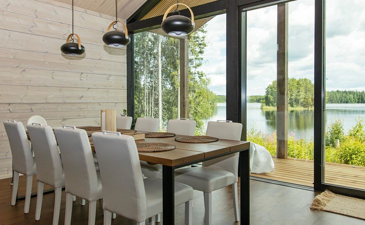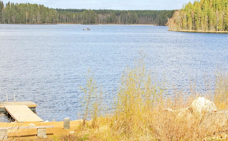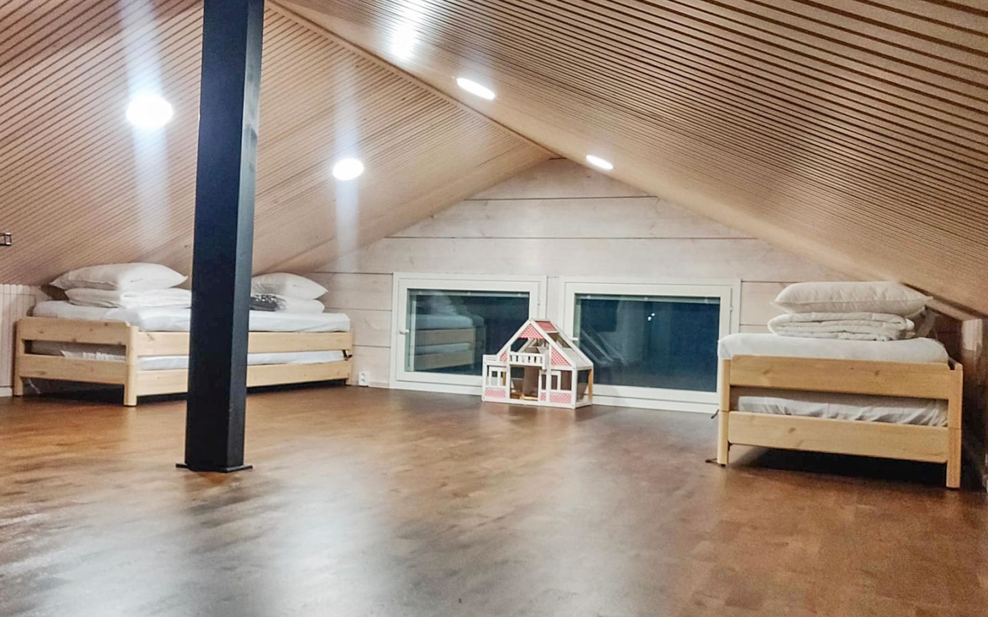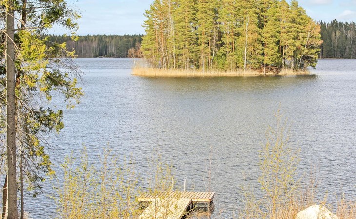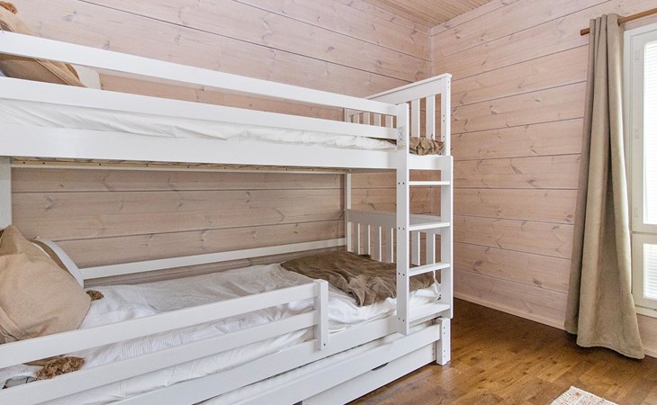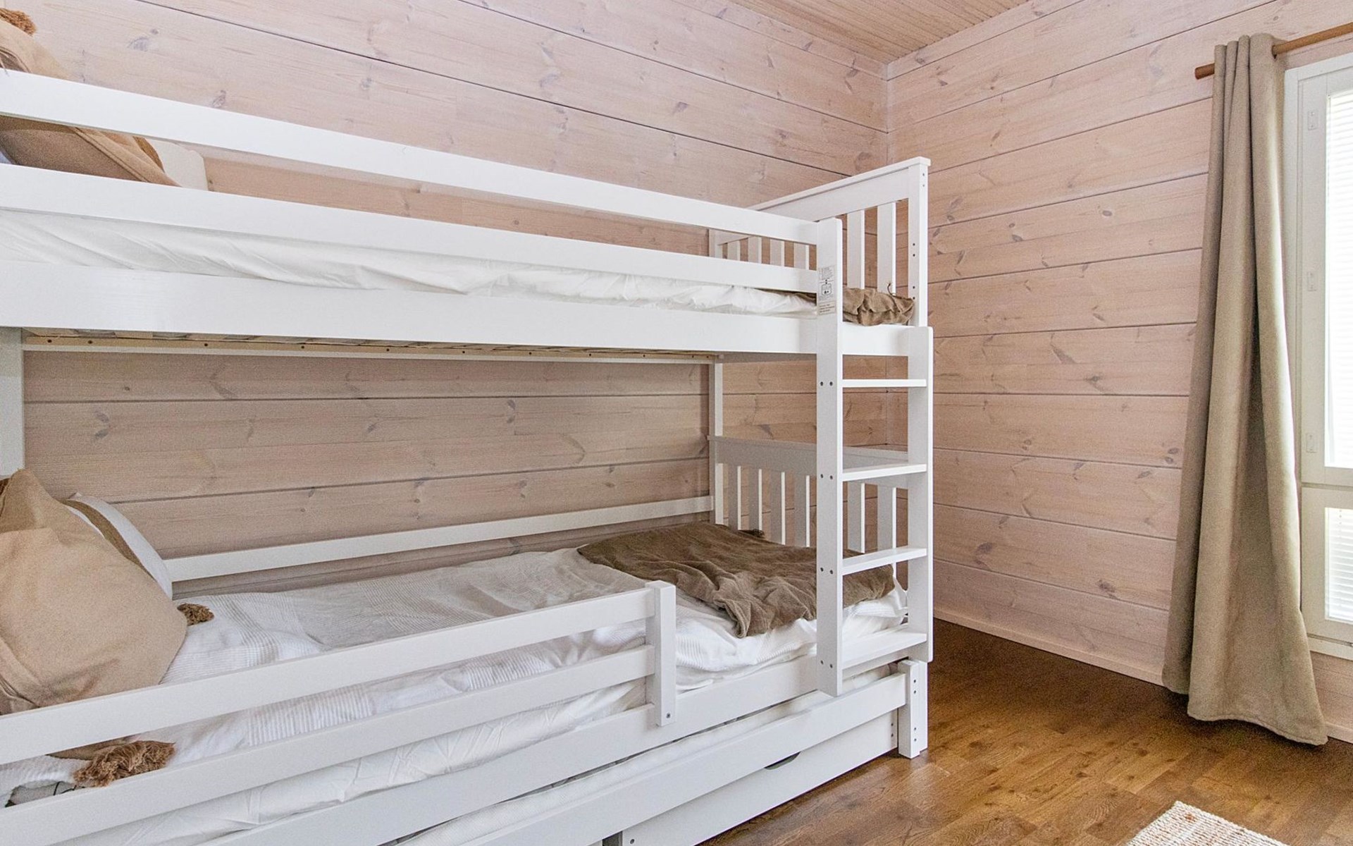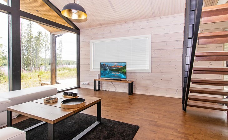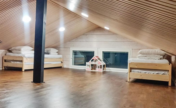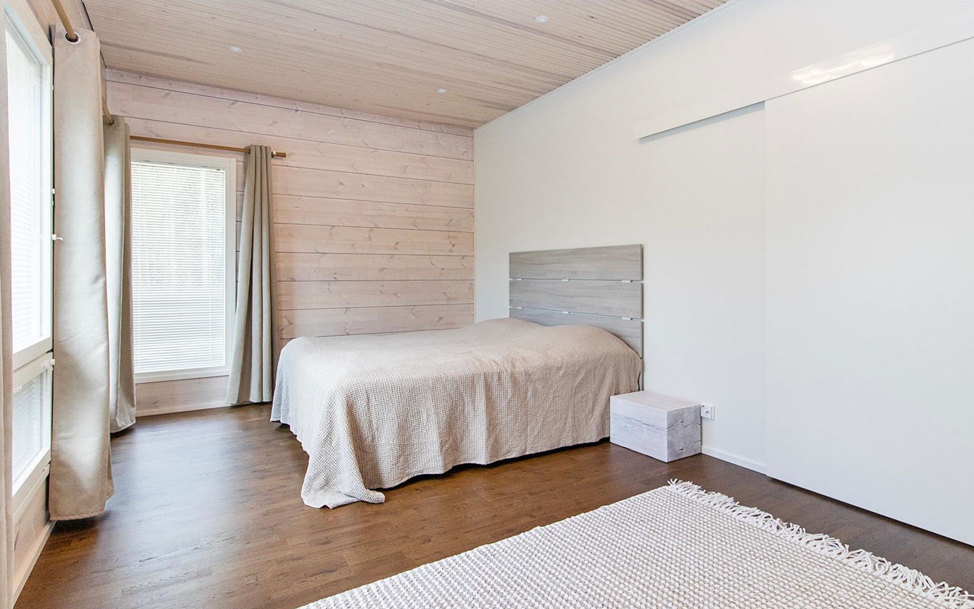 There is a large landscape window which gives a wonderful view of the fishy Lake Sääjärvi. The well-equipped living room and kitchen are open to the ceiling. In addition there are 2 spacious bedrooms on the ground floor. One with double bed (160 cm) and other with bunk bed (2 x 80 cm). Upstairs a large low loft with 2 beds (80 cm). In addition an utility room.