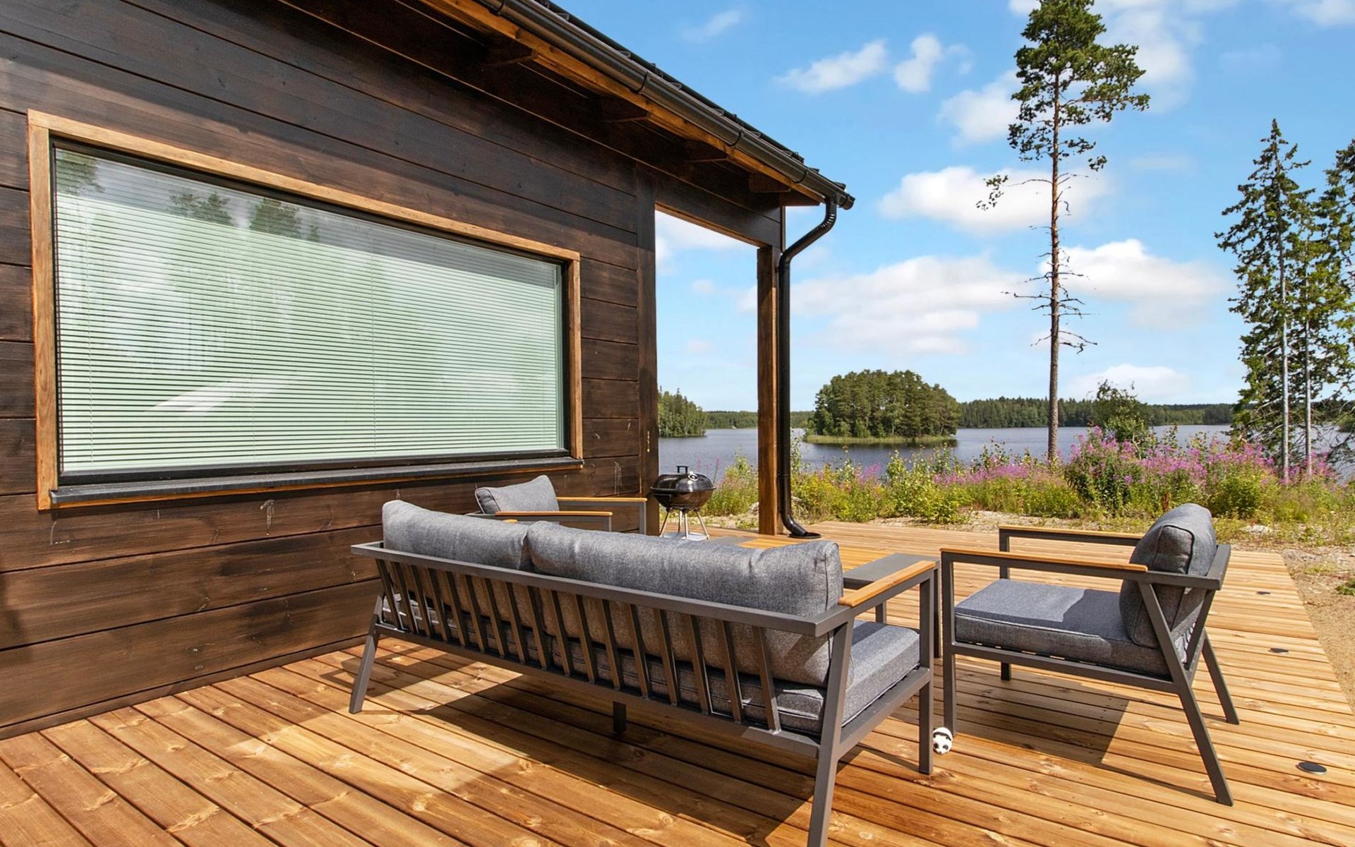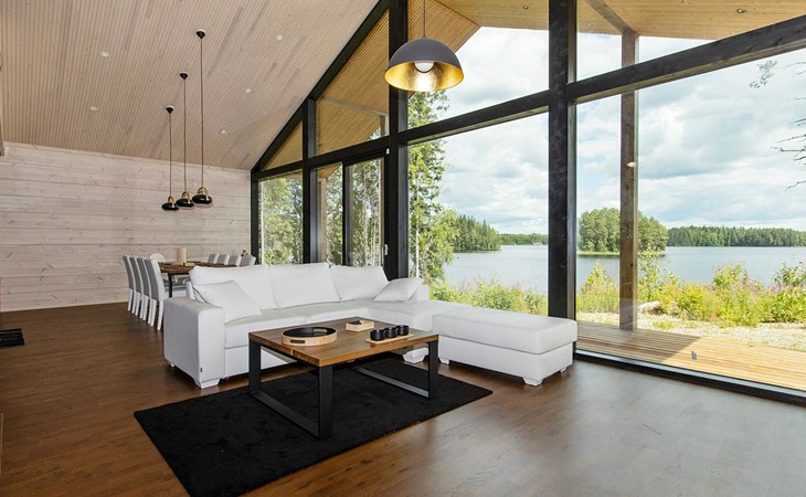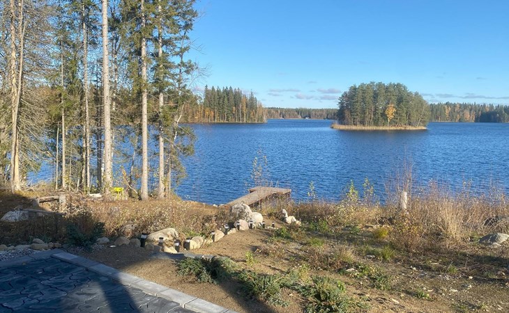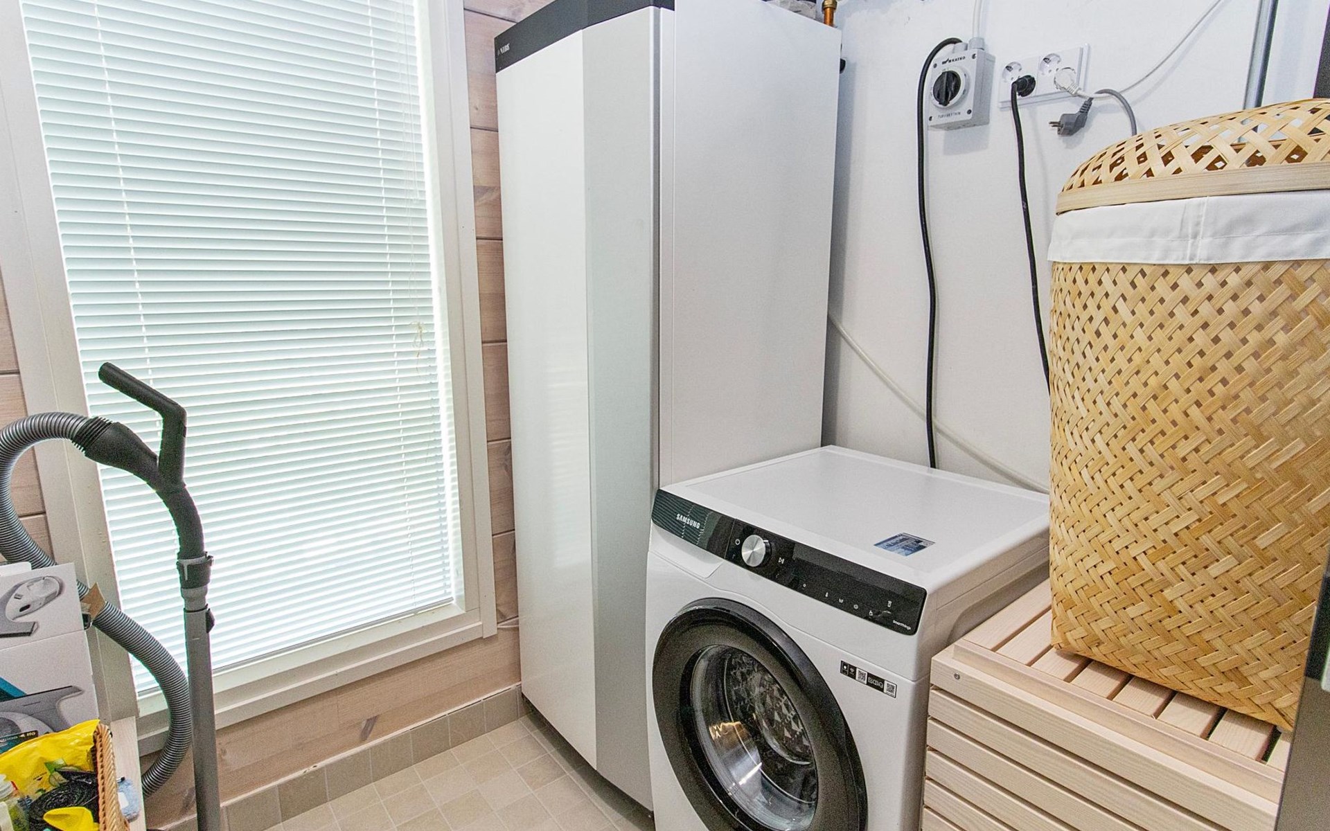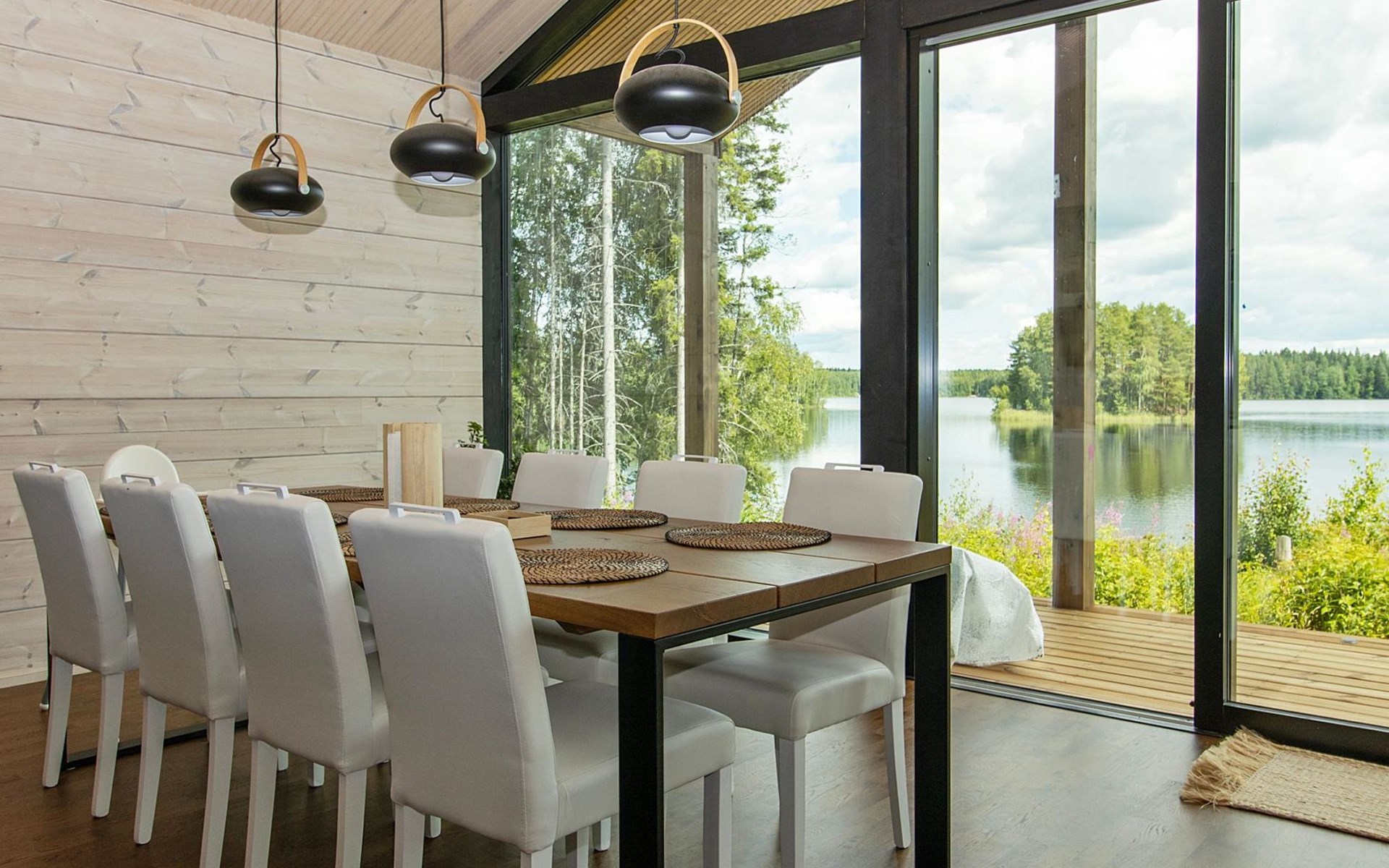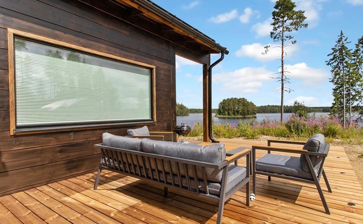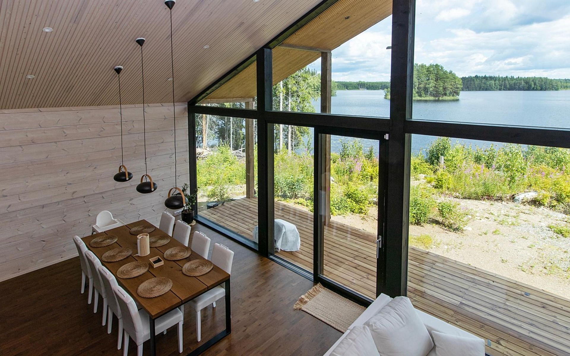 There is a large landscape window which gives a wonderful view of the fishy Lake Sääjärvi. The well-equipped living room and kitchen are open to the ceiling. In addition there are 2 spacious bedrooms on the ground floor. One with double bed (160 cm) and other with bunk bed (2 x 80 cm). Upstairs a large low loft with 2 beds (80 cm). In addition an utility room.