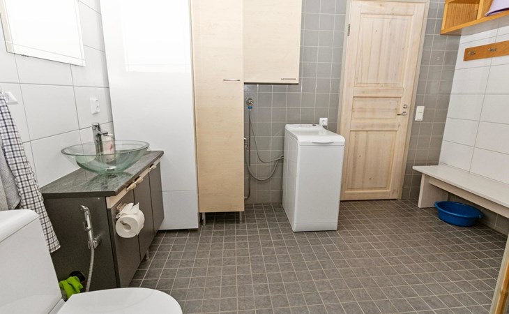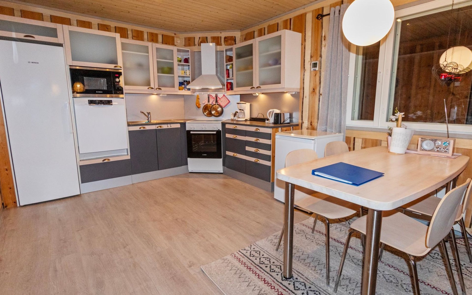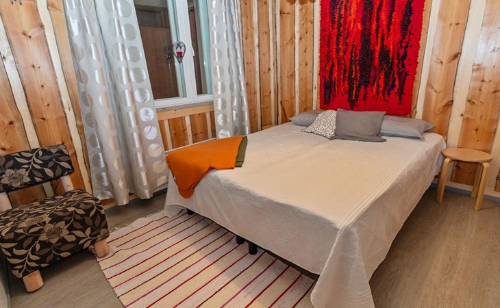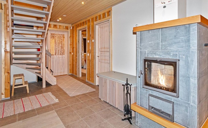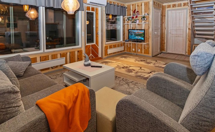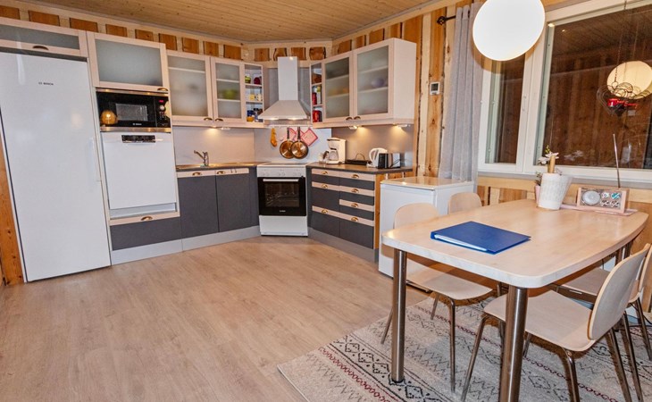 The cabin is situated amidst the traditional scenery of Sevettijärvi village — 419 km north of Kemijärvi and 152 km northeast of Ivalo. With 80 m² of spacious and bright living area, it comfortably accommodates larger groups. The ground floor features a spacious living room/kitchen area, ideal for cooking together and enjoying cozy moments by the fireplace. On the same floor, there are two bedrooms, each with a double bed (160 cm wide). Additionally, there is a sauna, a washroom (with a WC and washing machine), and a separate WC. The stairs lead to an open loft area with sleeping spaces on both sides, each equipped with foldable 80 cm mattresses as extra beds.