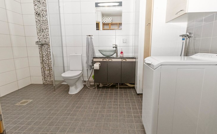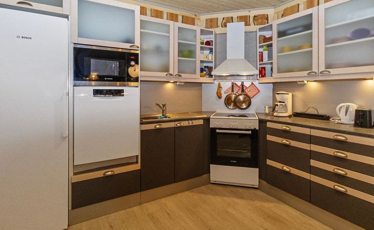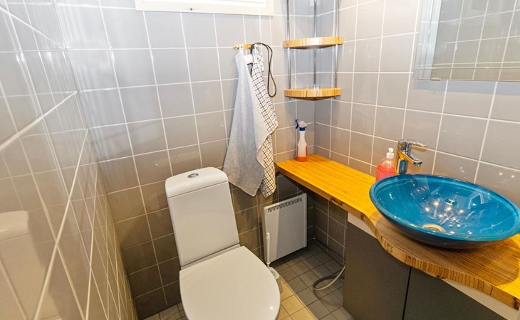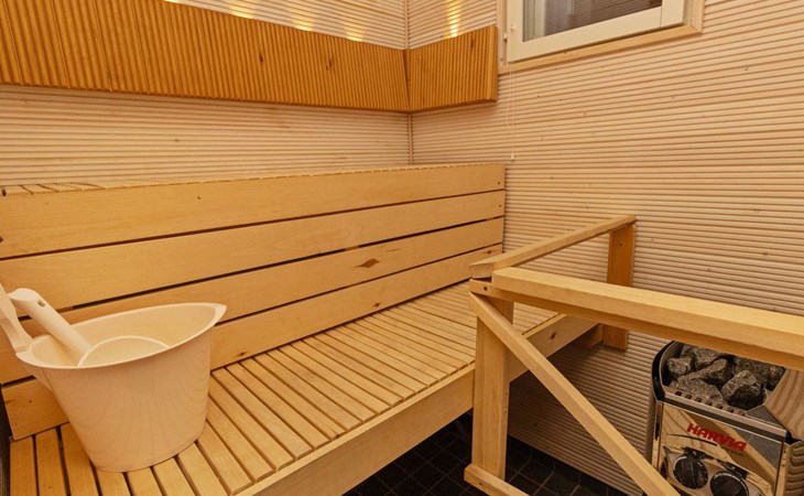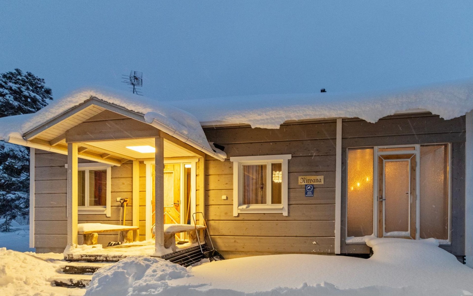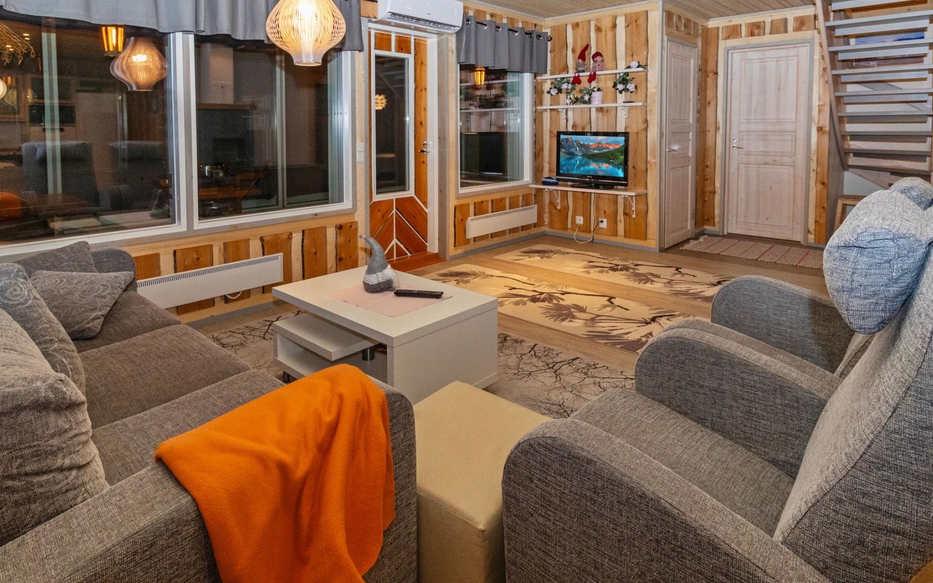 The cabin is situated amidst the traditional scenery of Sevettijärvi village — 419 km north of Kemijärvi and 152 km northeast of Ivalo. With 80 m² of spacious and bright living area, it comfortably accommodates larger groups. The ground floor features a spacious living room/kitchen area, ideal for cooking together and enjoying cozy moments by the fireplace. On the same floor, there are two bedrooms, each with a double bed (160 cm wide). Additionally, there is a sauna, a washroom (with a WC and washing machine), and a separate WC. The stairs lead to an open loft area with sleeping spaces on both sides, each equipped with foldable 80 cm mattresses as extra beds.