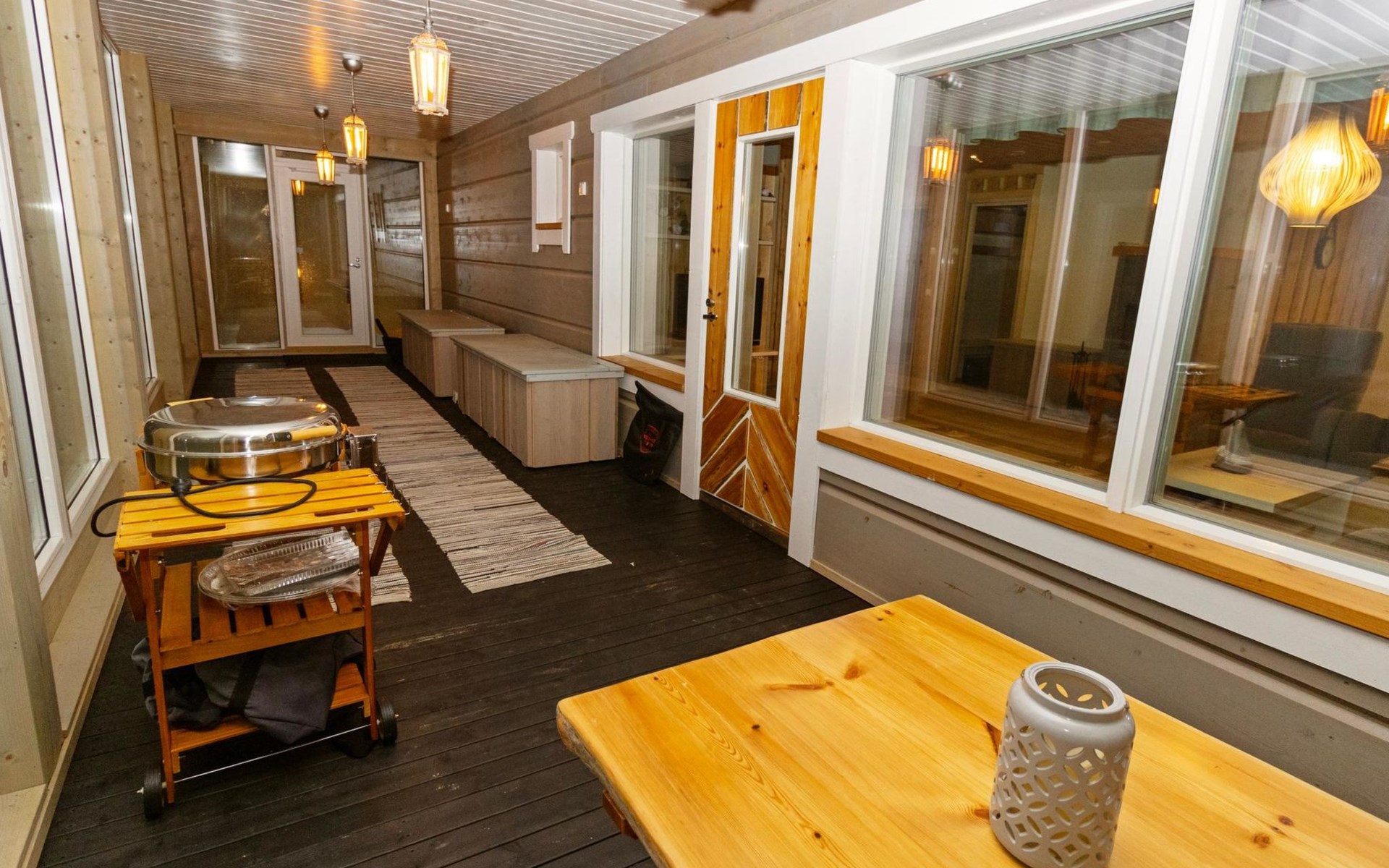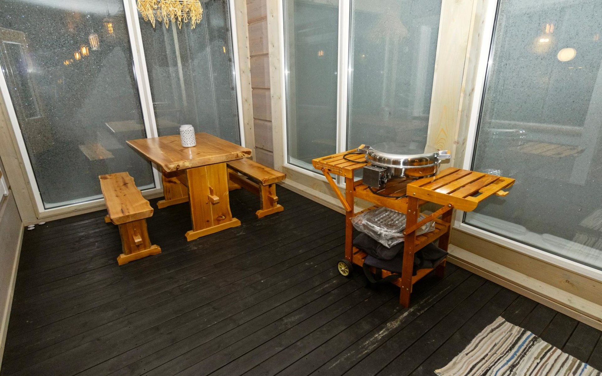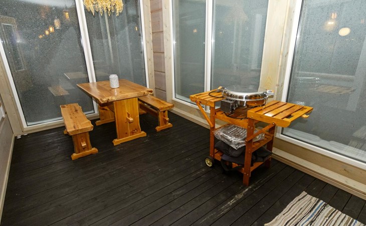 A large covered and glazed terrace spanning the entire cabin's width allows for grilling and outdoor enjoyment in all weather conditions.