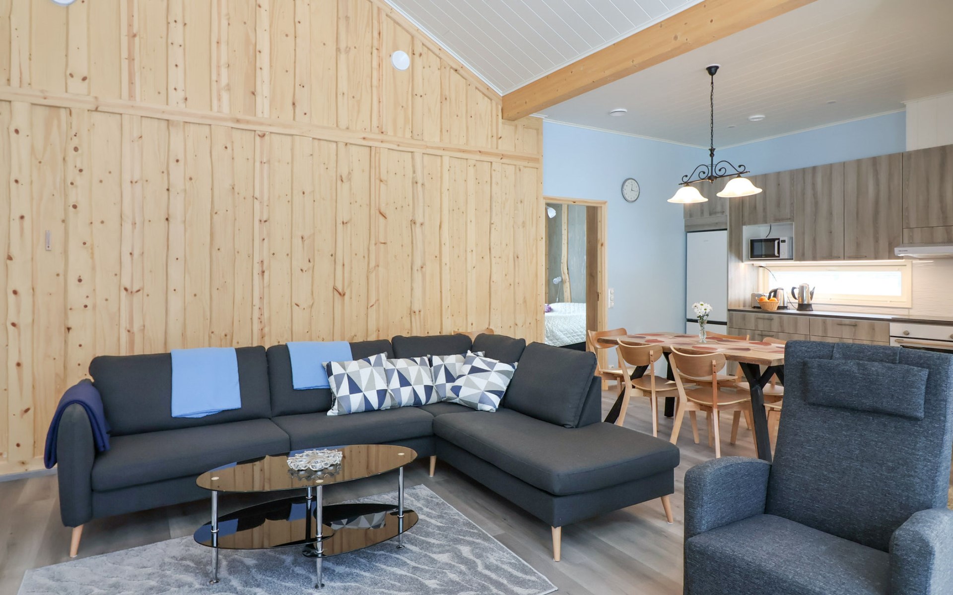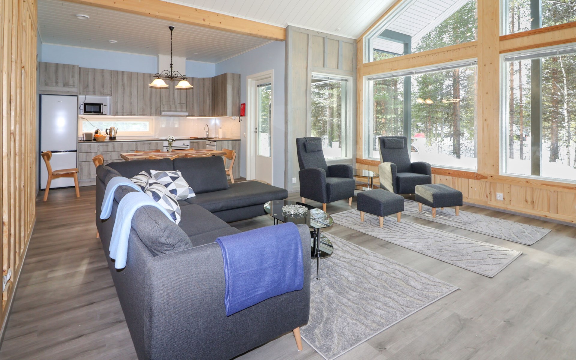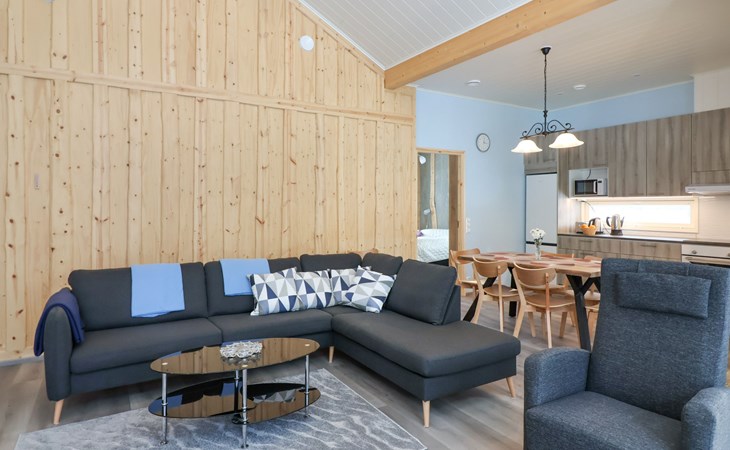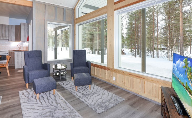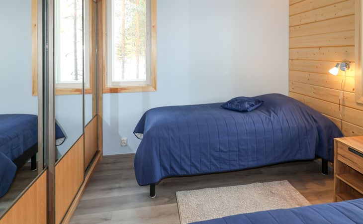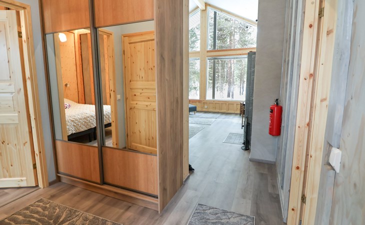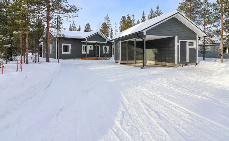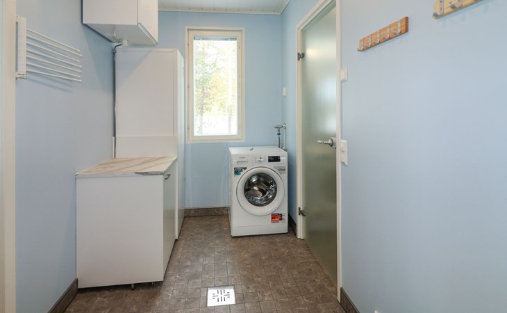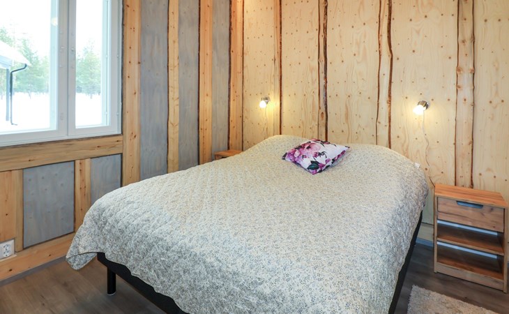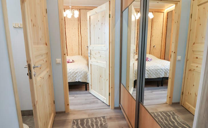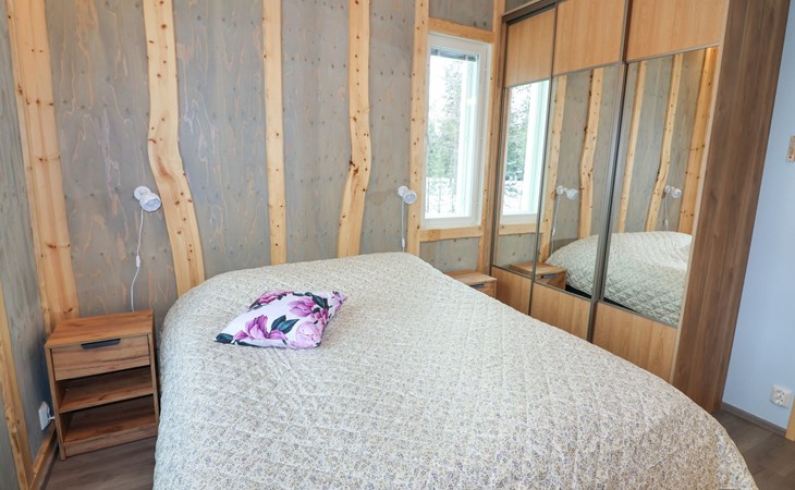 The cabin features a living room/kitchen and three bedrooms, each furnished with two 80 cm wide beds (which can be combined into double beds). There is also a wood-heated sauna, a washroom, a WC, and a utility room that doubles as a dressing room. A ski maintenance room is available for winter sports enthusiasts, equipped with a waxing bench, workspace, and shelves. Firewood for normal use is included in the rental price; additional firewood can be ordered from the owner for an extra fee. The cabin features an open porch, a partially covered terrace, and a carport.