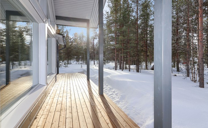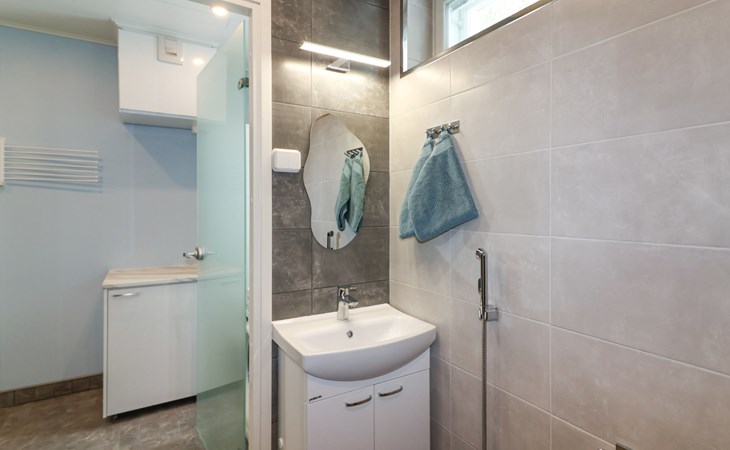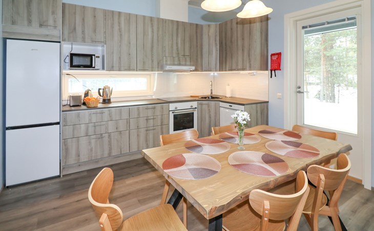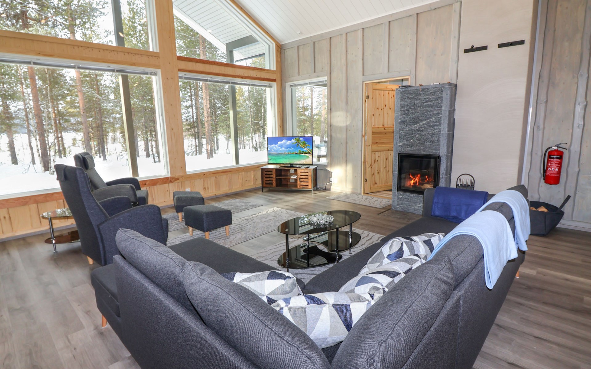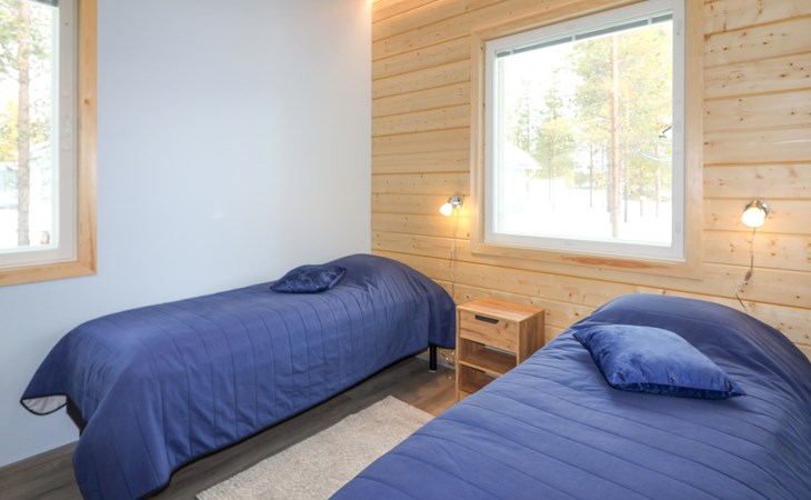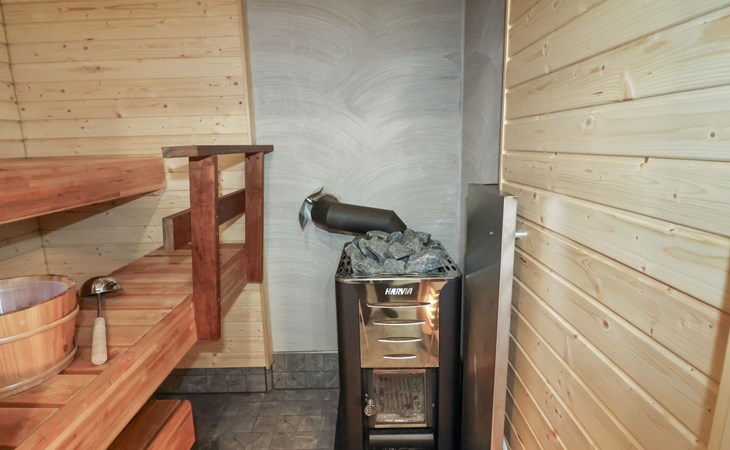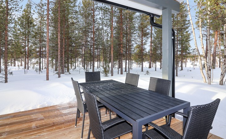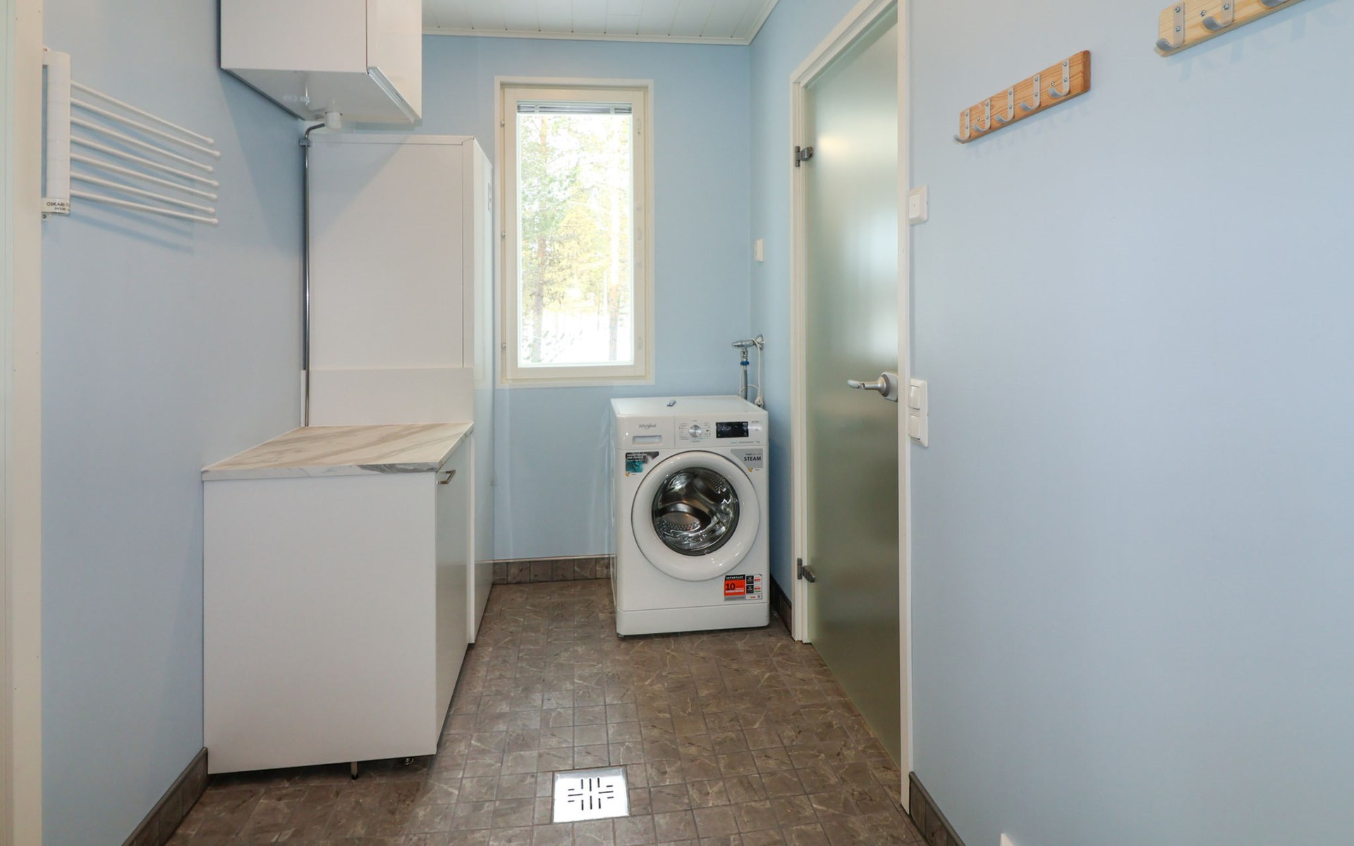 The cabin features a living room/kitchen and three bedrooms, each furnished with two 80 cm wide beds (which can be combined into double beds). There is also a wood-heated sauna, a washroom, a WC, and a utility room that doubles as a dressing room. A ski maintenance room is available for winter sports enthusiasts, equipped with a waxing bench, workspace, and shelves. Firewood for normal use is included in the rental price; additional firewood can be ordered from the owner for an extra fee. The cabin features an open porch, a partially covered terrace, and a carport.