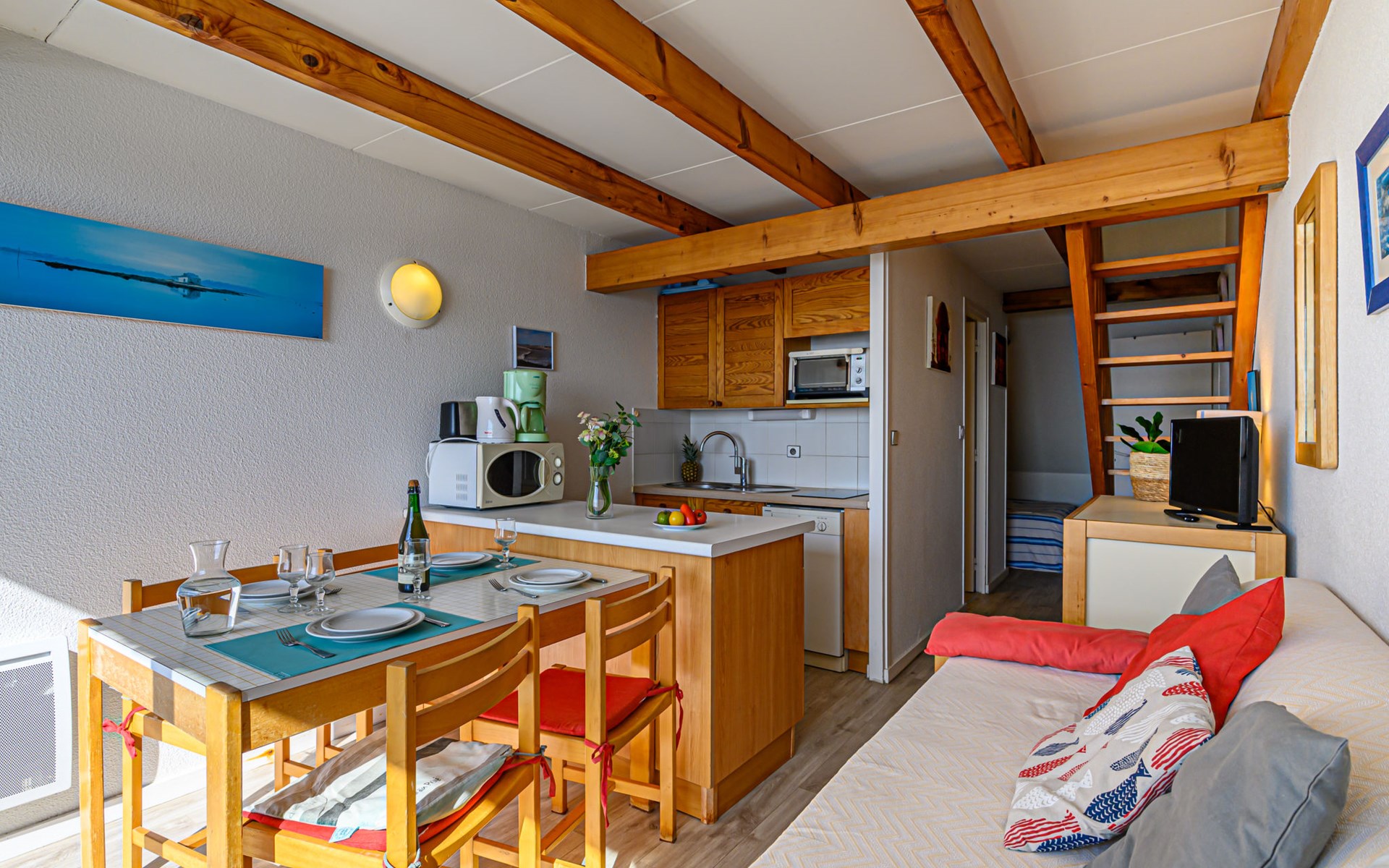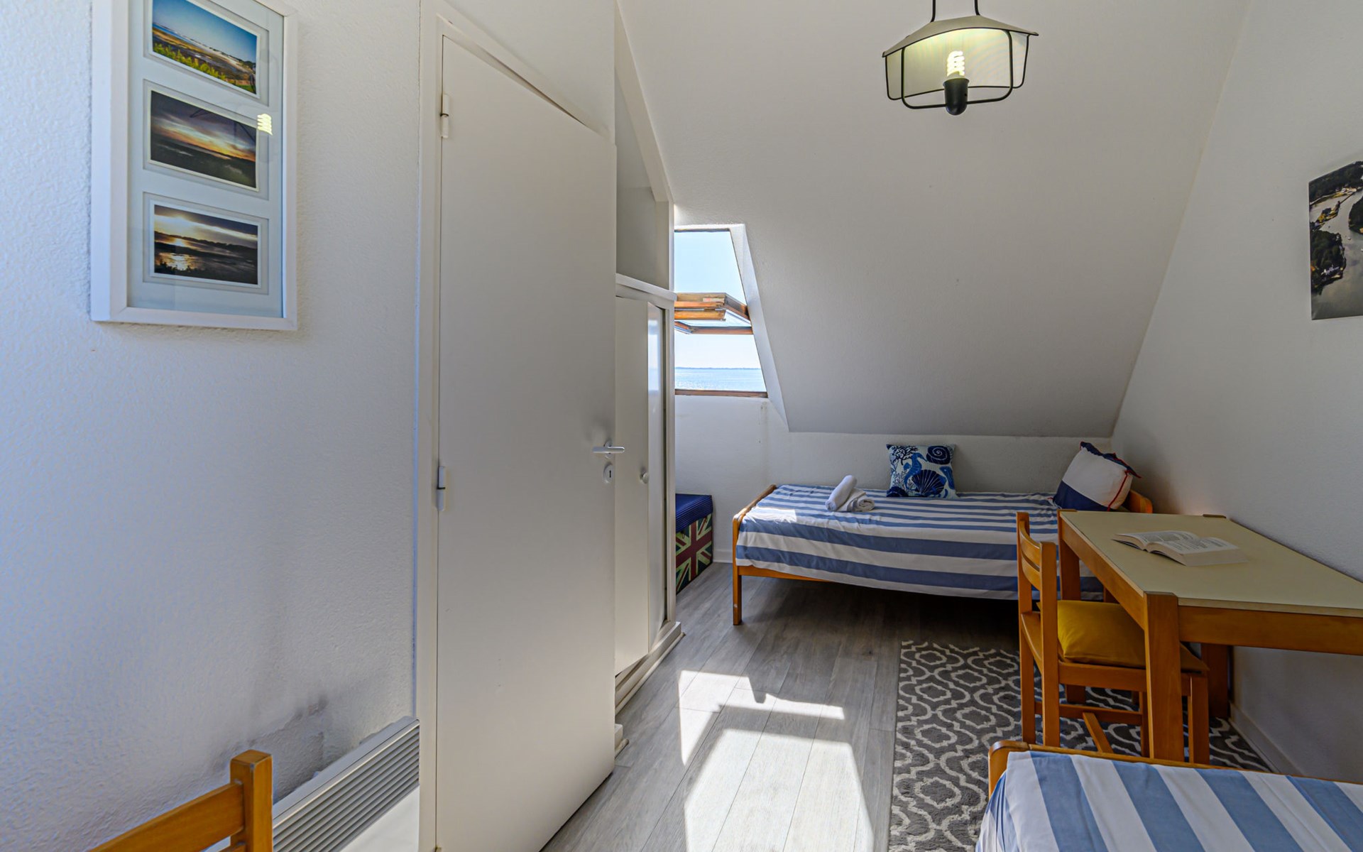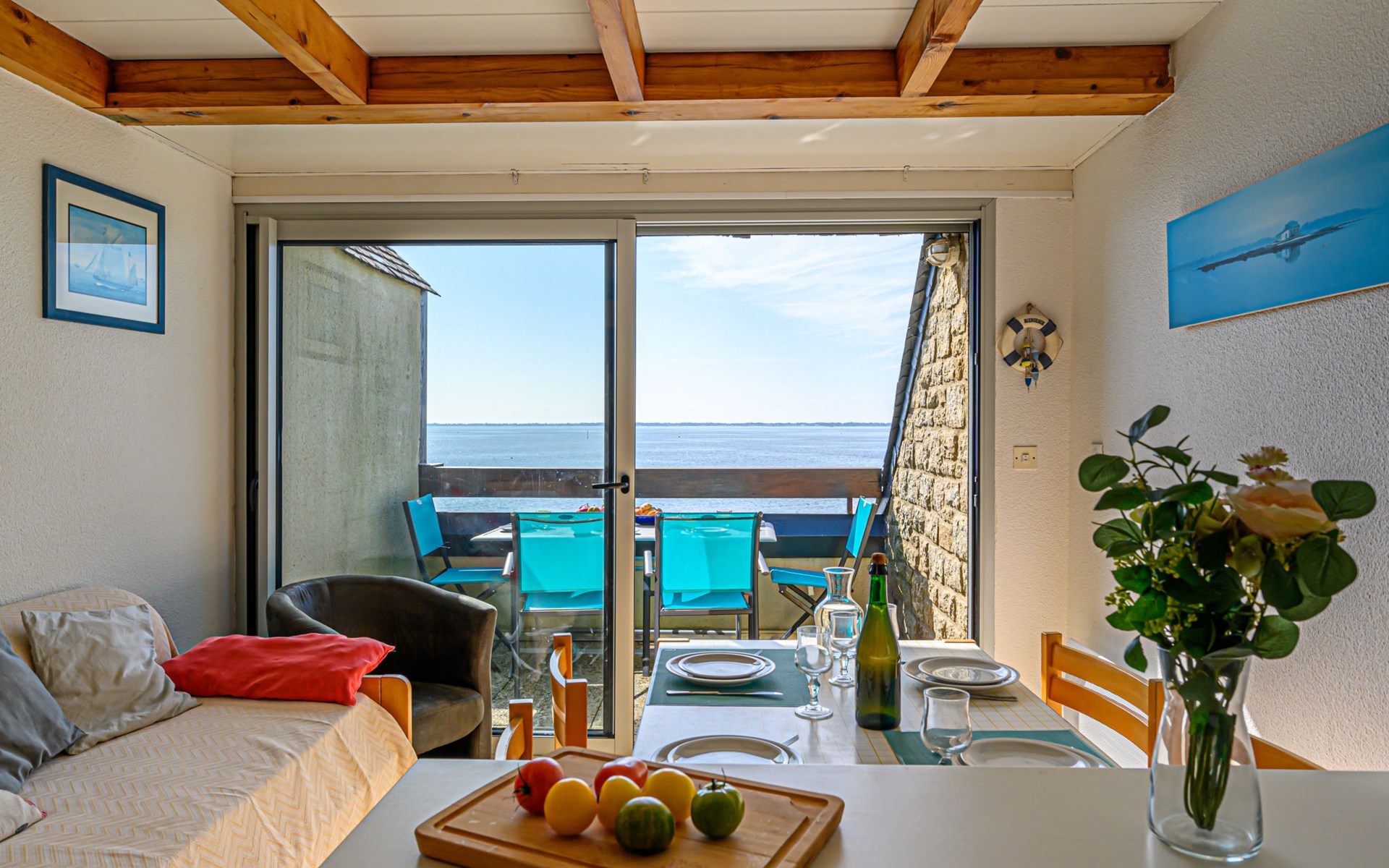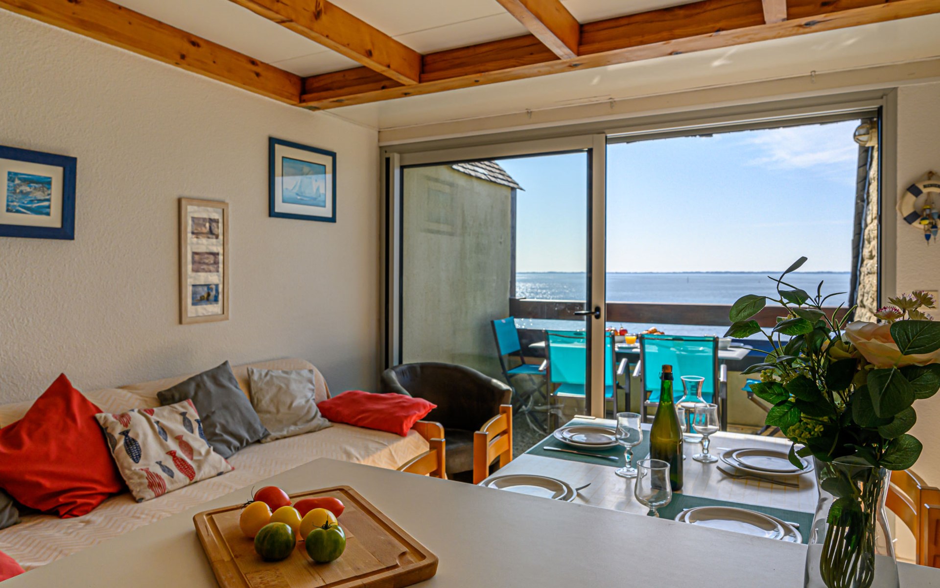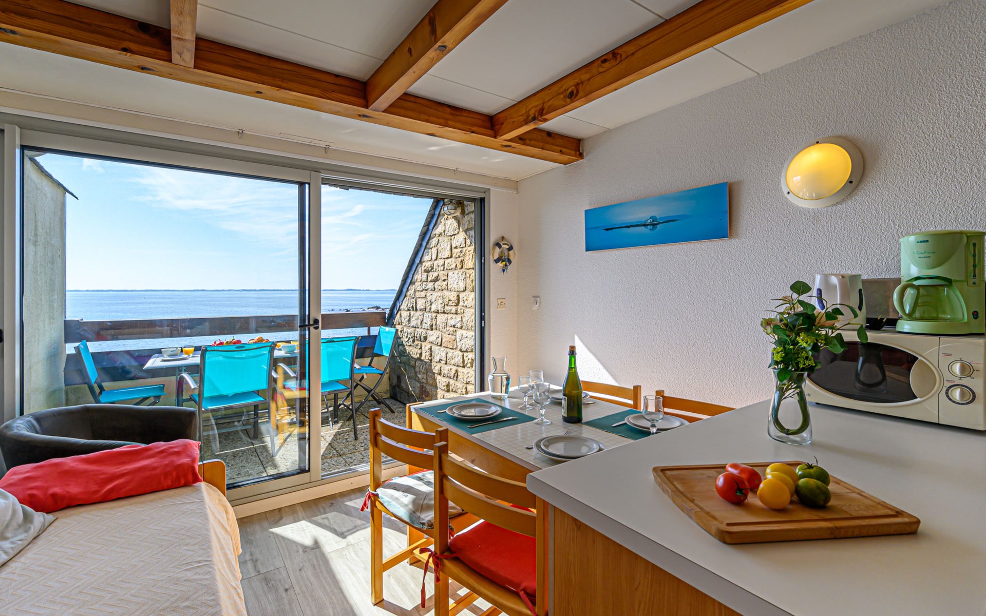 Appartementhaus "Plein Océan", auf 2 Stockwerken. Im Ort, 1.5 km vom Zentrum von Carnac Plage, ruhige, sonnige Lage in einem Wohnquartier, 10 m vom Meer, 50 m vom Strand, direkter Zugang zum Strand. Parkplatz (beschränkte Anzahl), öffentliche Parkplätze auf der Strasse. Supermarkt 1 km, Restaurant 1 km, Zentrum zu Fuss in 15 Minuten erreichbar, Sandstrand "Grande plage de Carnac" 50 m, Tauchzentrum 2 km, Thermalbad "Thalassothérapie Thalazur" 1.7 km. Sporthafen 4 km, Golfplatz (18 Loch) 10 km, Segelschule 1.5 km, Tennis 500 m. Nahe gelegene Sehenswürdigkeiten: Les Alignements de Carnac 2 km, La Trinité sur Mer 4 km, Presqu'île de Quiberon 20 km, Vannes 35 km, Lorient 45 km, Belle île en Mer, Houat, Hoedic. Wandergebiete: Le Golfe du Morbihan. Objekt geeignet für 3 Erwachsene.