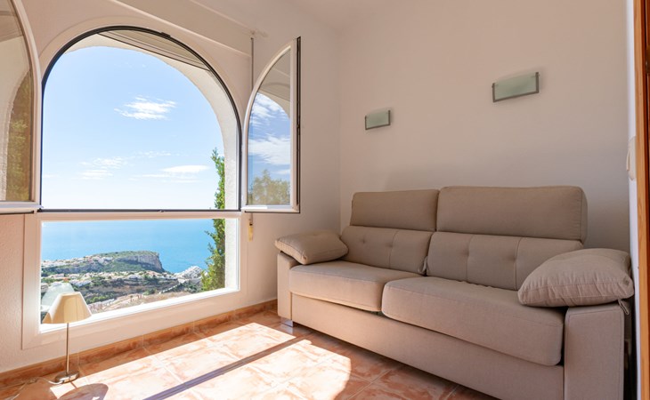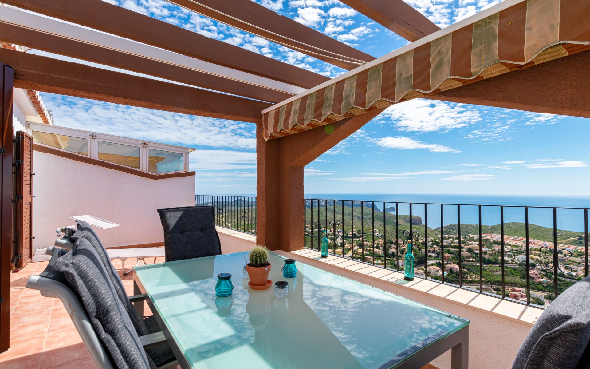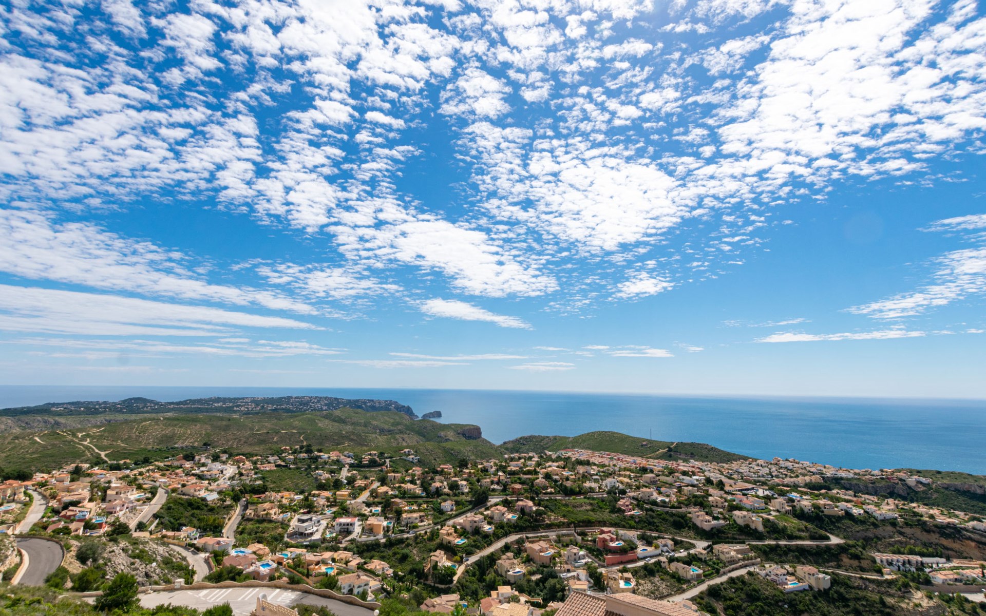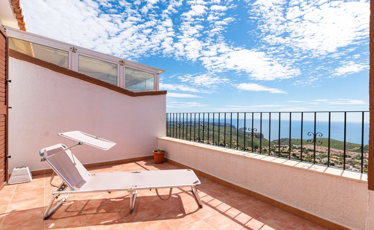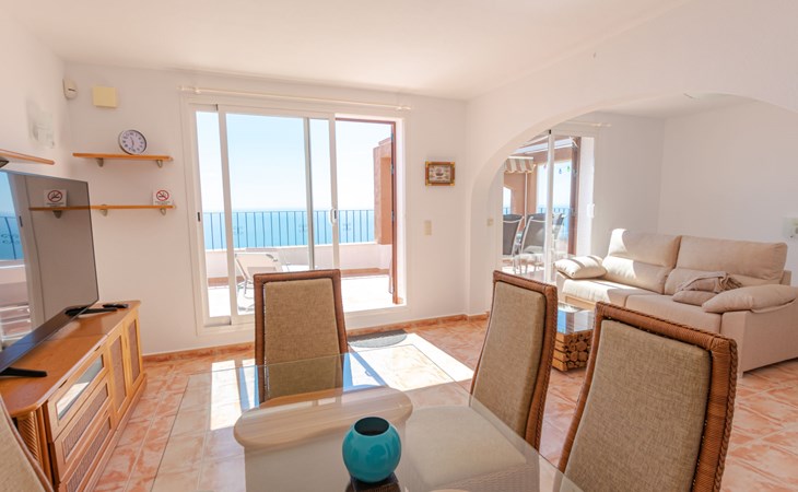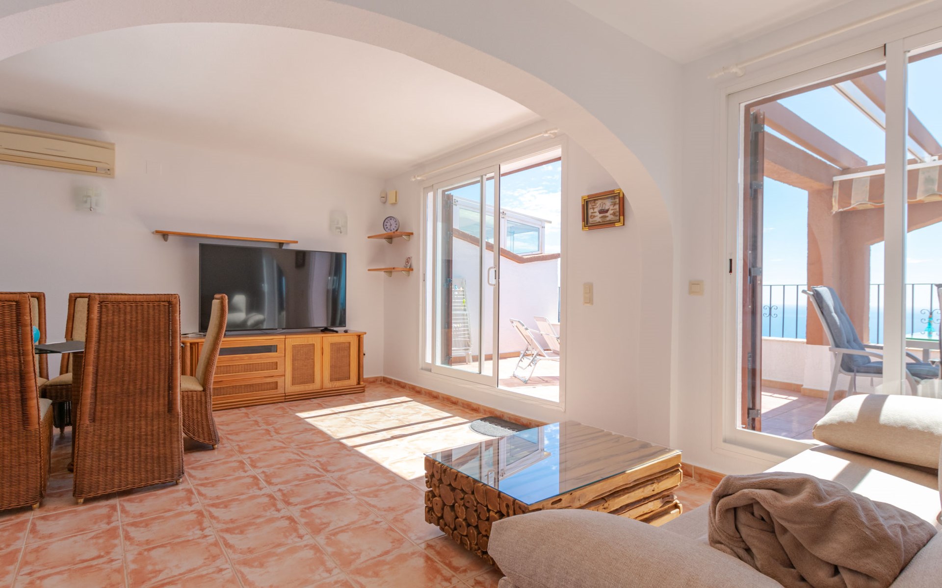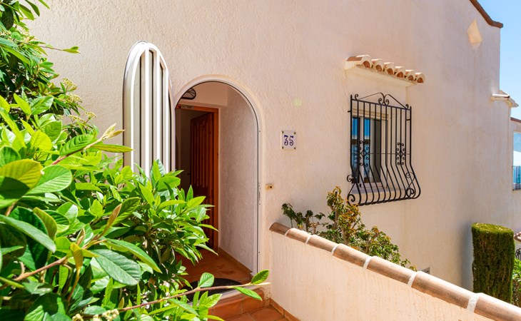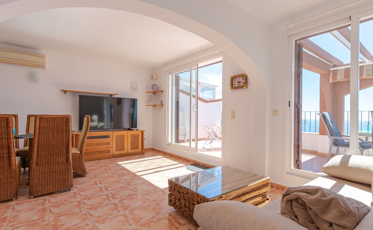 Benitachell: Feriensiedlung "Vista Mar", Baujahr 2008. Im Ortsteil Cumbre del Sol, ruhige, sonnige, erhöhte Lage, 3 km vom Meer. Zur Mitbenutzung: 2 Schwimmbäder (saisonale Verfügbarkeit: 01.Mar. - 30.Nov.) mit Innentreppe. Kinderbecken, Aussendusche, öffentliche Parkplätze auf der Strasse. Supermarkt 1 km, Einkaufszentrum 2 km, Restaurant 2 km, Bushaltestelle 6 km, Sandstrand "Arenal" 7 km, Badebucht 3 km. Bitte beachten: Fahrzeug empfohlen, kein Fahrstuhl vorhanden. Der Besitzer akzeptiert keine Jugendgruppen.